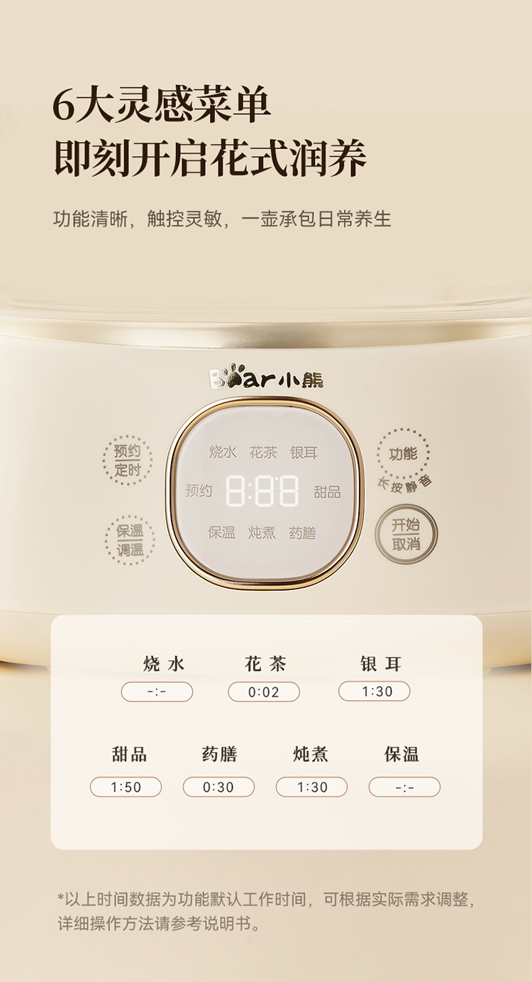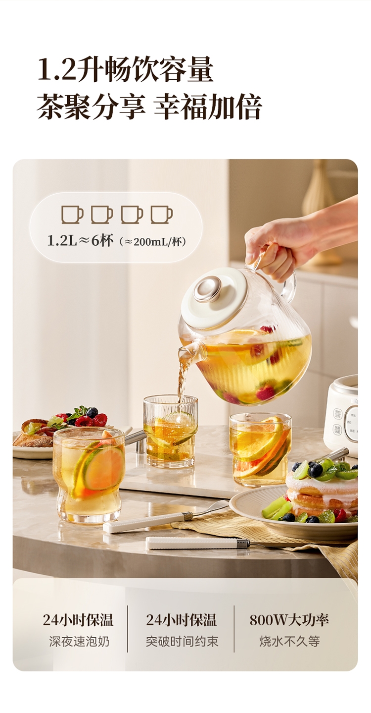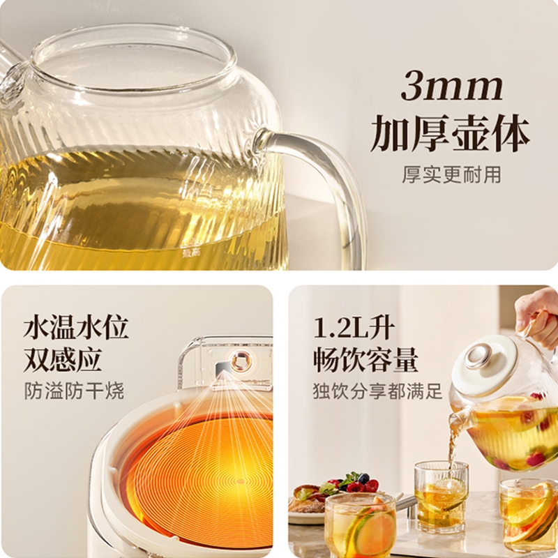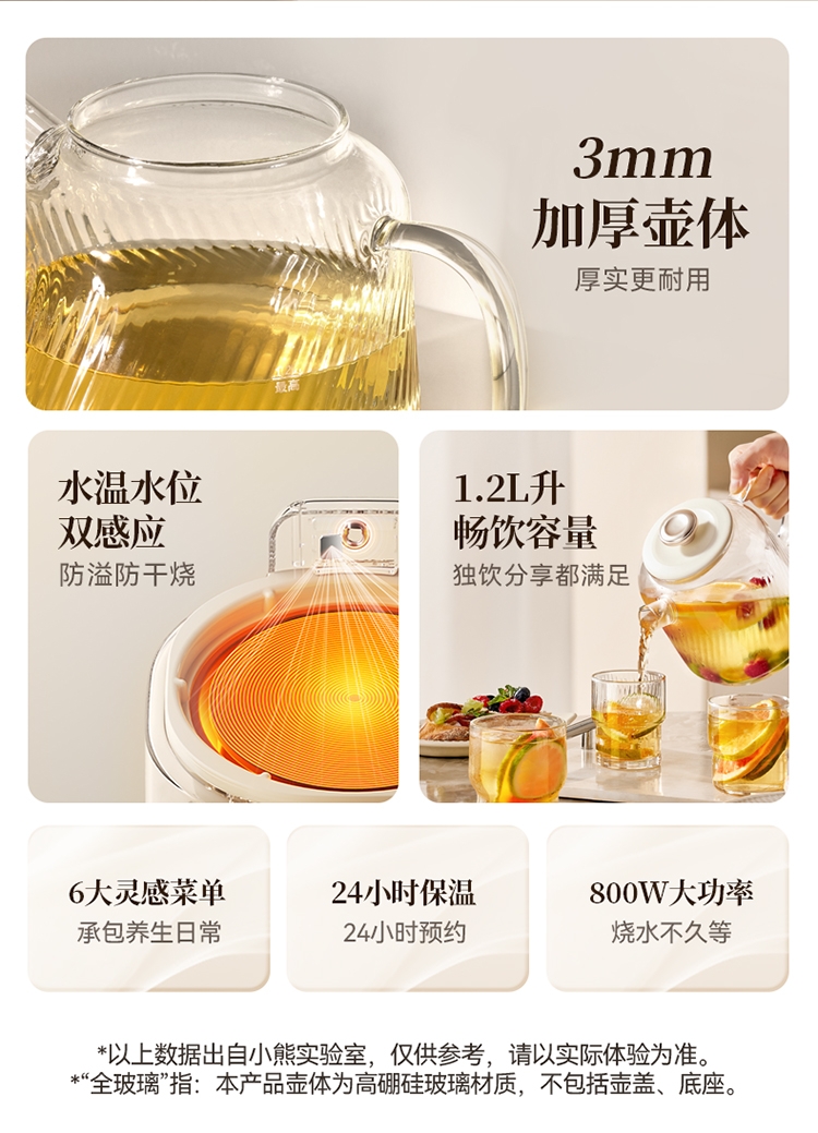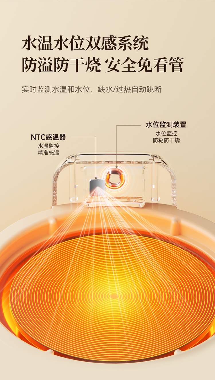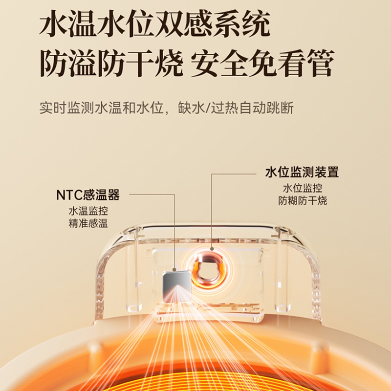 3mm加厚壶体,厚实更耐用,0胶水,0涂层,0金属;水温水位双感应,防溢防干烧;24小时保温,24小时预约