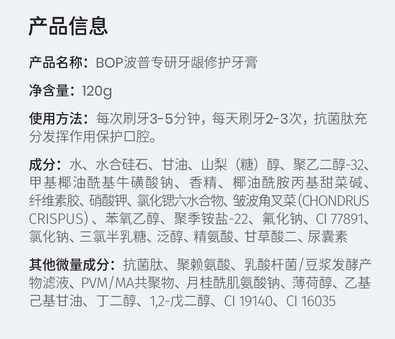 功能:牙龈护理,清洁,口腔抑菌,清新口气,抗敏感