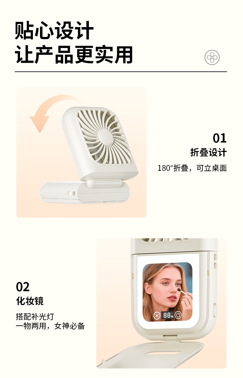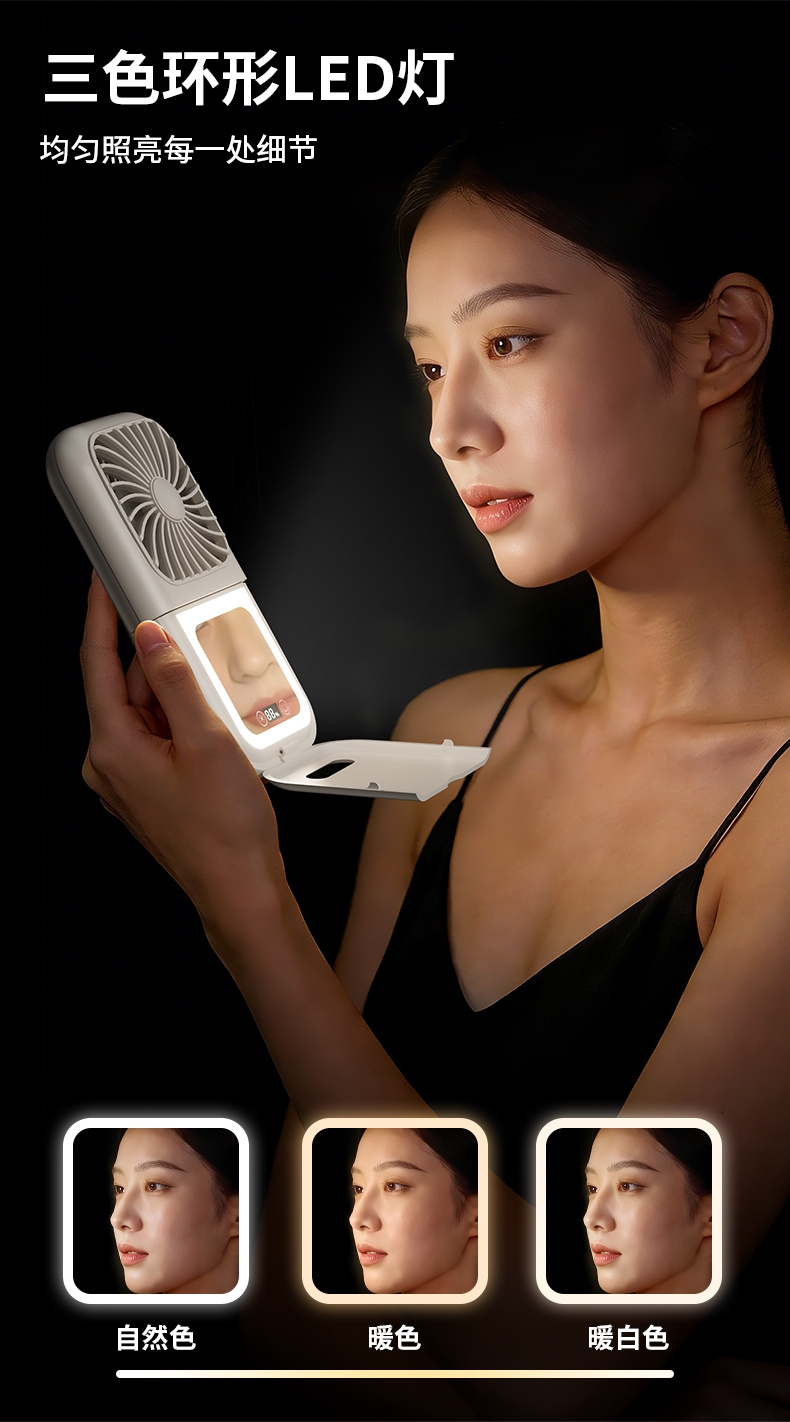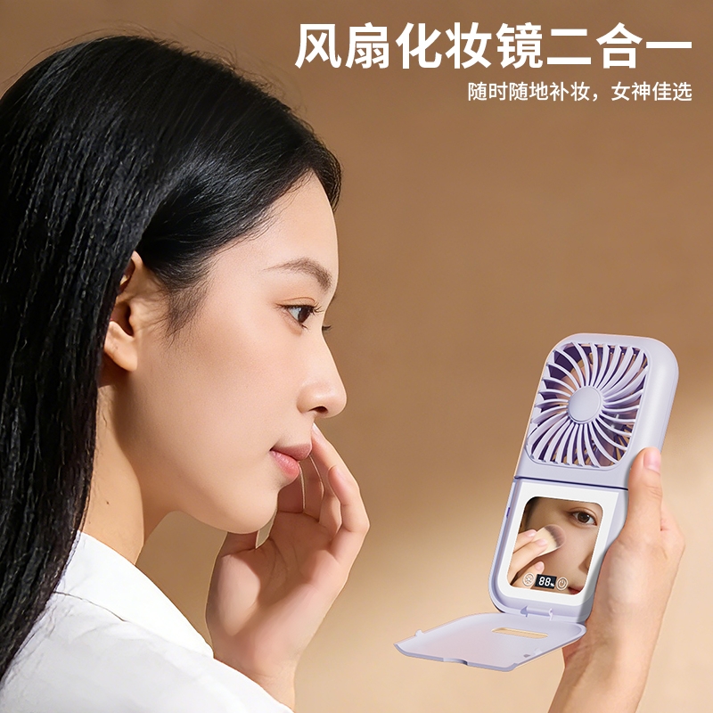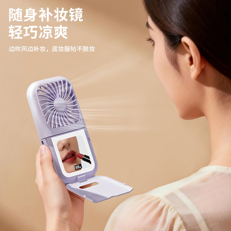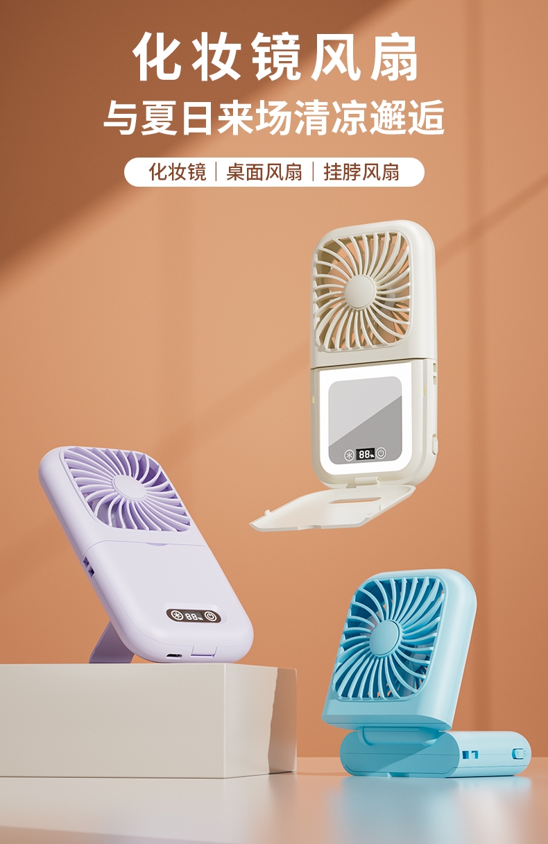 集化妆镜、桌面风扇、挂脖风扇于一体;配备 LED 数显屏,实时显示电量与风速;自带可折叠支架,可立在桌面当桌面风扇
