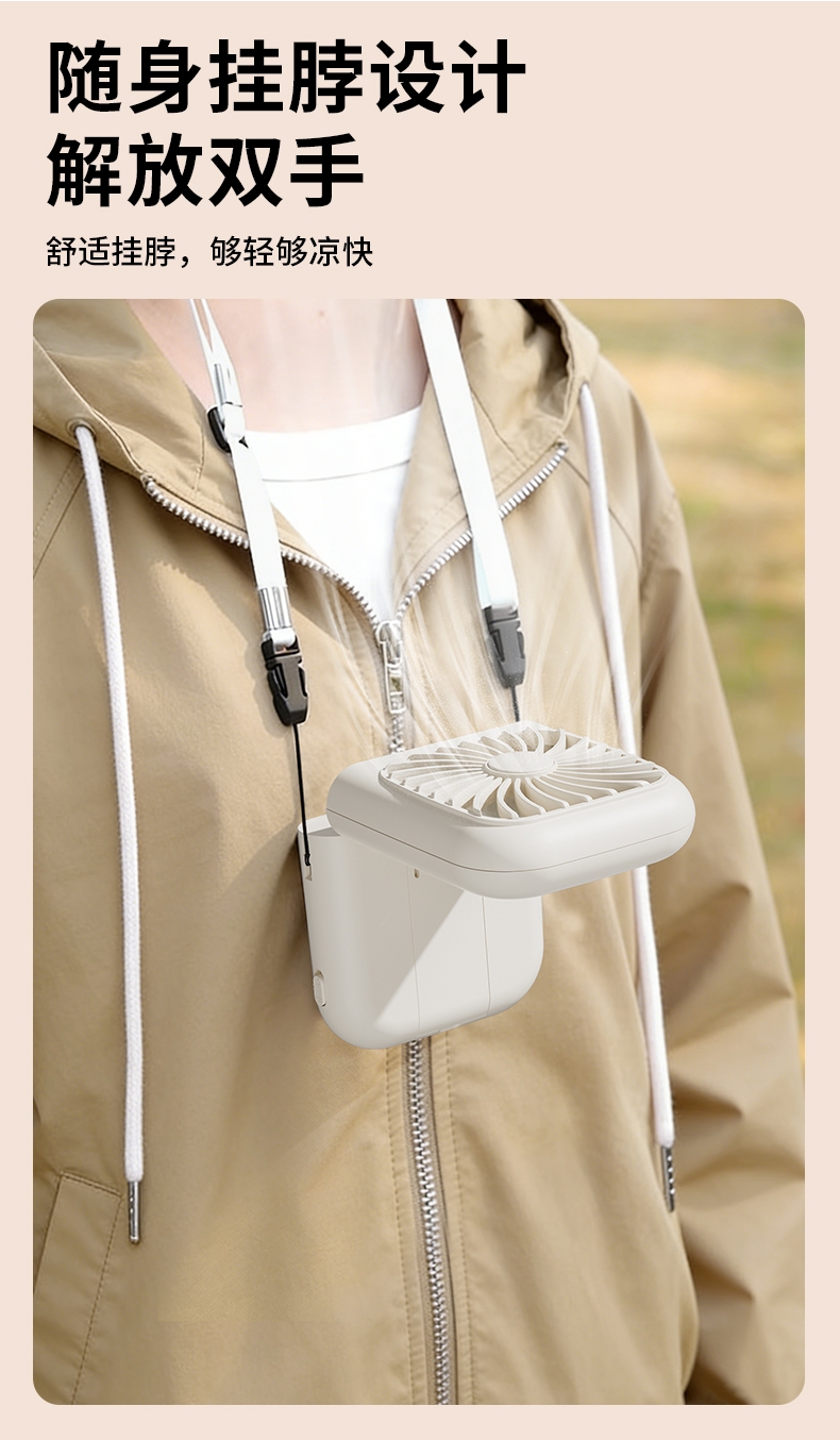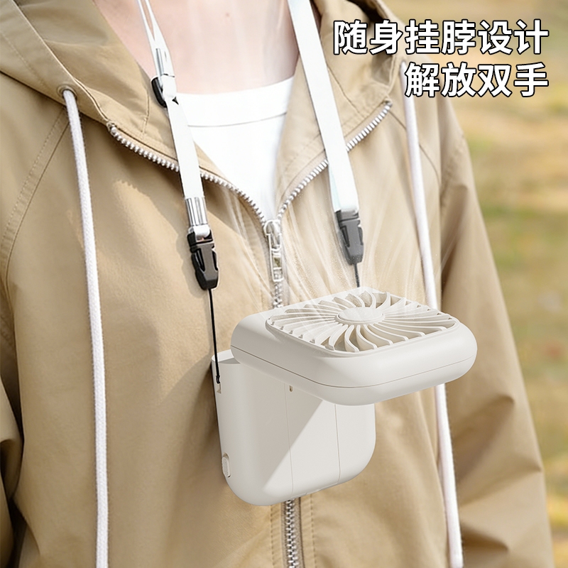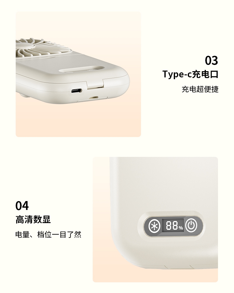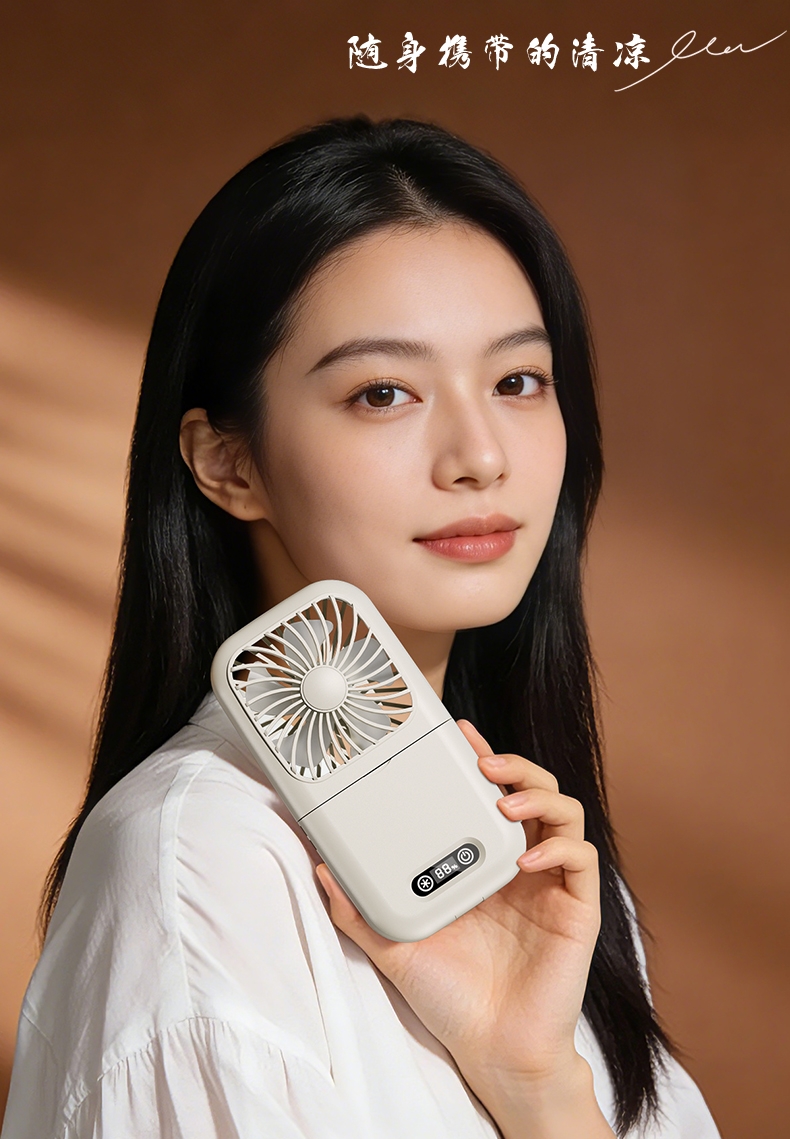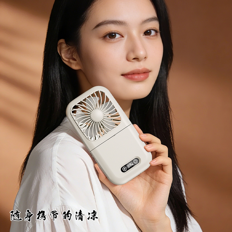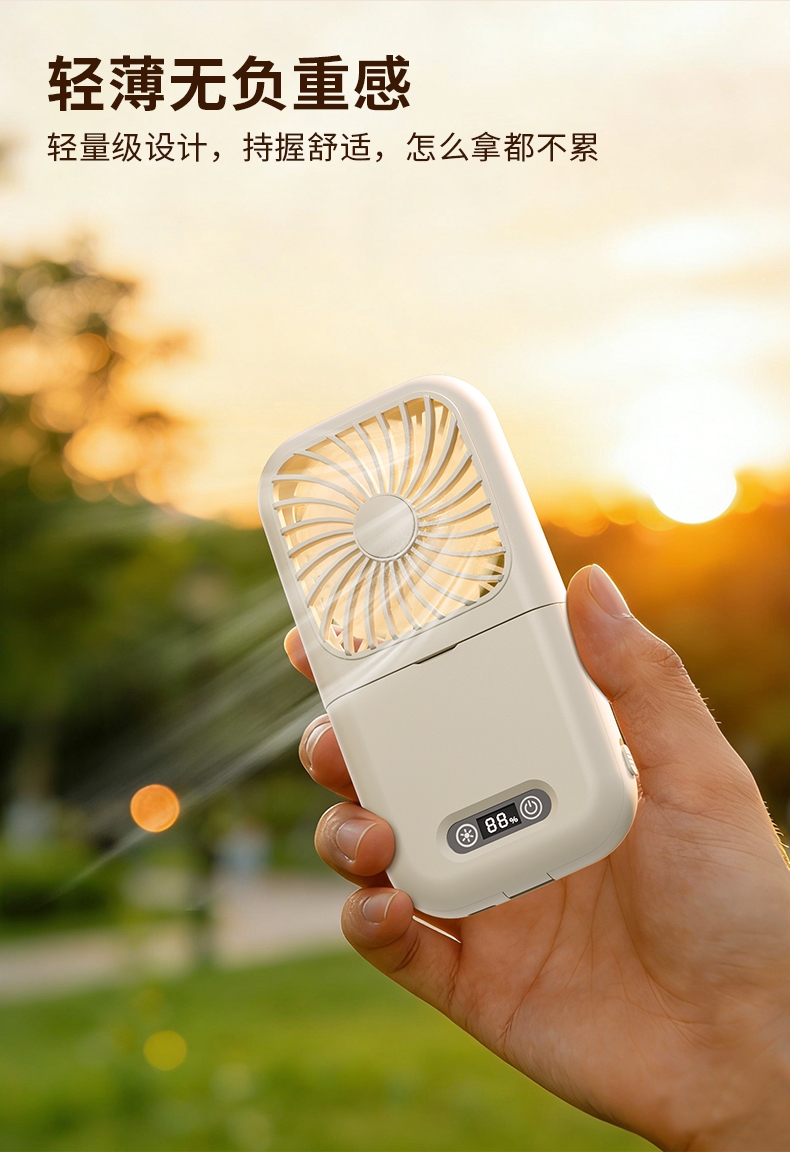 集化妆镜、桌面风扇、挂脖风扇于一体;配备 LED 数显屏,实时显示电量与风速;自带可折叠支架,可立在桌面当桌面风扇