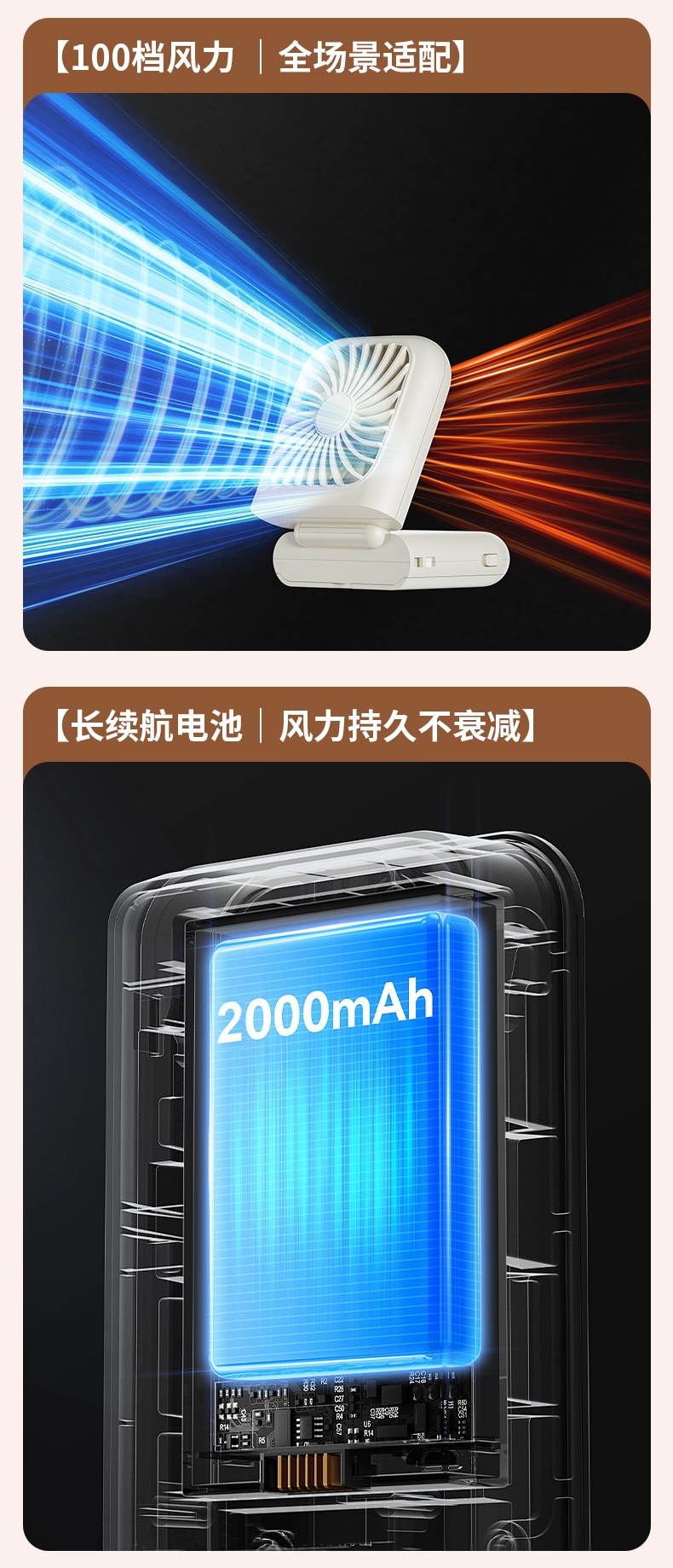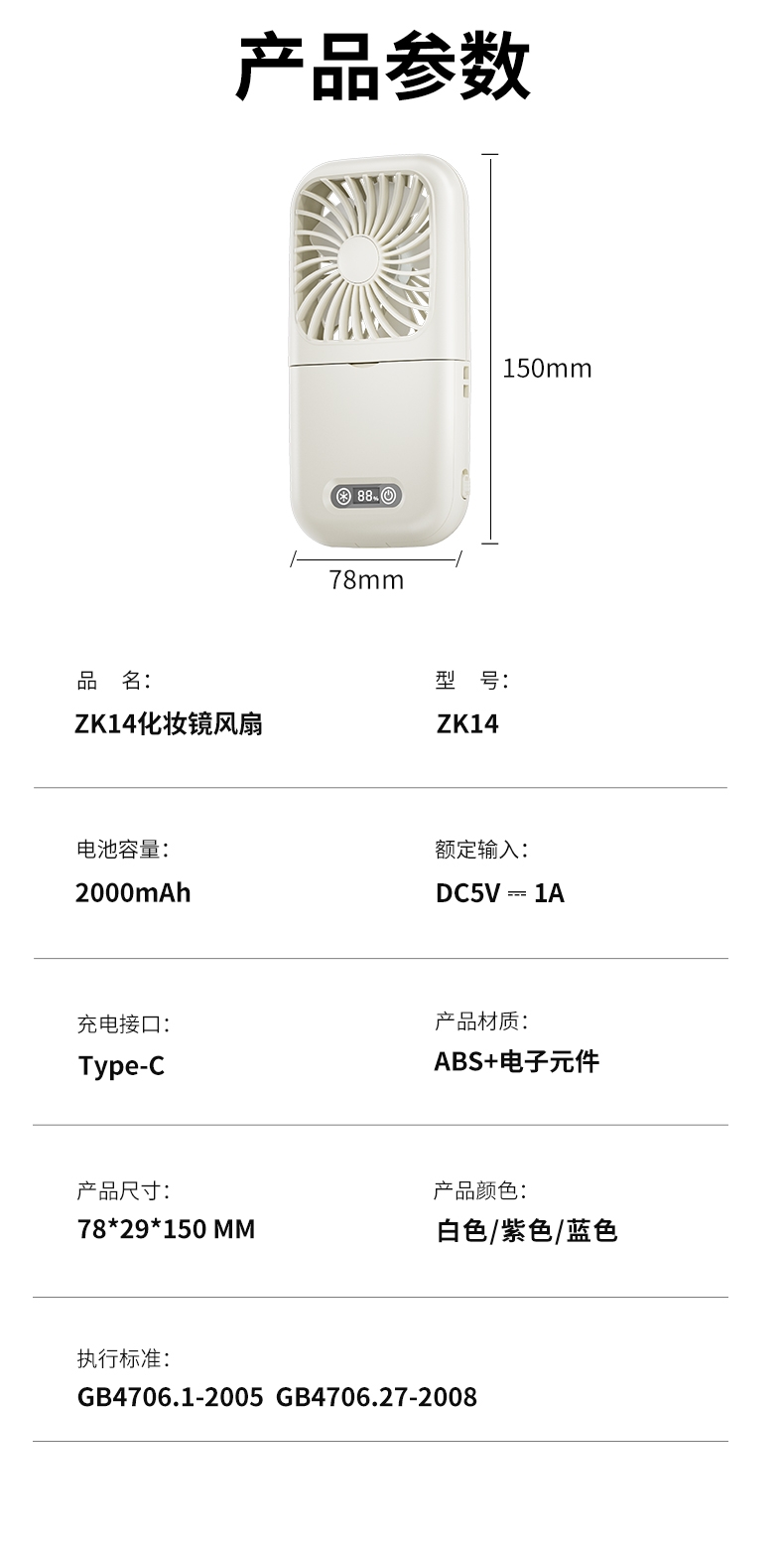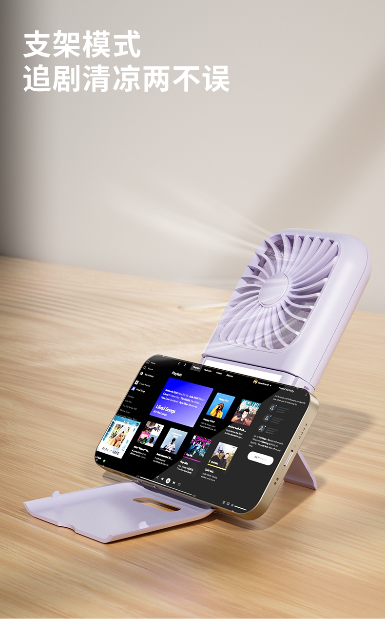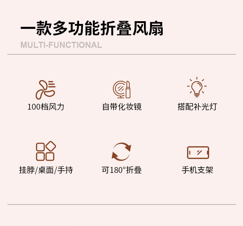 集化妆镜、桌面风扇、挂脖风扇于一体;配备 LED 数显屏,实时显示电量与风速;自带可折叠支架,可立在桌面当桌面风扇