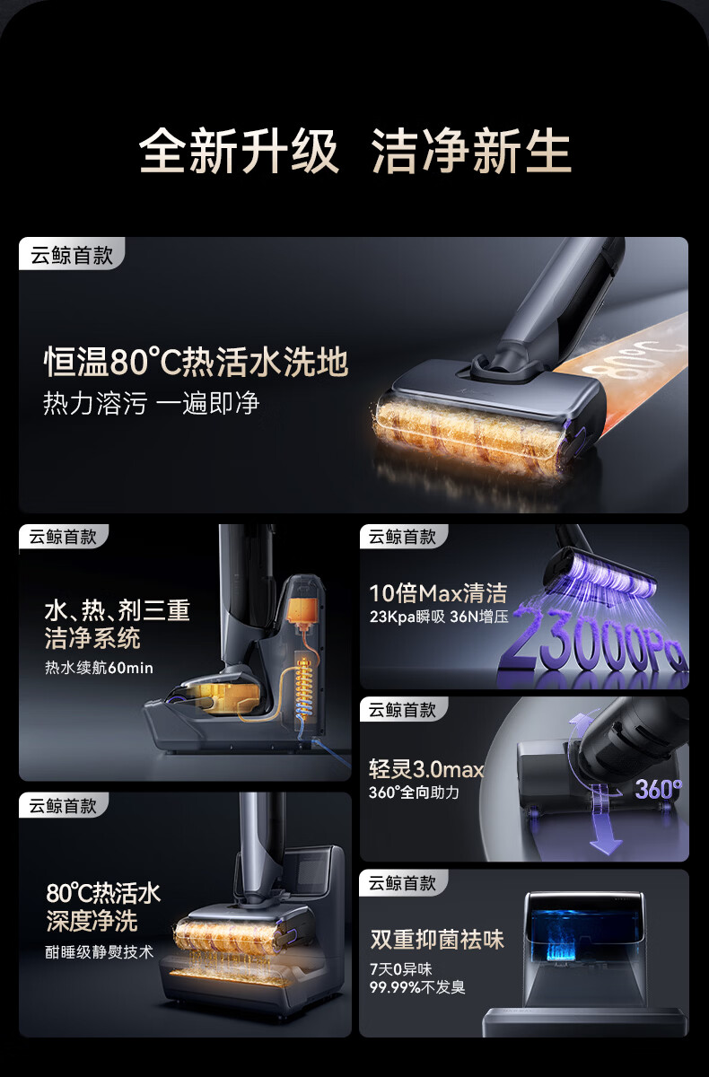 80°C热活水深度净洗;轻灵3.0max360°全向助力;双重抑菌祛味