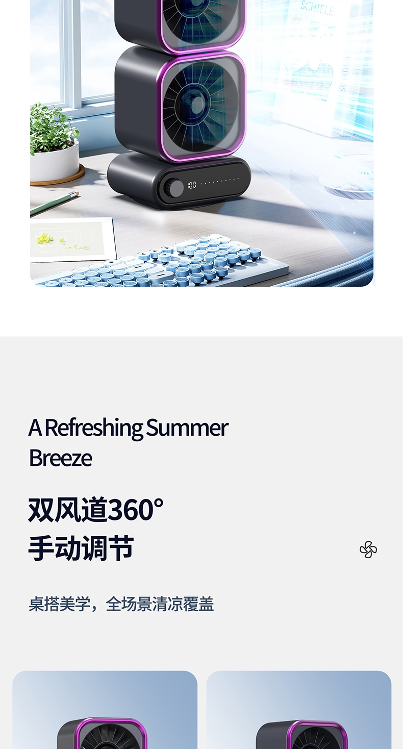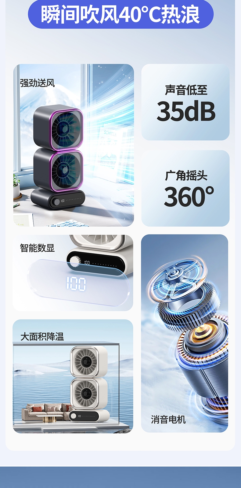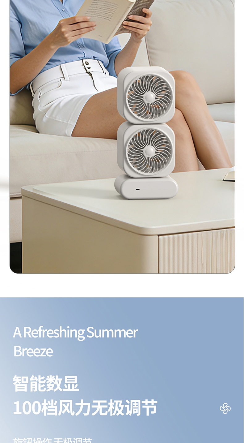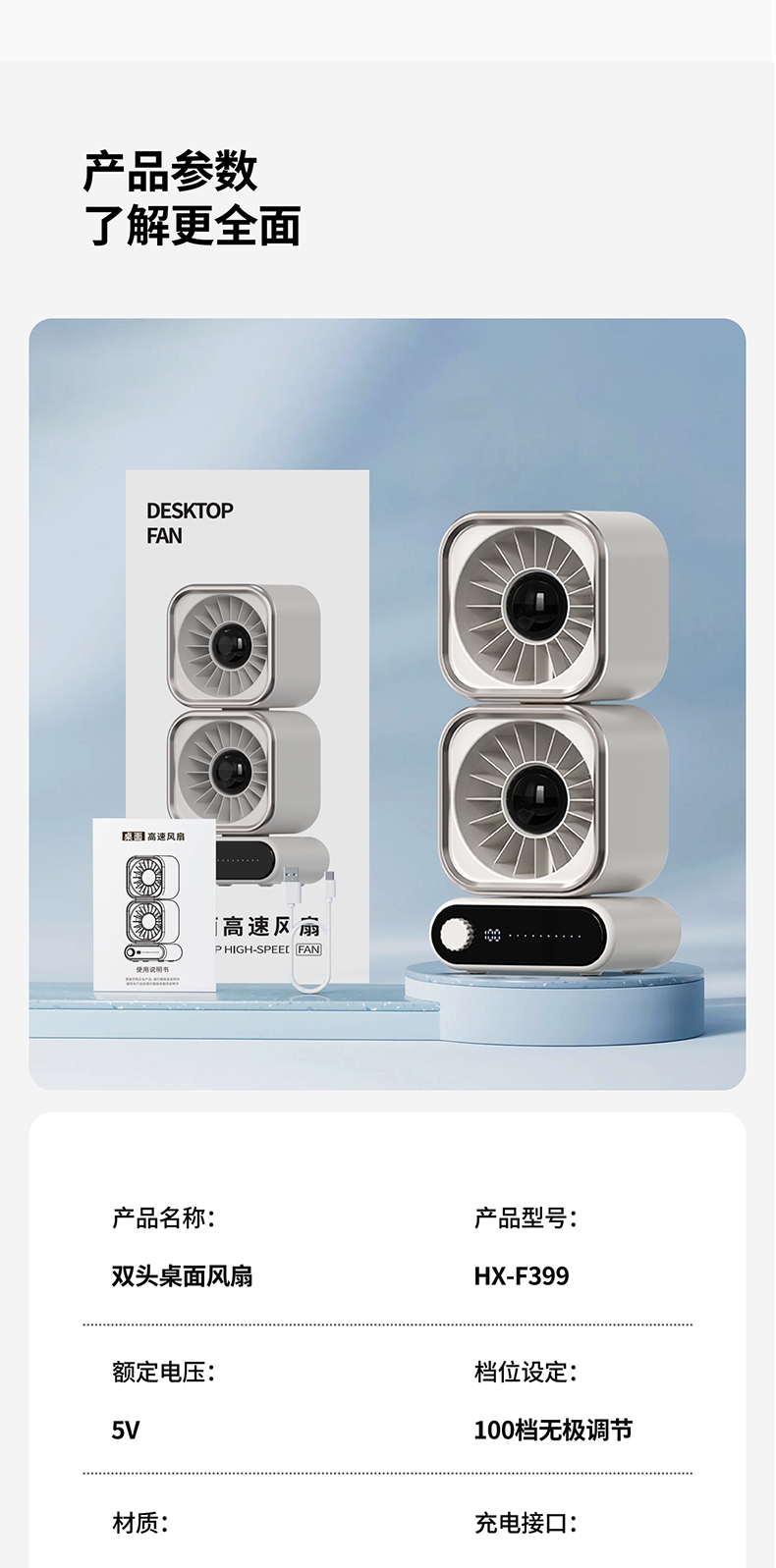 100档风力,旋钮无极调节;自动摇头,双头多角度送风,满足不同需求;模拟自然风,安静舒适,桌面好物