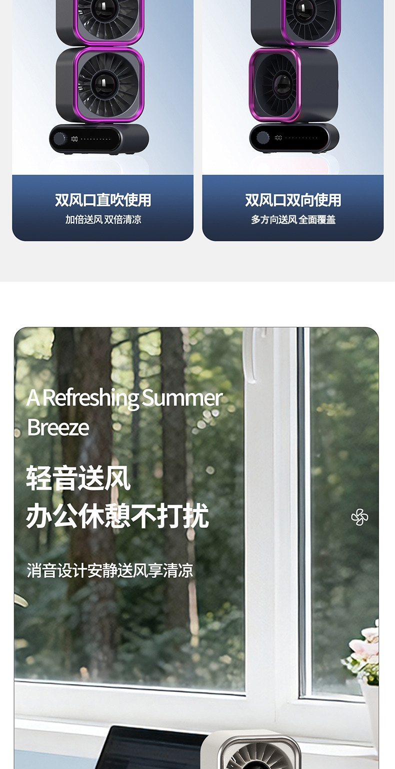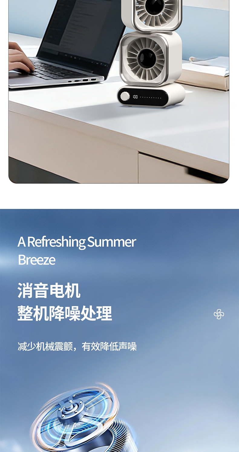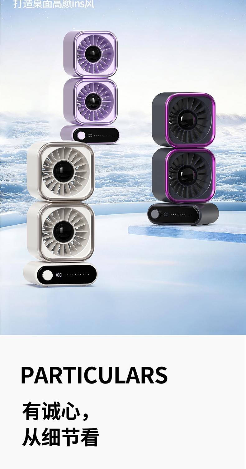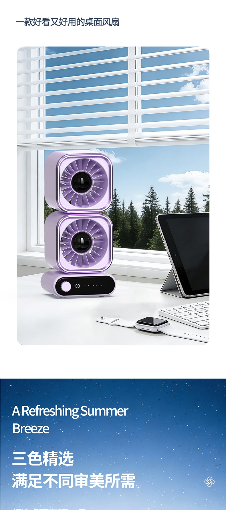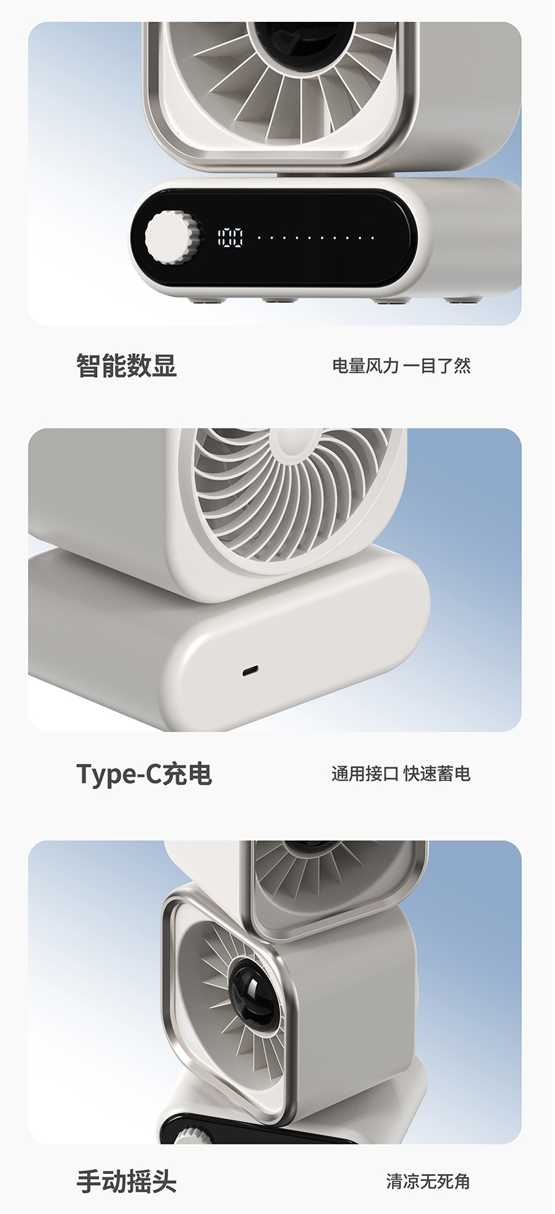 100档风力,旋钮无极调节;自动摇头,双头多角度送风,满足不同需求;模拟自然风,安静舒适,桌面好物