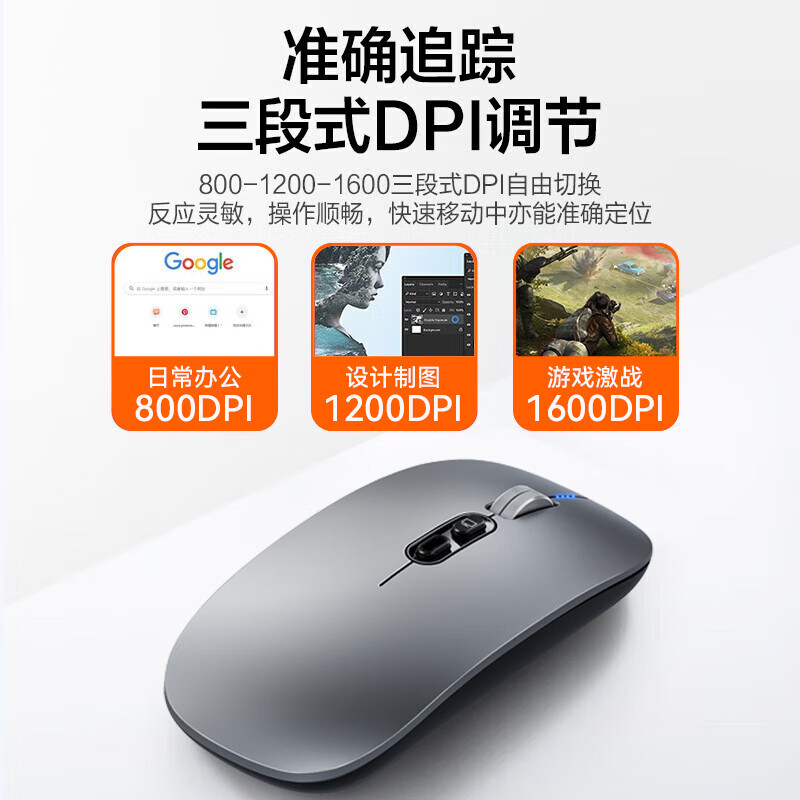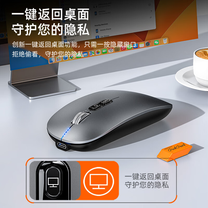 高灵敏度 一键返回桌面; 轻音按键 四档电量显示 ;金属滑动滚轮