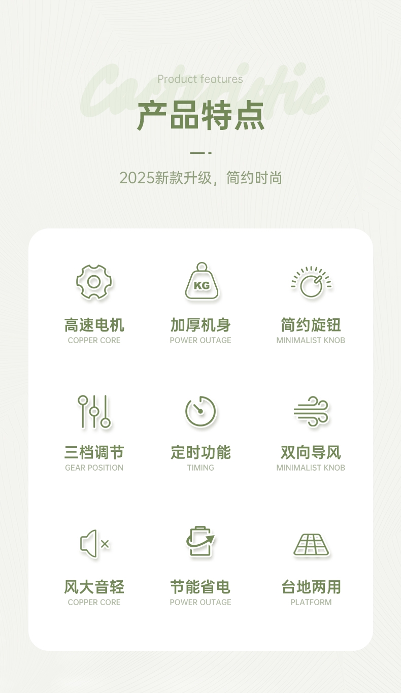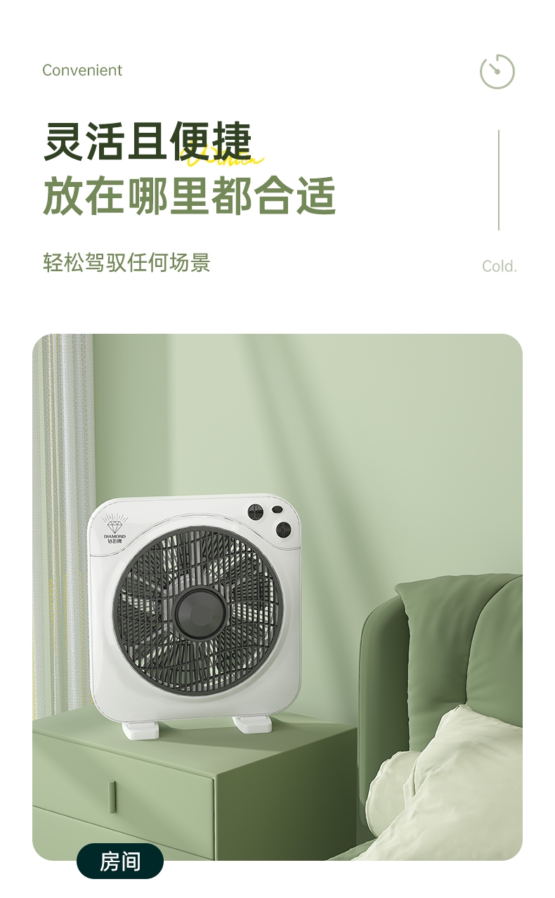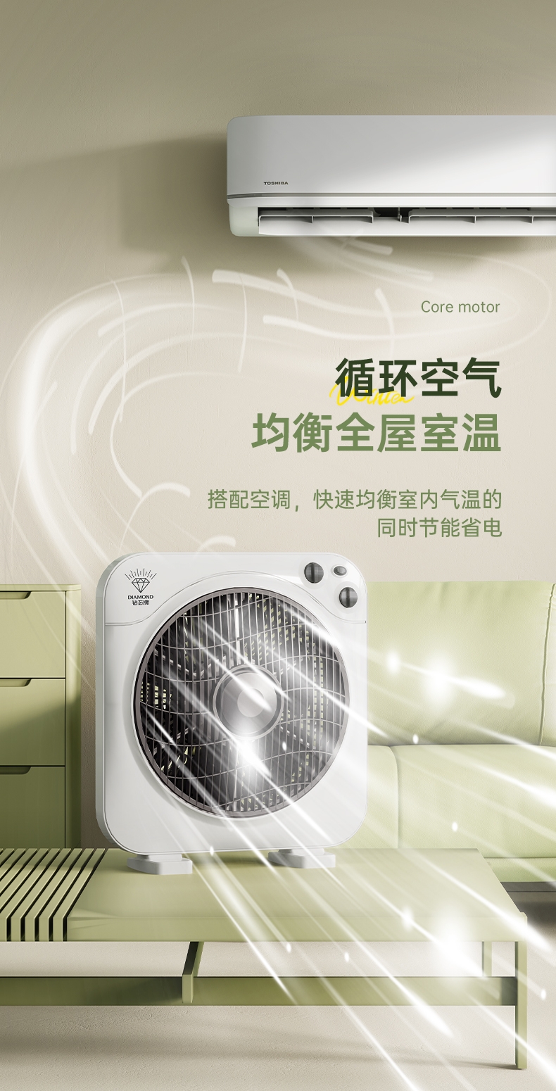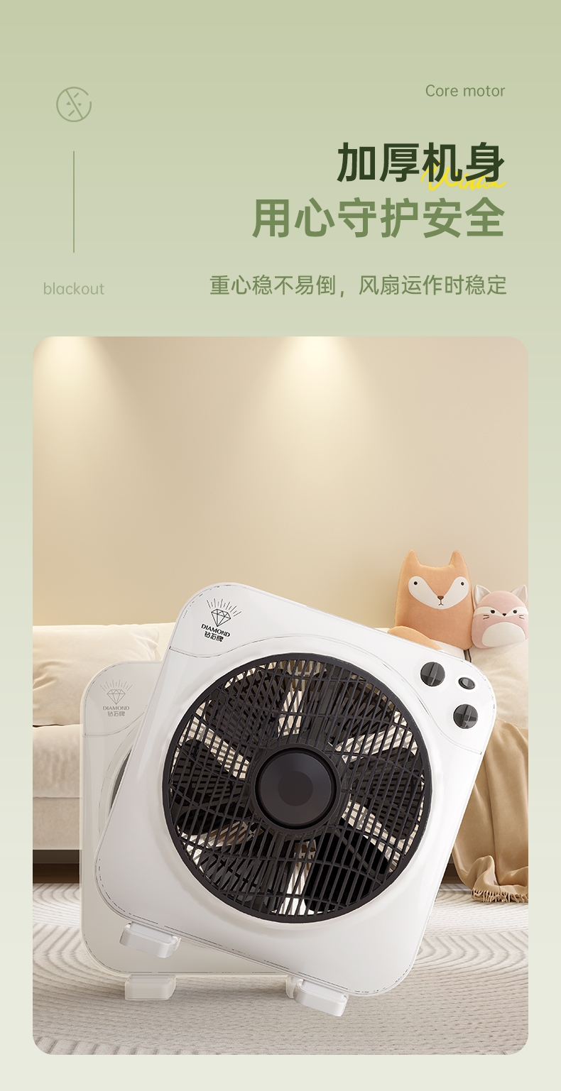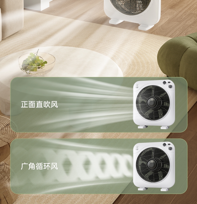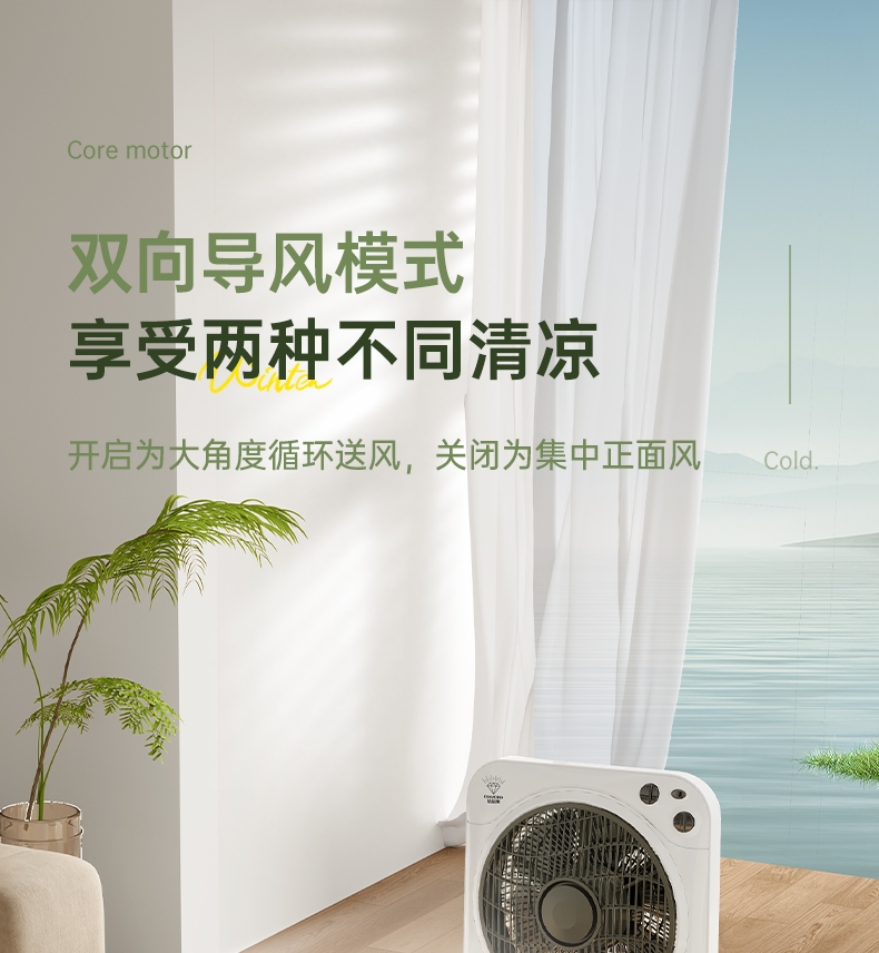 铜芯电机强劲稳定,六叶送风广而柔和;三档风速定时关机,台地两用便携安全;双向导风循环空气,搭配空调均衡室温
