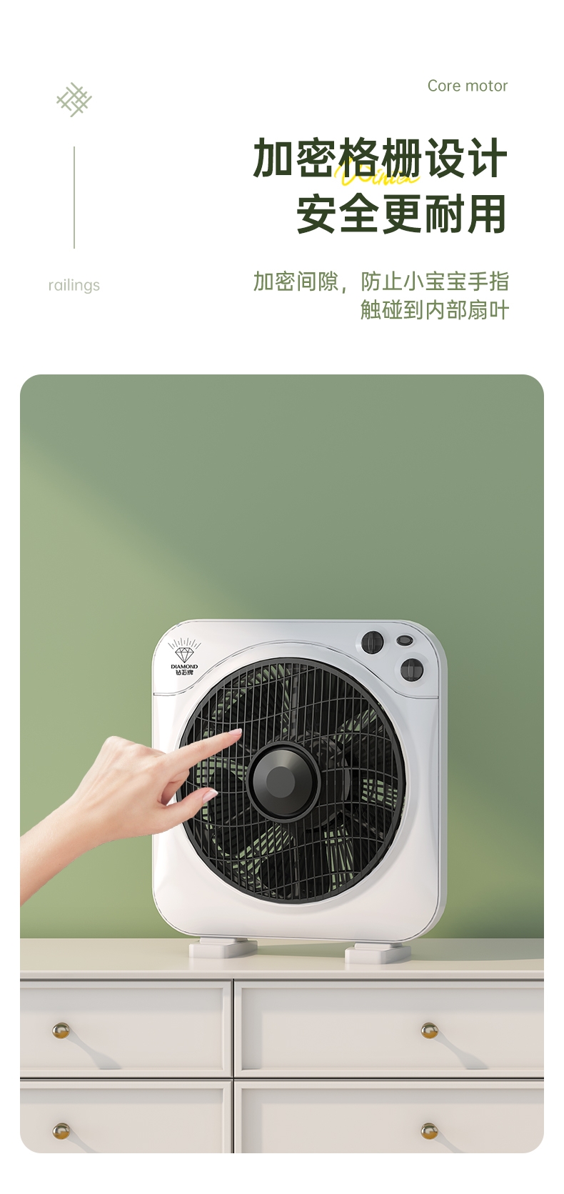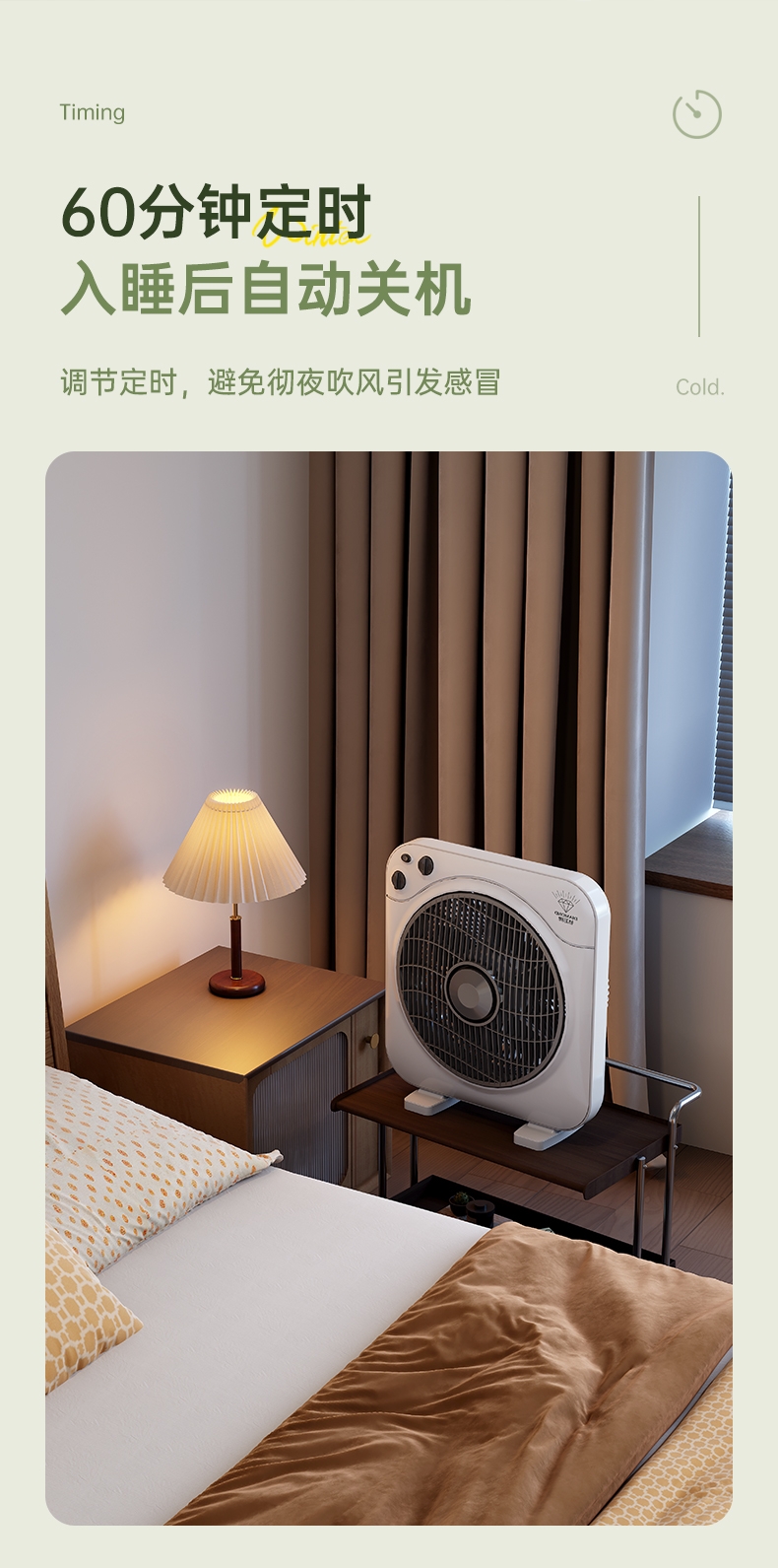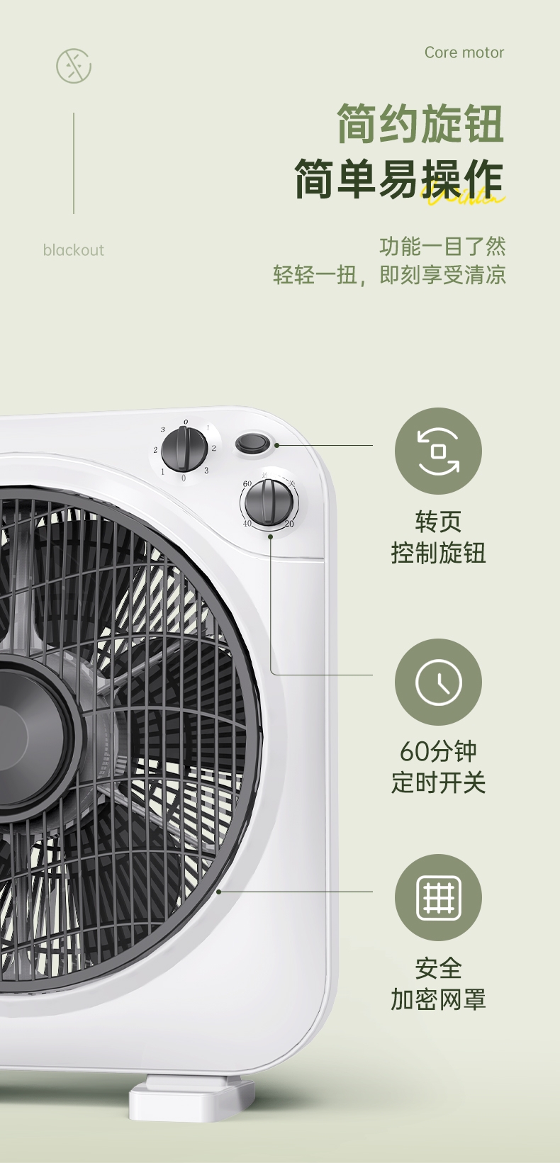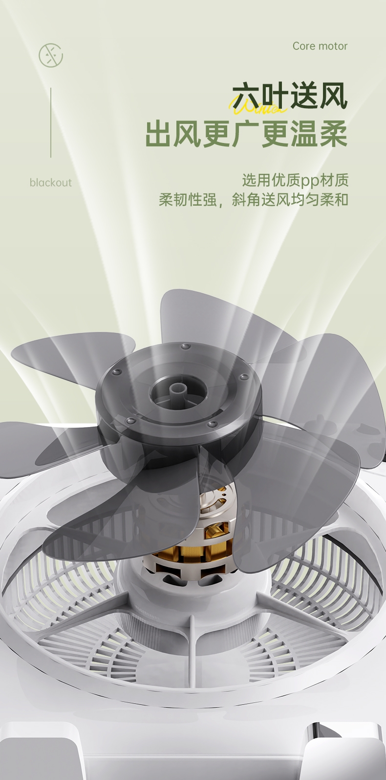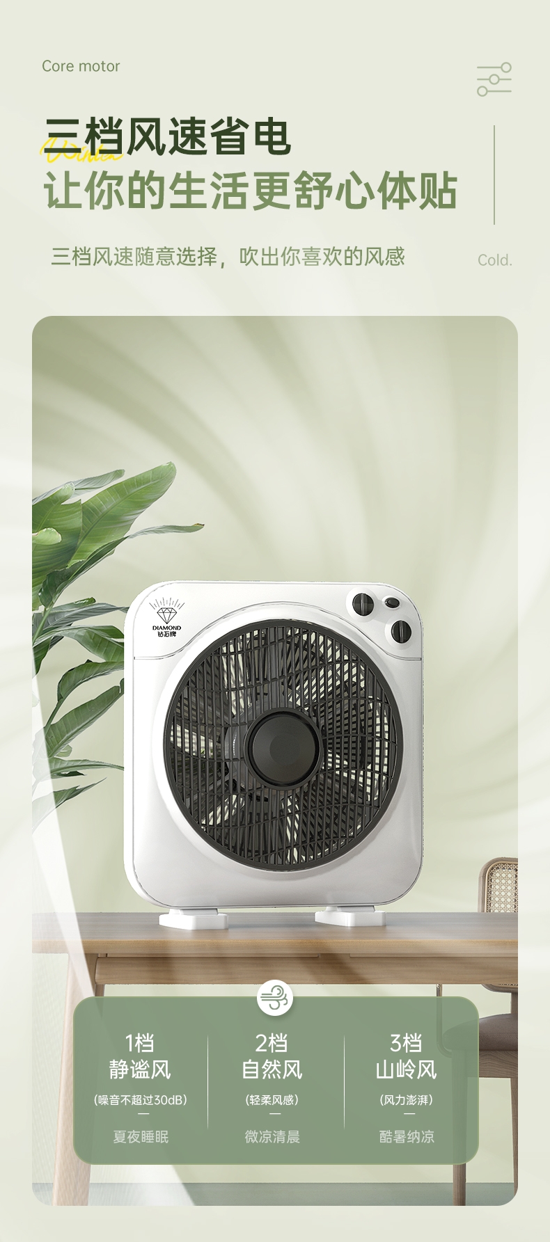 铜芯电机强劲稳定,六叶送风广而柔和;三档风速定时关机,台地两用便携安全;双向导风循环空气,搭配空调均衡室温