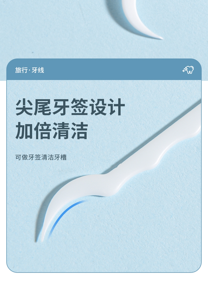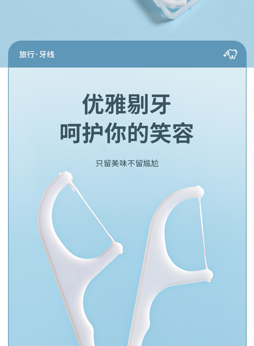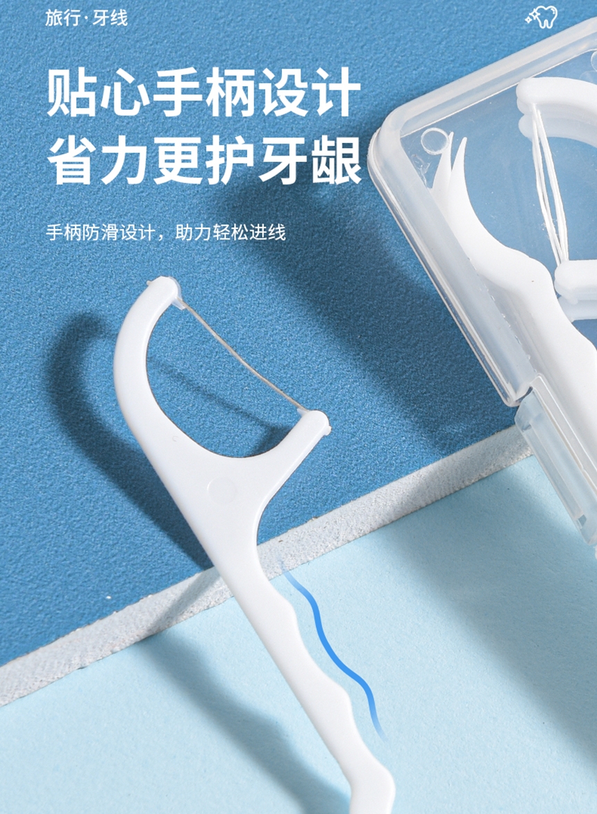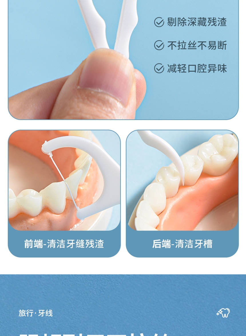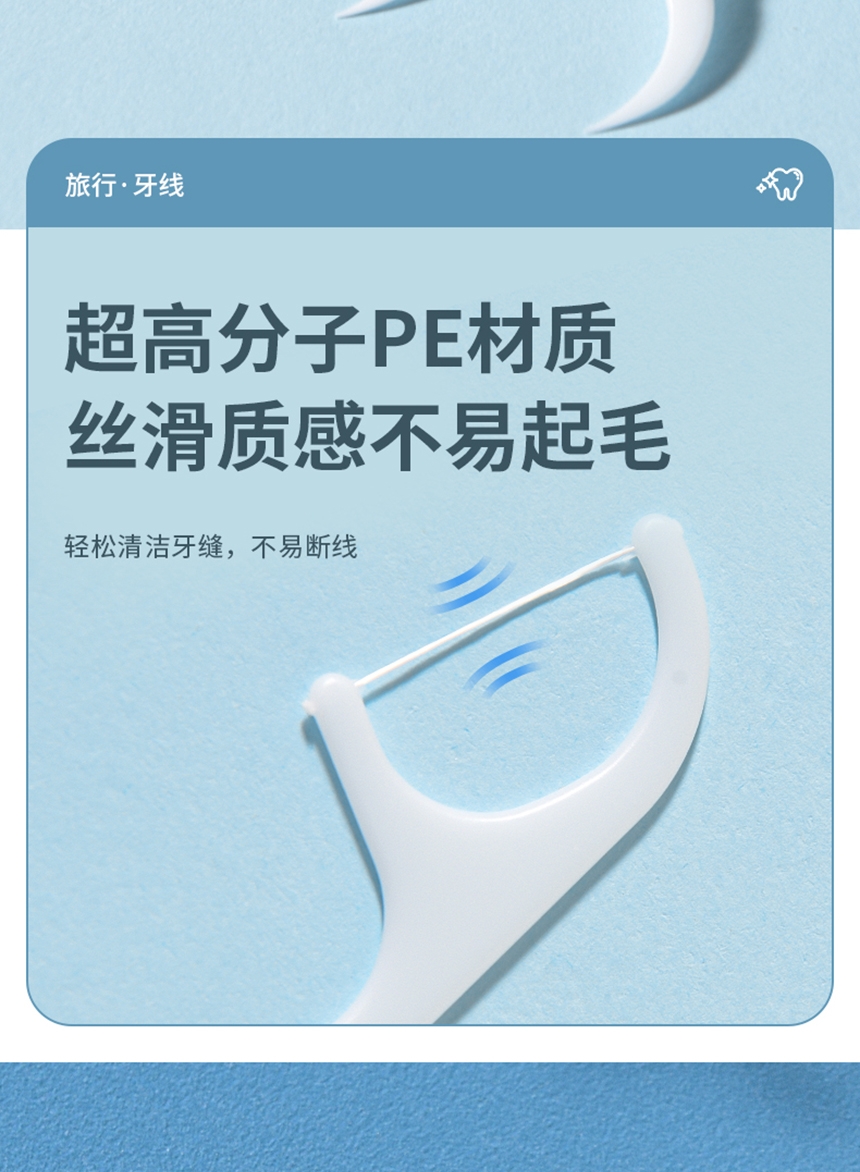 洁净牙缝 高效清洁;高弹力细化线 小巧便捷 深入清洁齿缝;小巧便捷 差旅无忧