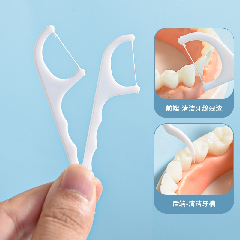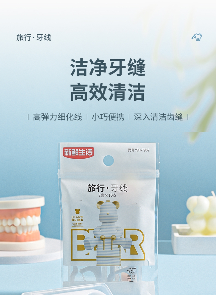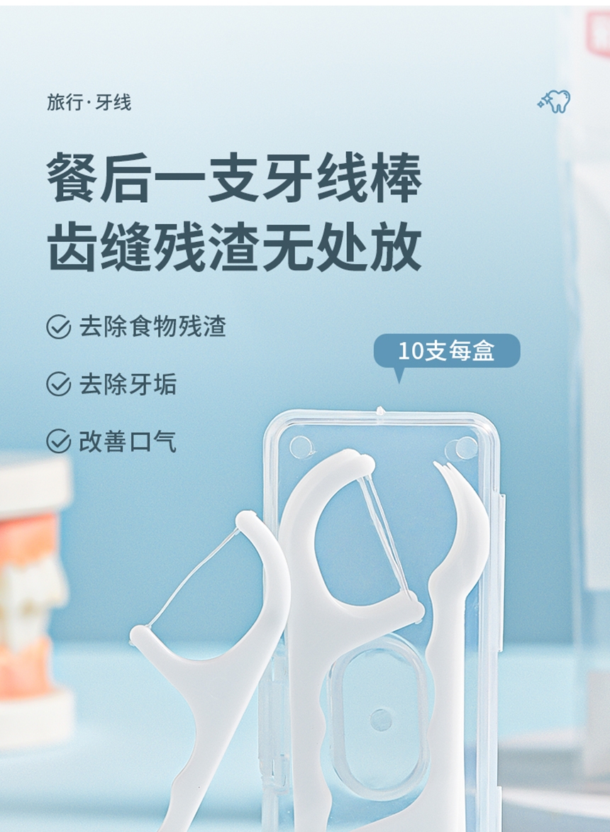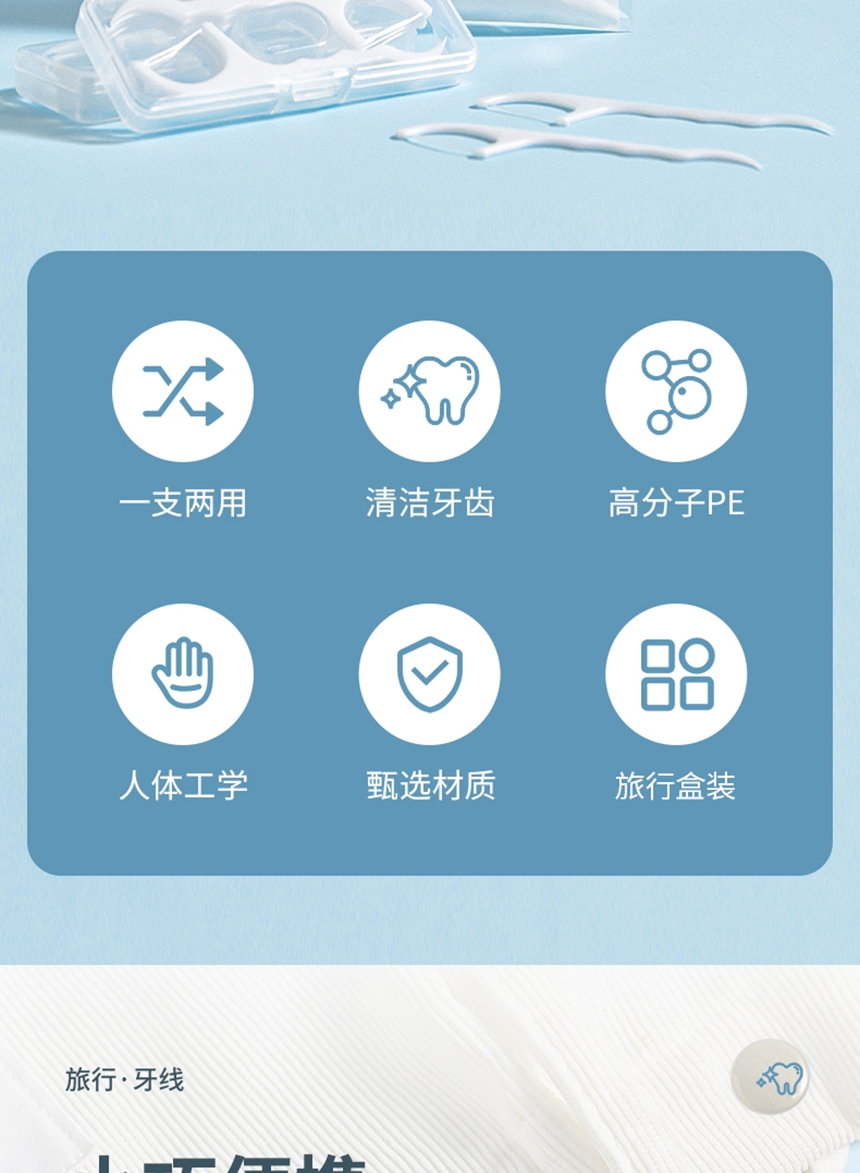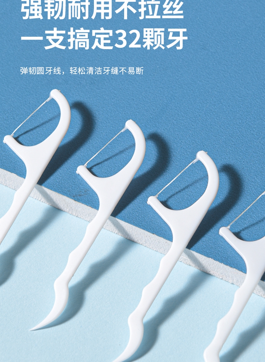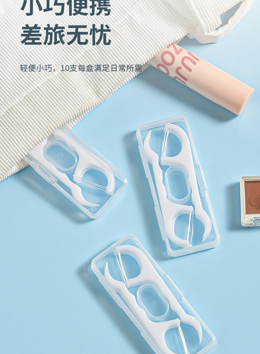 洁净牙缝 高效清洁;高弹力细化线 小巧便捷 深入清洁齿缝;小巧便捷 差旅无忧