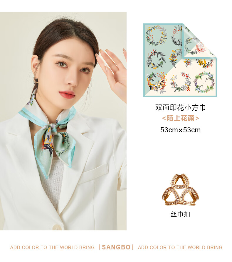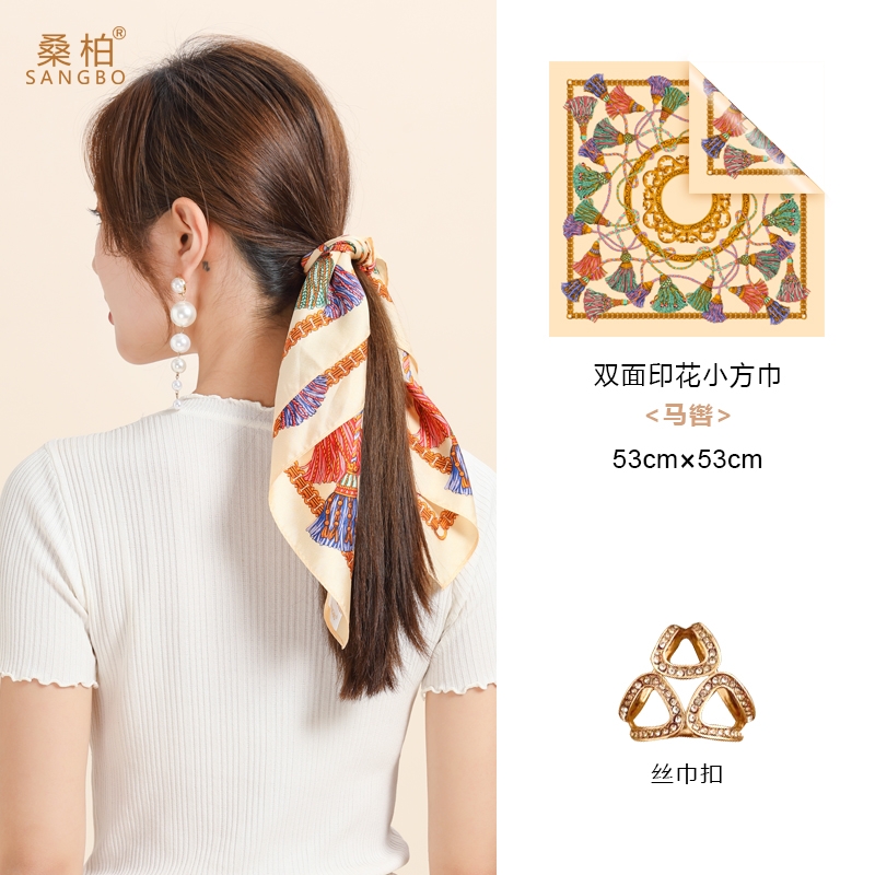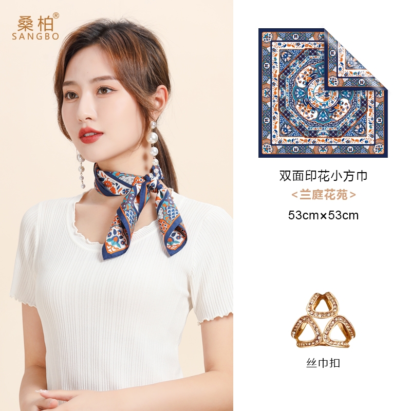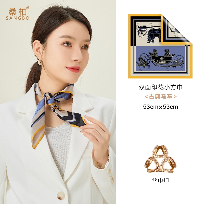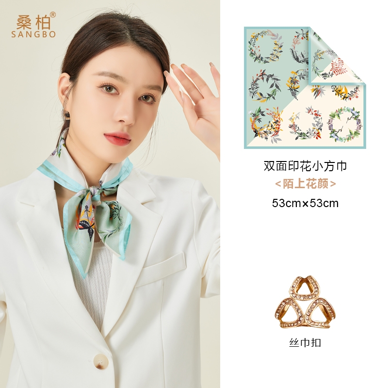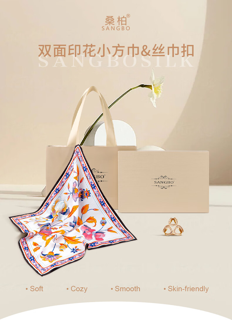 桑柏 双面印花真丝小方巾丝巾扣礼盒