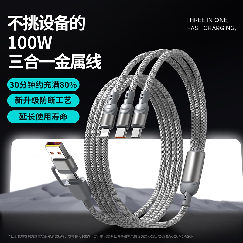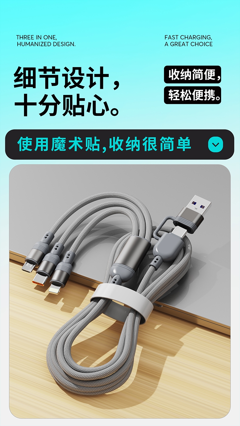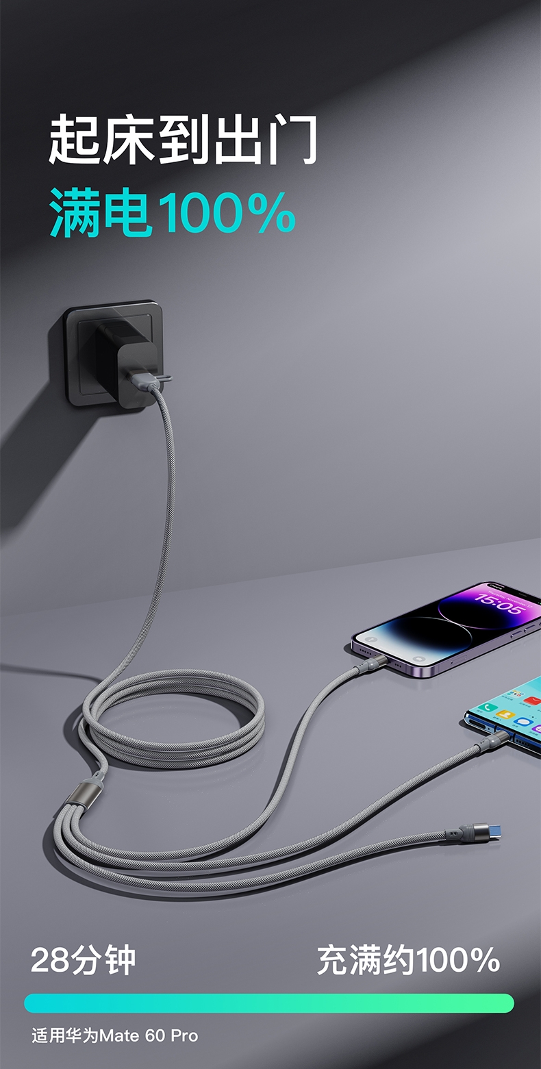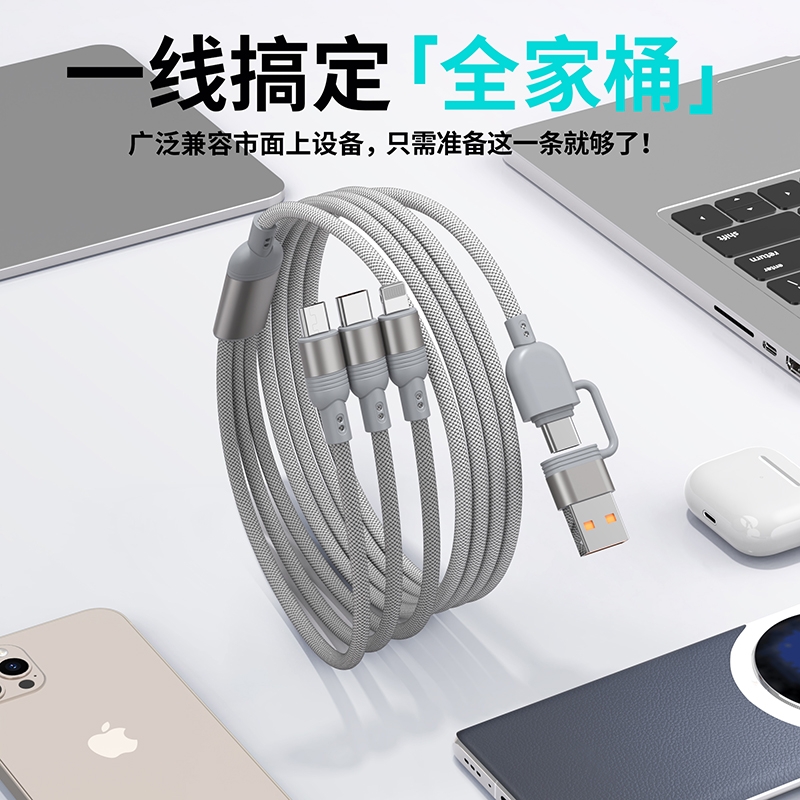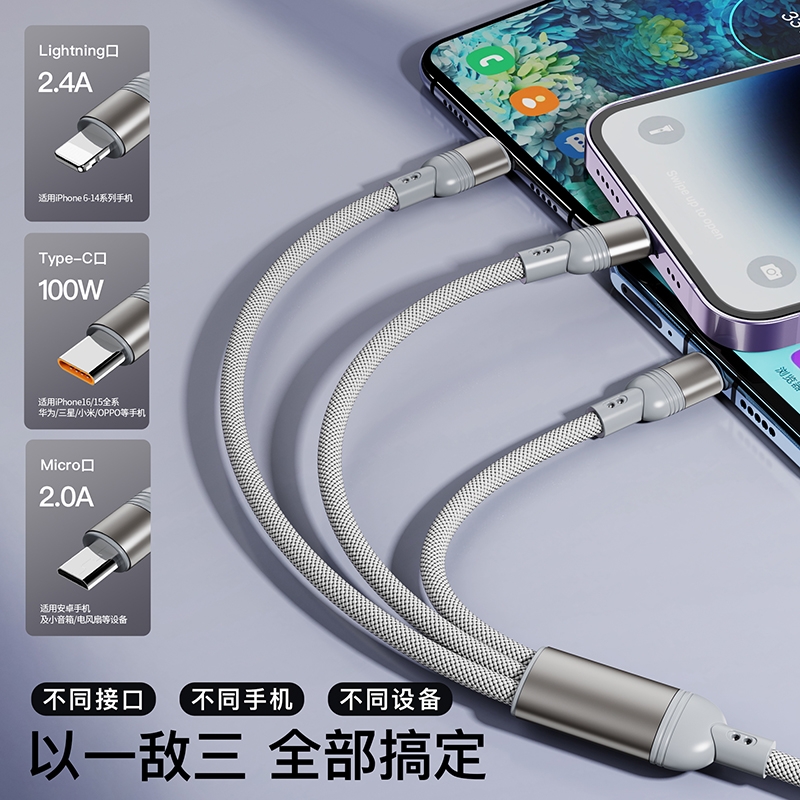 马年开门红赠礼佳品,线长1.2米,;5A输出, Type-c、苹果、安卓三合一;二拖三快速充电,兼容手机,平板,电脑多设备充电