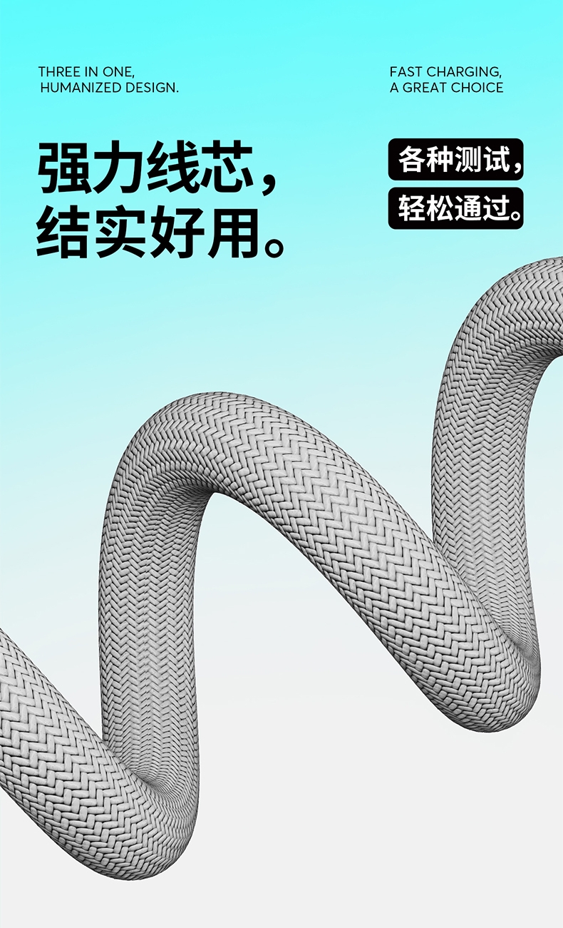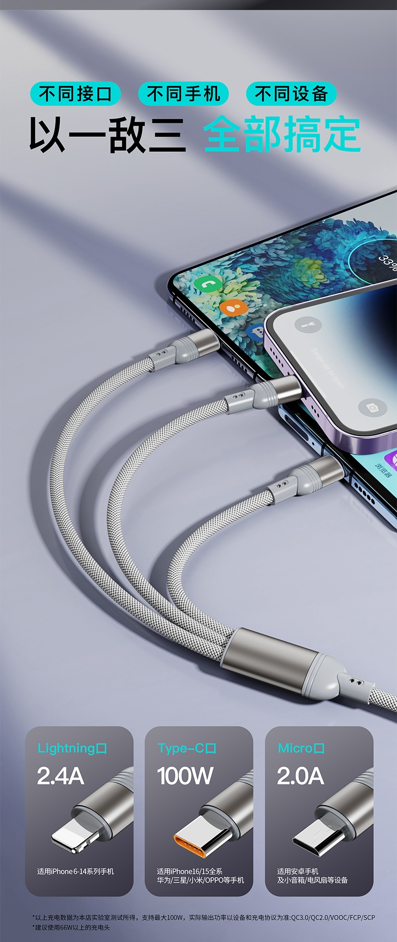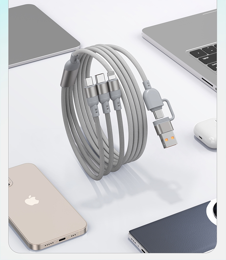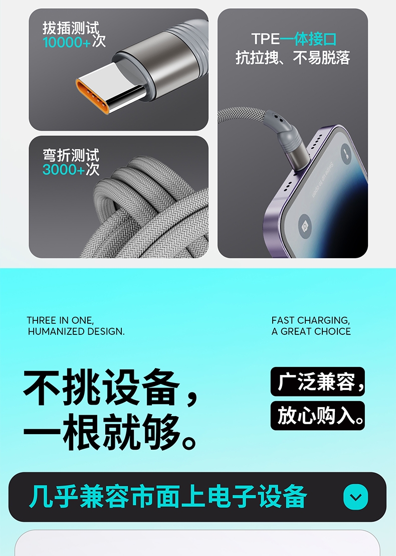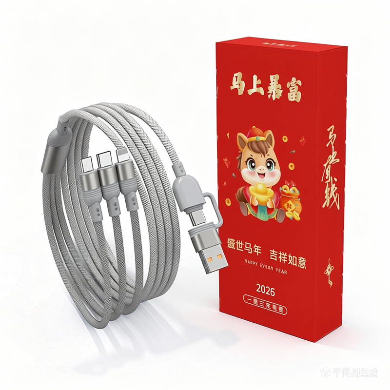 马年开门红赠礼佳品,线长1.2米,;5A输出, Type-c、苹果、安卓三合一;二拖三快速充电,兼容手机,平板,电脑多设备充电