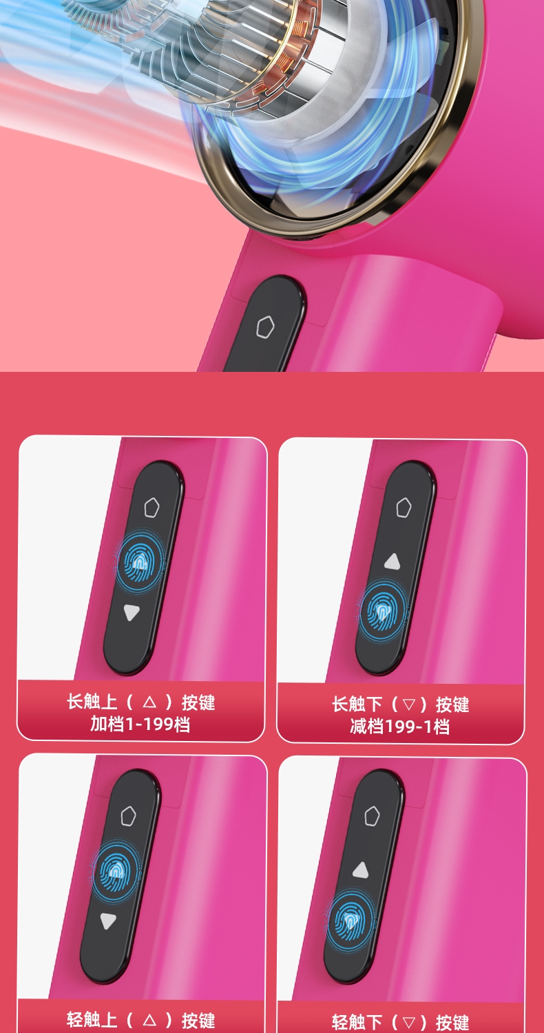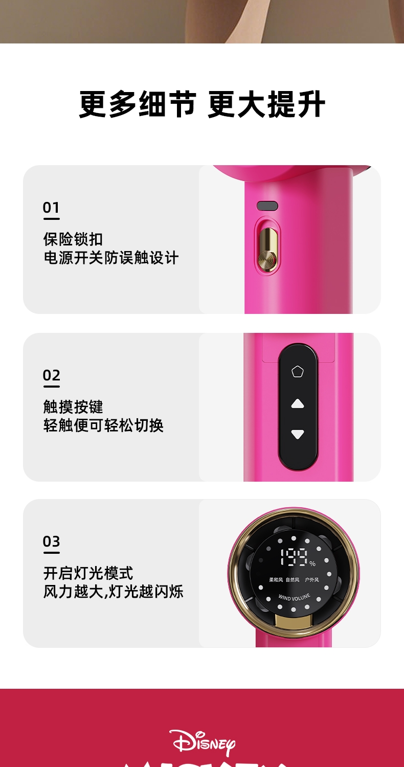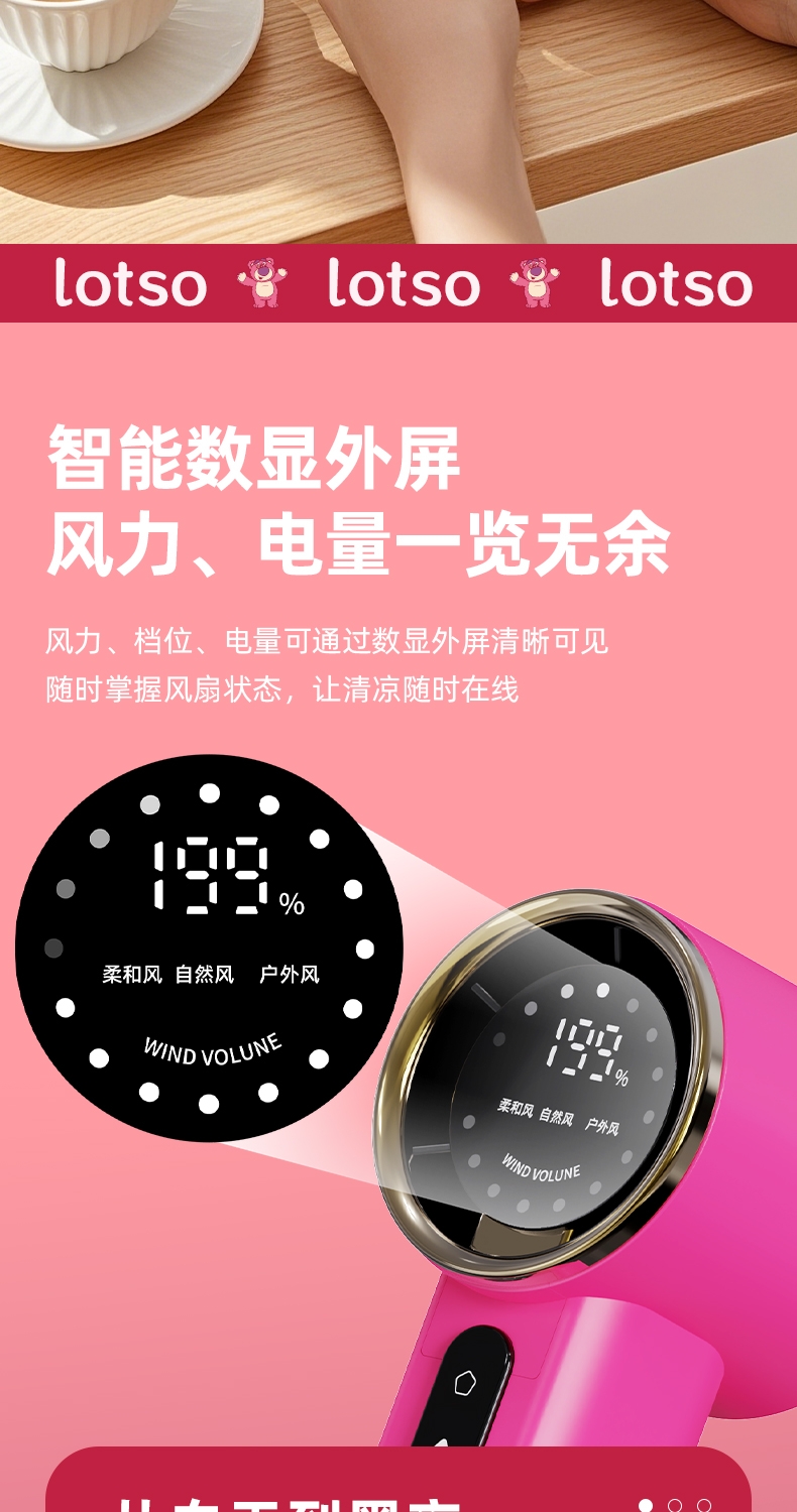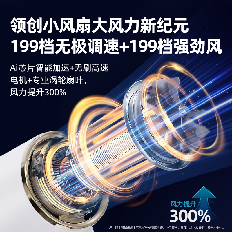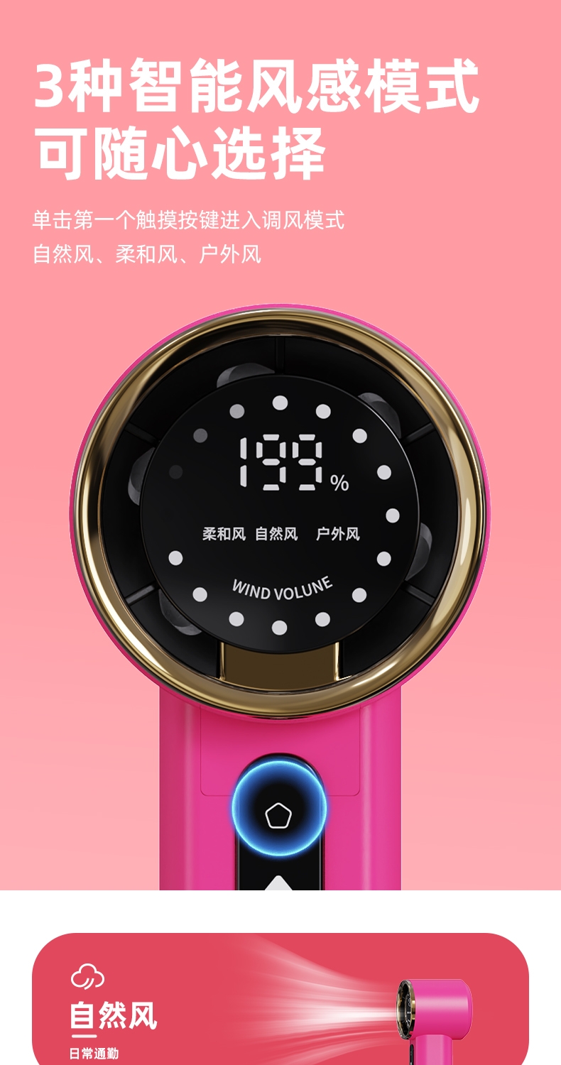 机身质感细腻,轻奢金边环设计,送礼或自用都可;199 档无极调速,高清数显面板,风力状态一目了然;无叶涡轮设计,避免长发或儿童手指卷入,使用更安心