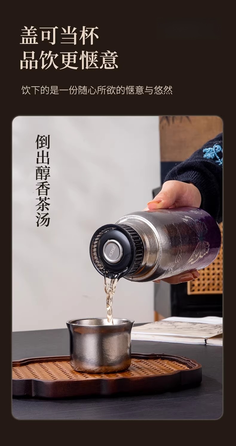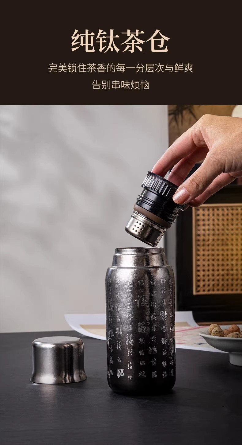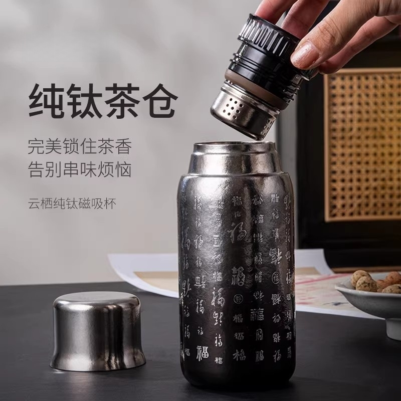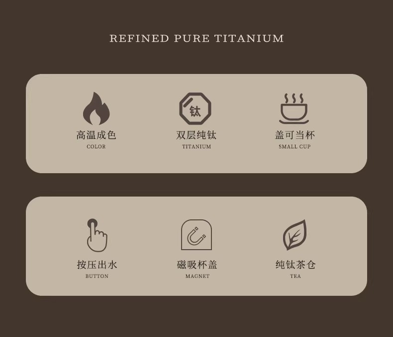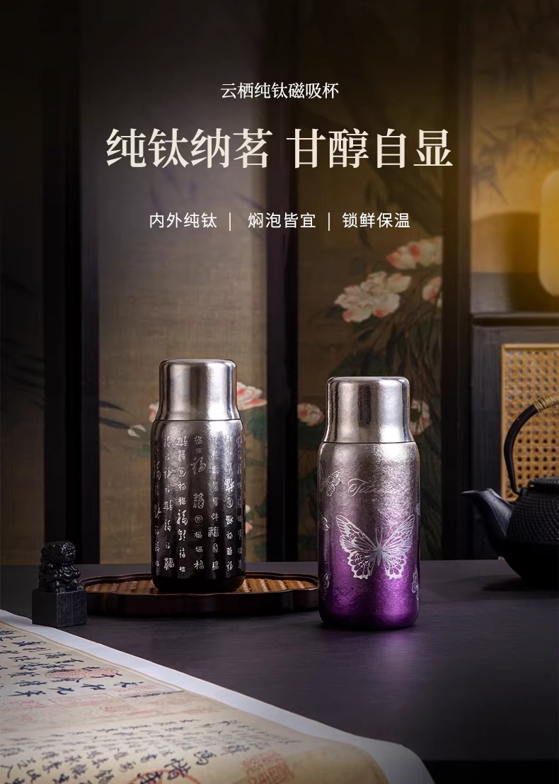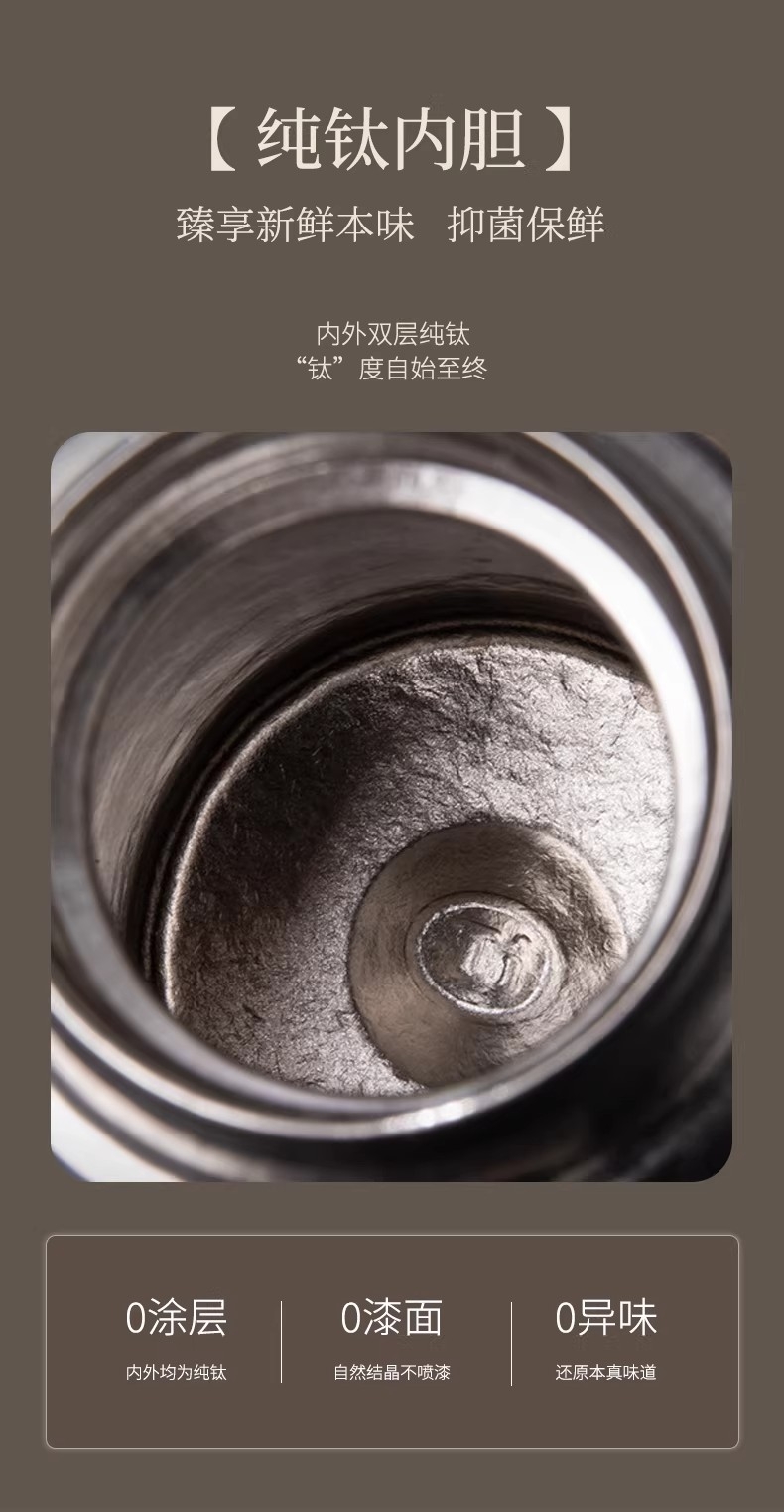 纯钛纳茗 甘醇自显 内外纯钛| 焖泡皆宜|锁鲜保温;具有高耐腐蚀性、高稳定性和亲生物性广泛用于医疗器械;臻享新鲜本味,抑菌保鲜,内外双层纯钛,自始‘钛”度;0涂层 内外均为纯钛 0漆面 自然结晶不喷漆;磁吸杯盖轻松开盖免旋拧, 强力磁吸,颠簸不掉