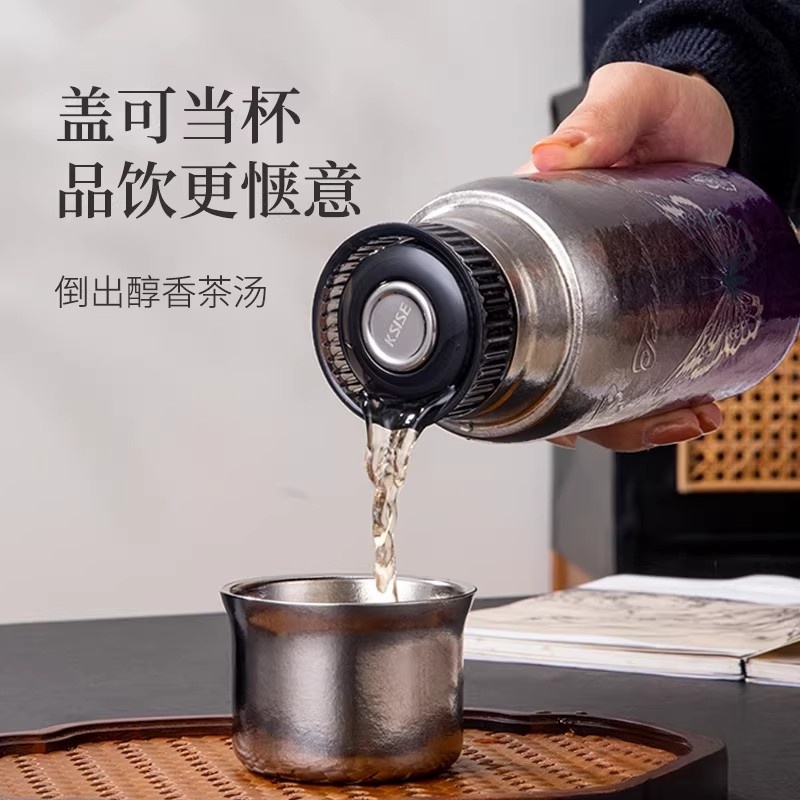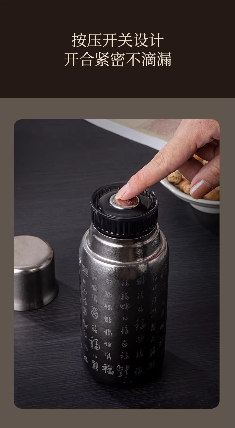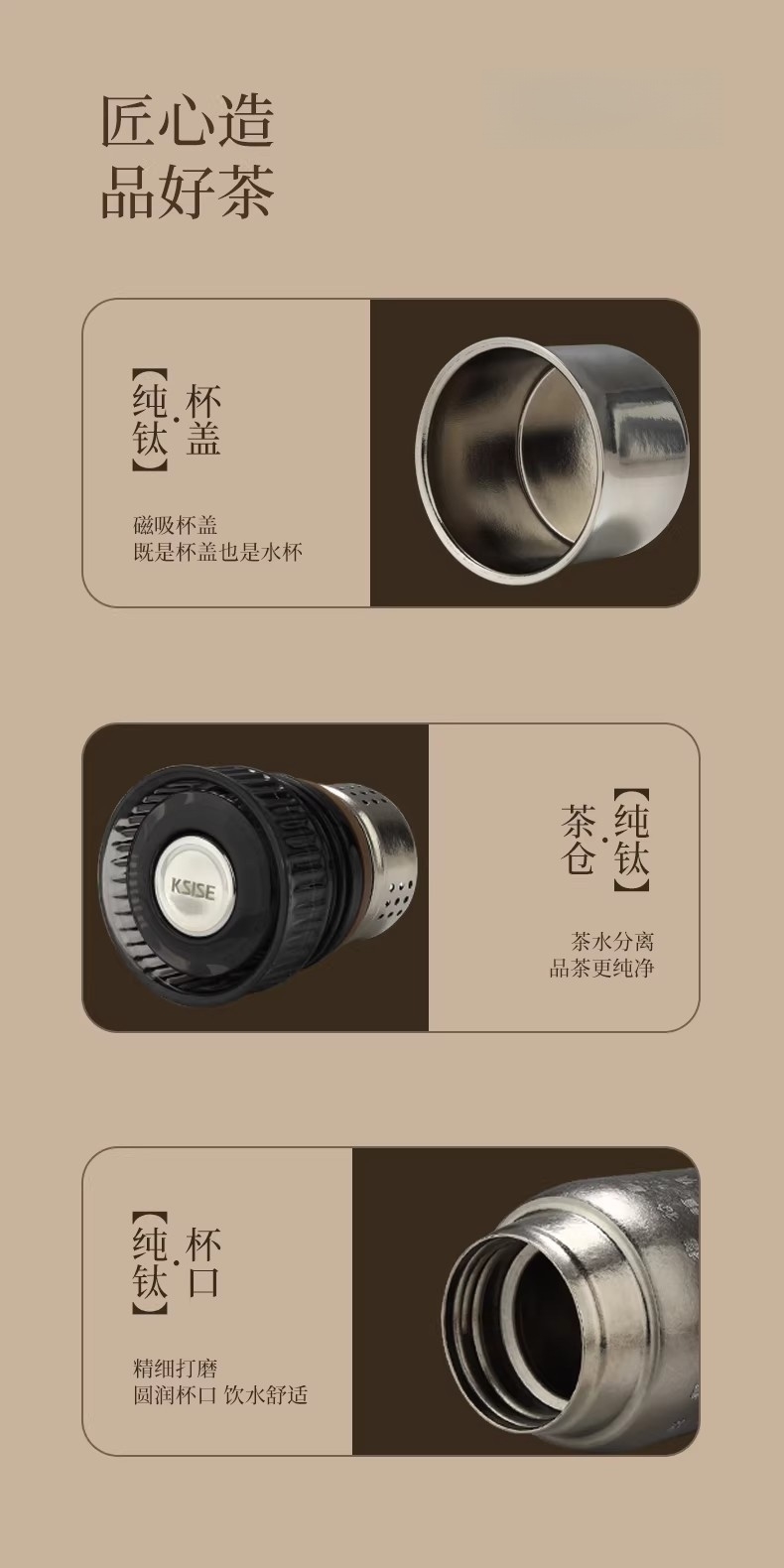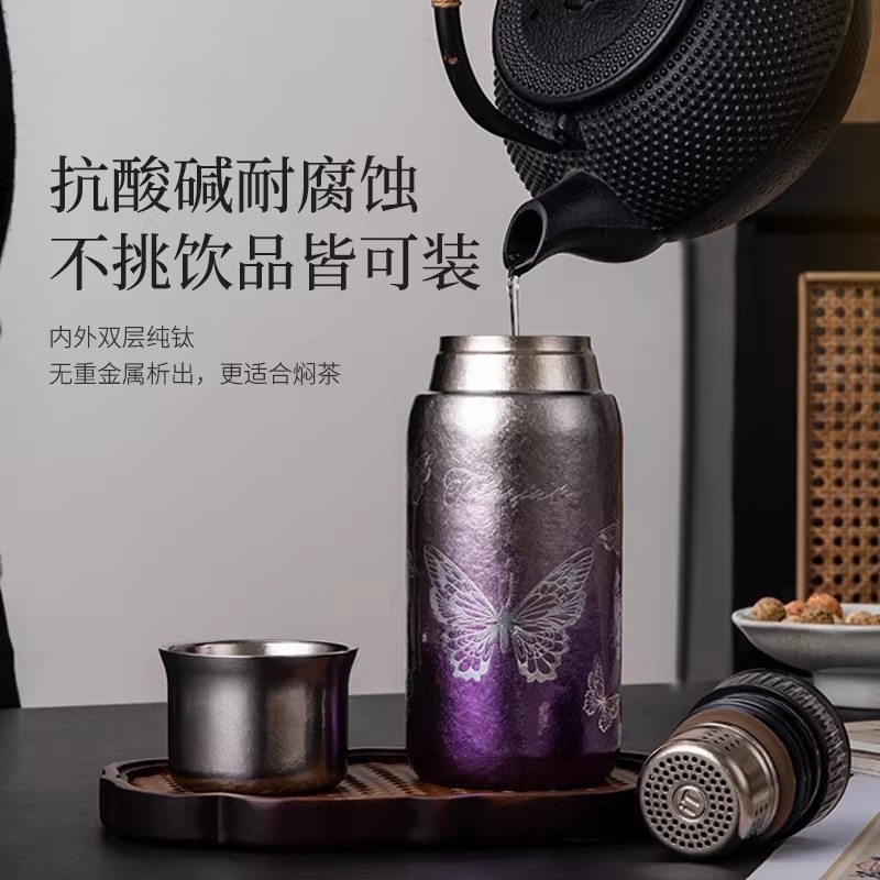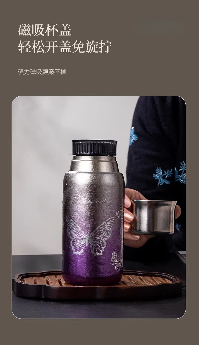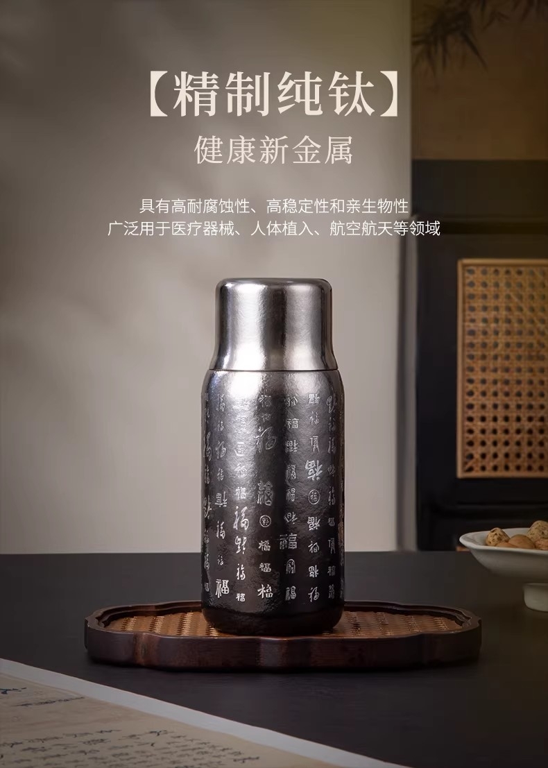 纯钛纳茗 甘醇自显 内外纯钛| 焖泡皆宜|锁鲜保温;具有高耐腐蚀性、高稳定性和亲生物性广泛用于医疗器械;臻享新鲜本味,抑菌保鲜,内外双层纯钛,自始‘钛”度;0涂层 内外均为纯钛 0漆面 自然结晶不喷漆;磁吸杯盖轻松开盖免旋拧, 强力磁吸,颠簸不掉