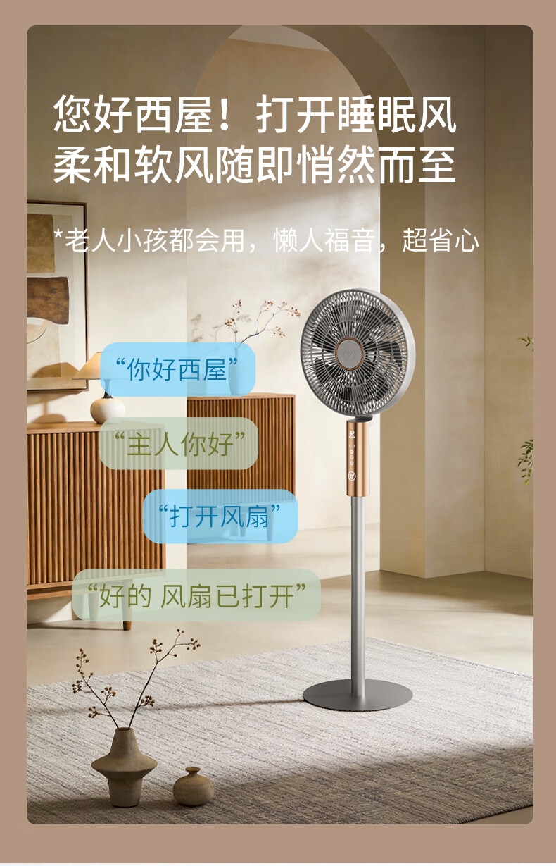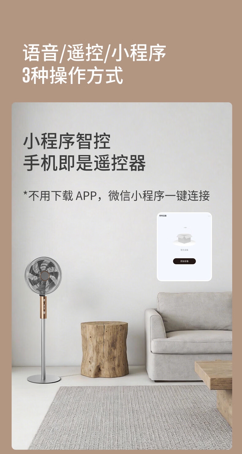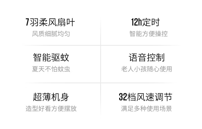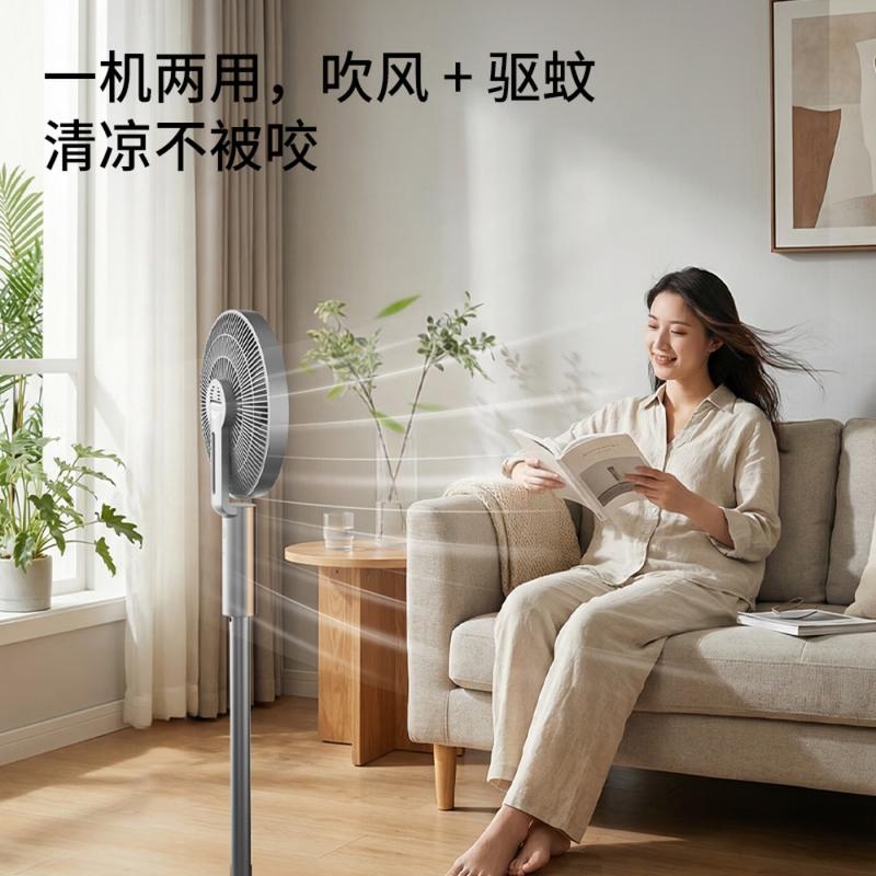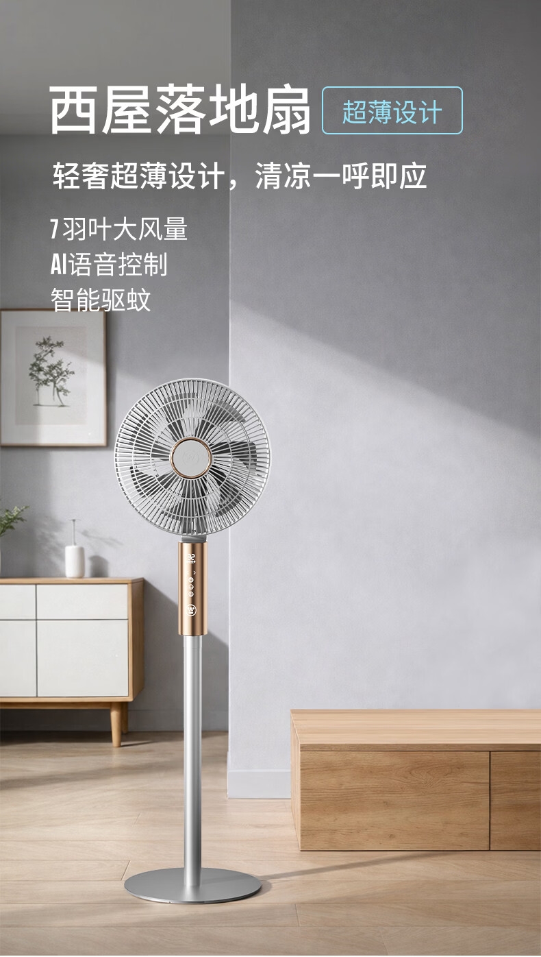 32档风速调节,直流无刷电机,超薄设计;多种控制方式:触摸、遥控、小程序、AI智能语音交互;一级能效,超声波驱蚊,喷漆款