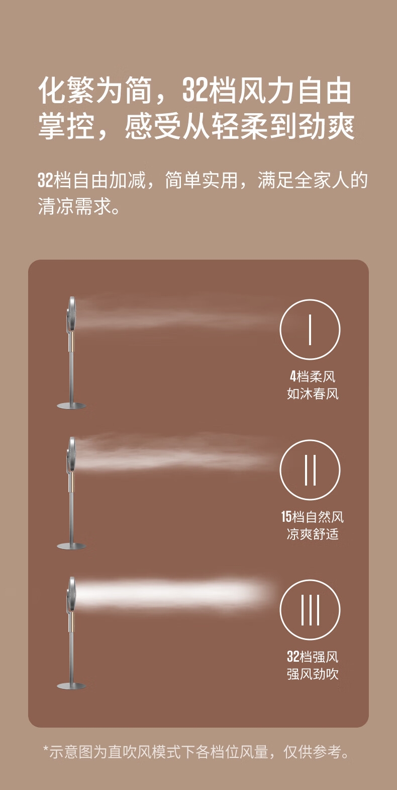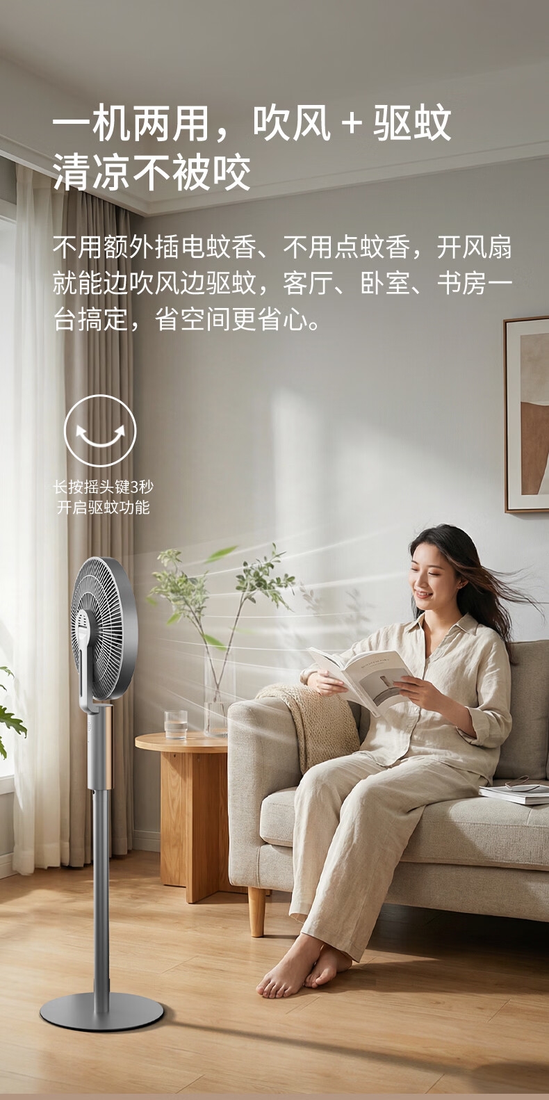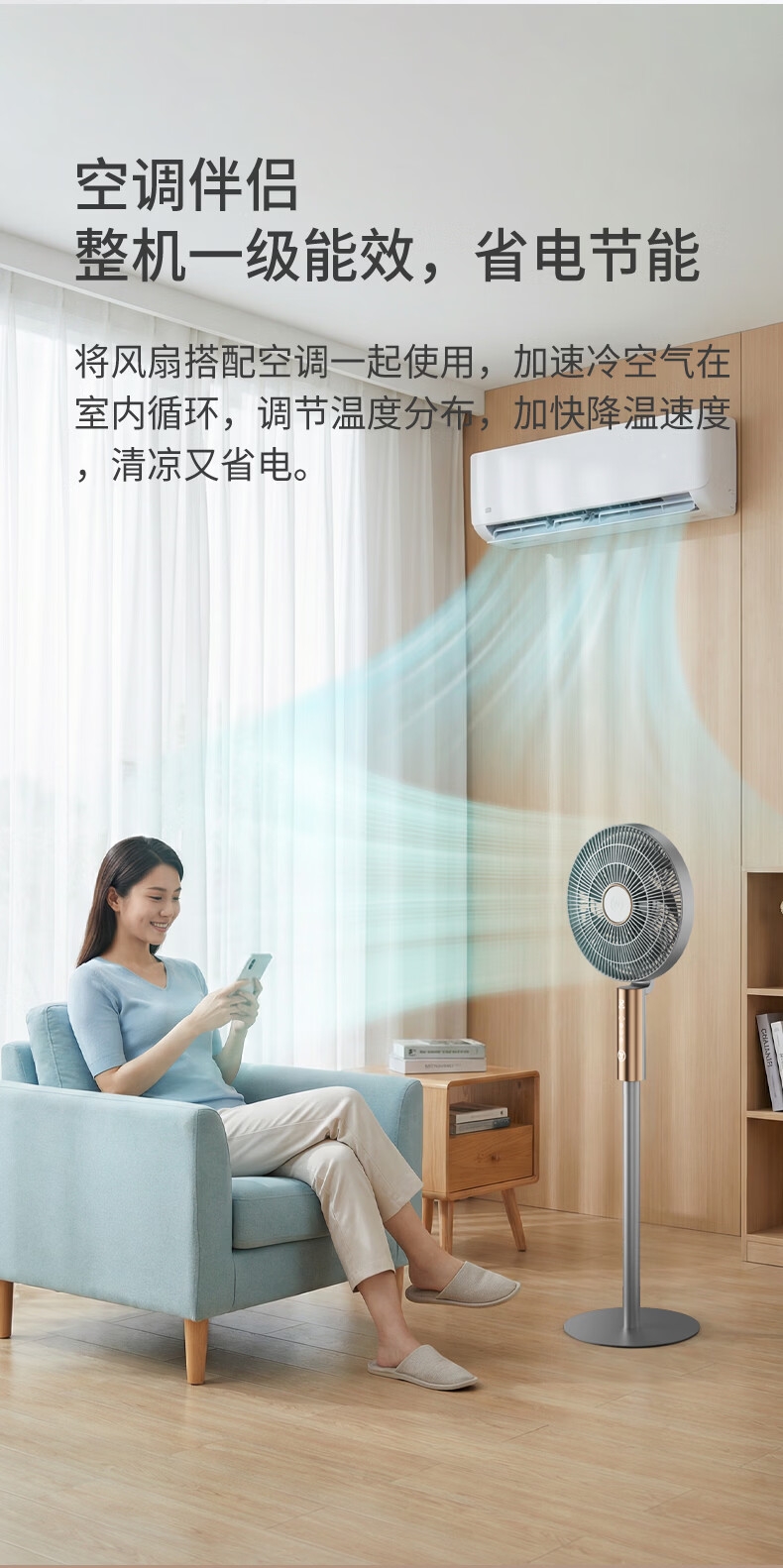 32档风速调节,直流无刷电机,超薄设计;多种控制方式:触摸、遥控、小程序、AI智能语音交互;一级能效,超声波驱蚊,喷漆款