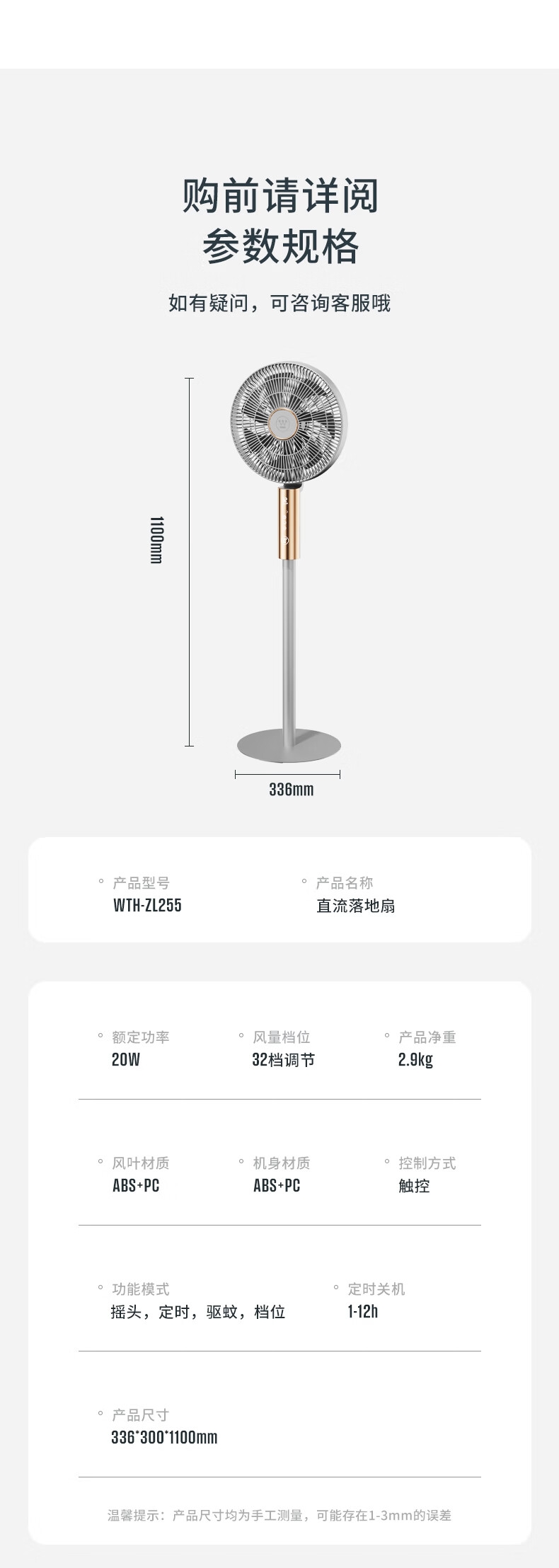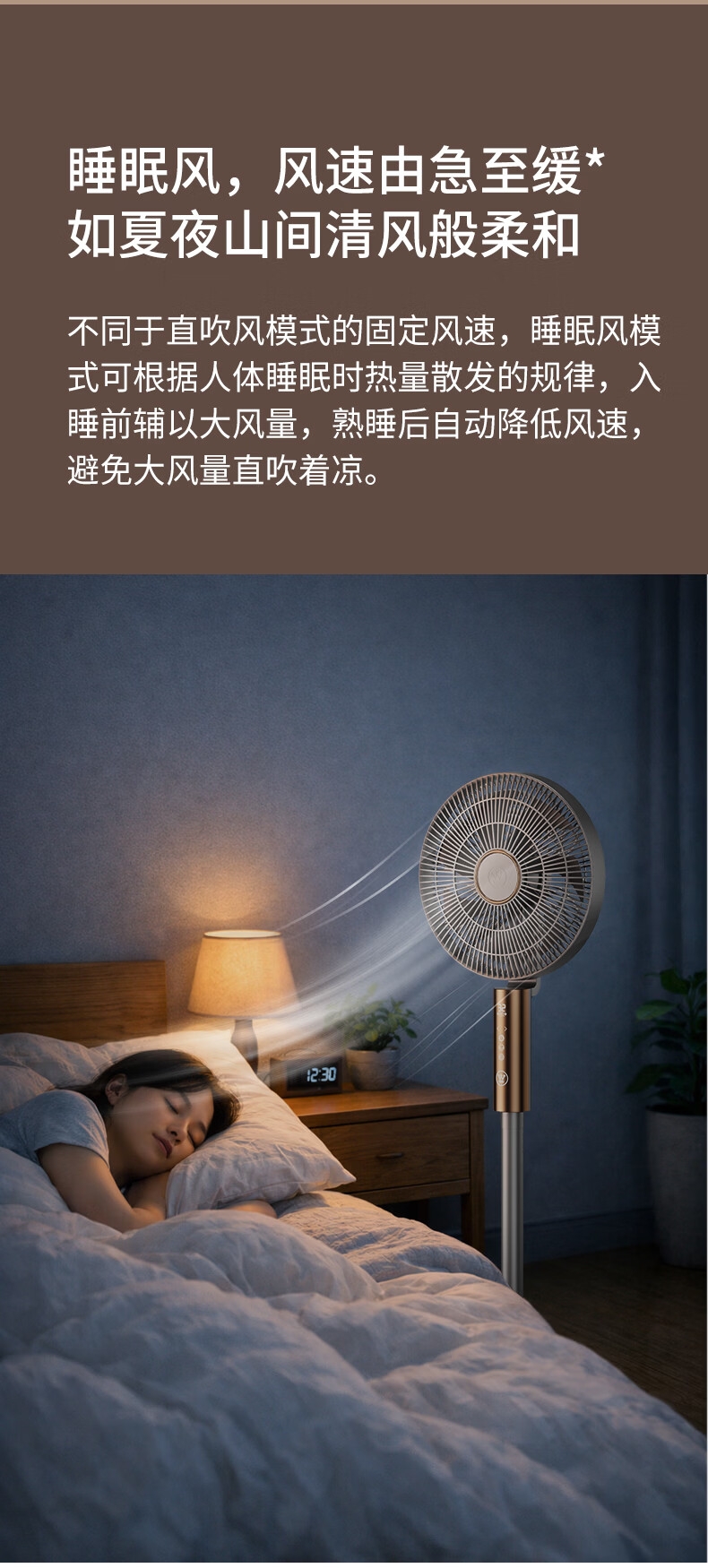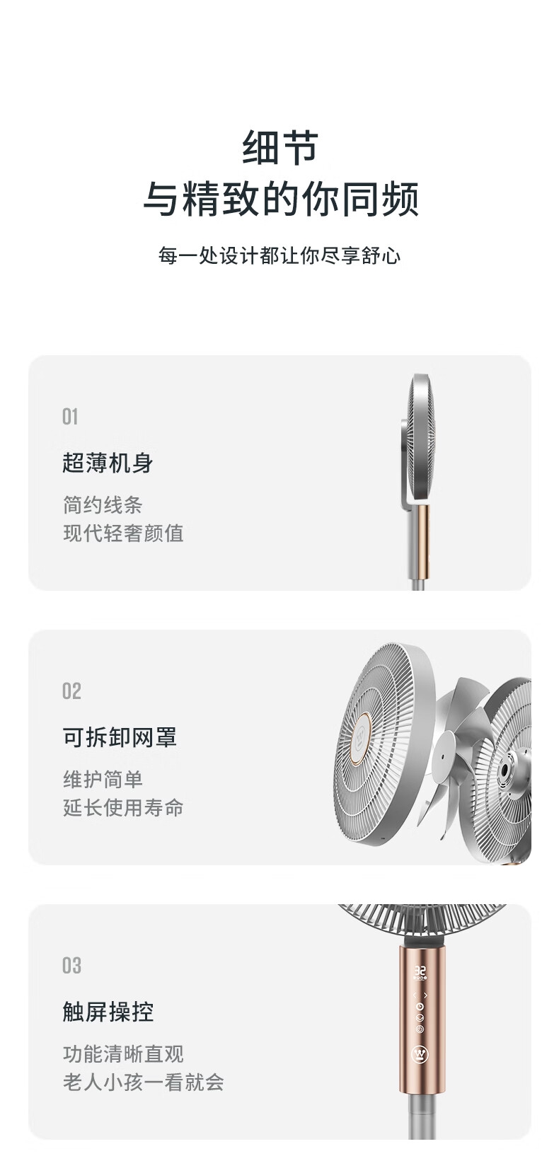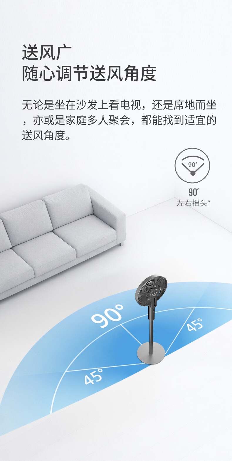 32档风速调节,直流无刷电机,超薄设计;多种控制方式:触摸、遥控、小程序、AI智能语音交互;一级能效,超声波驱蚊,喷漆款