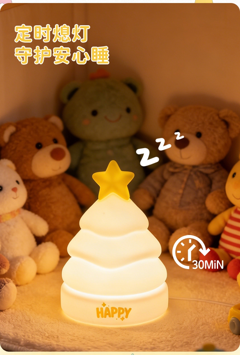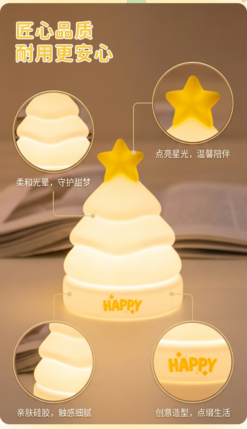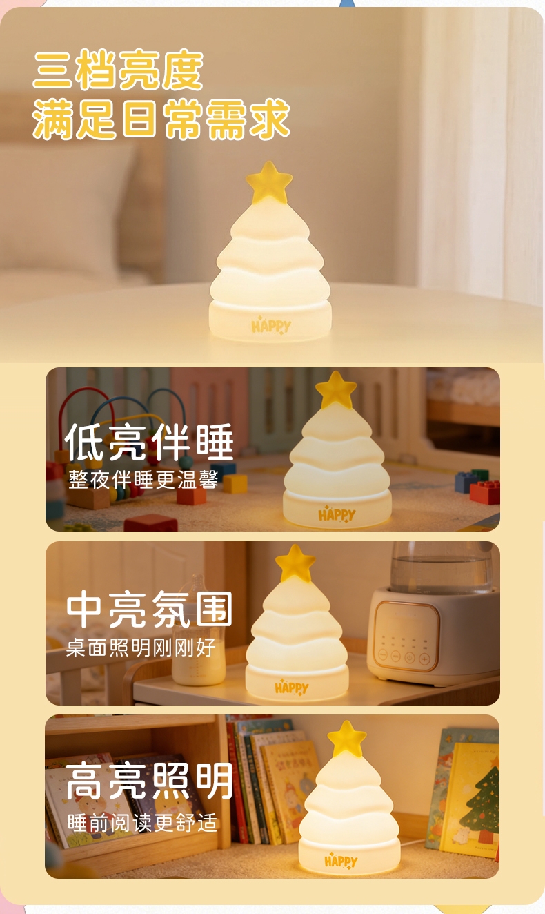 治愈系造型,柔光护眼;拍拍即亮,多档调节,材质安全;多档调光:支持亮度调节,满足不同场景需求