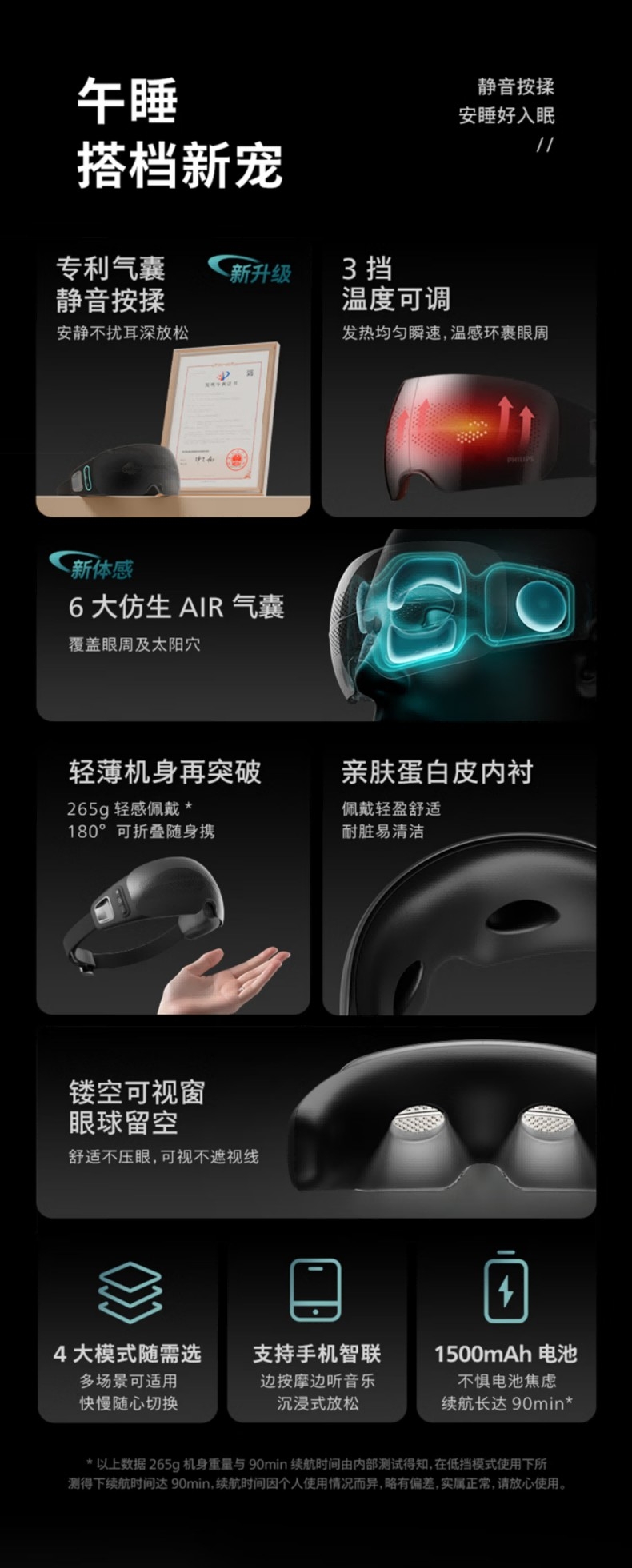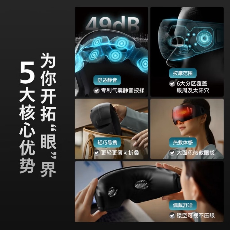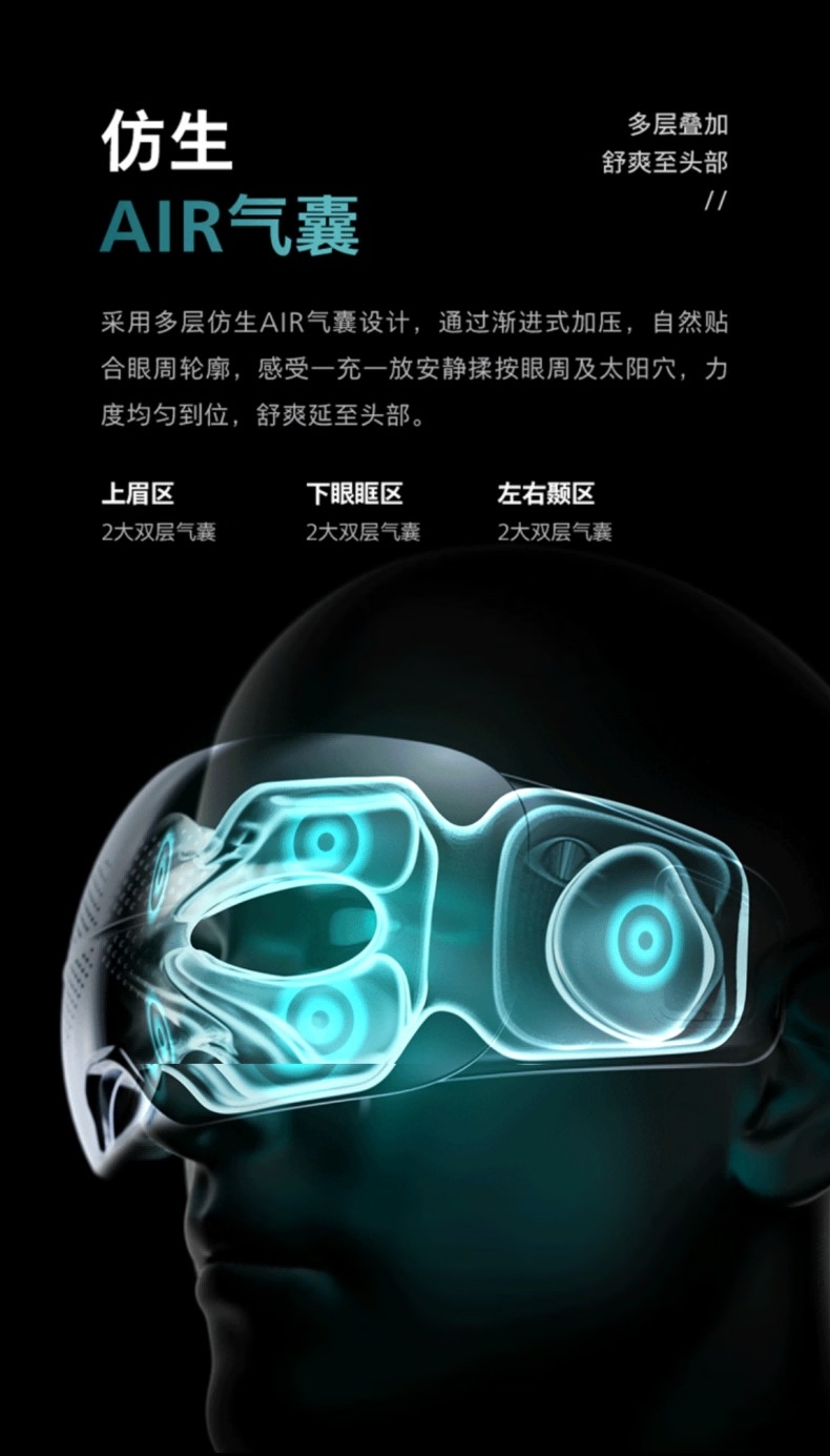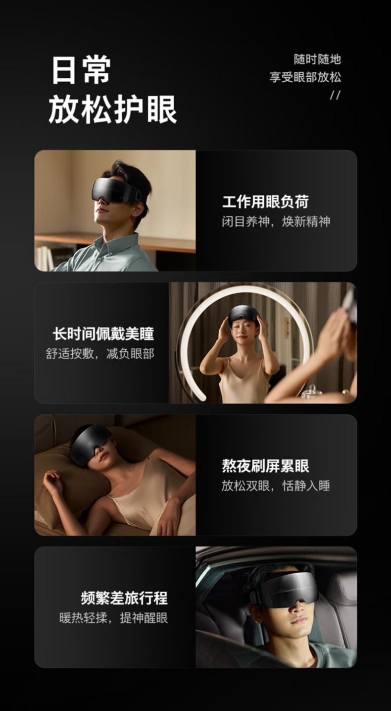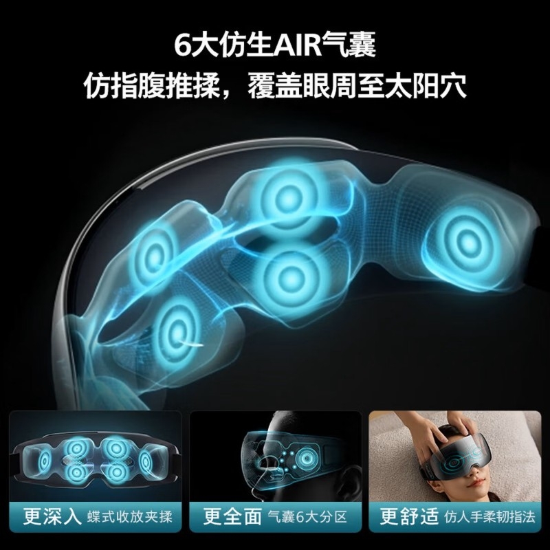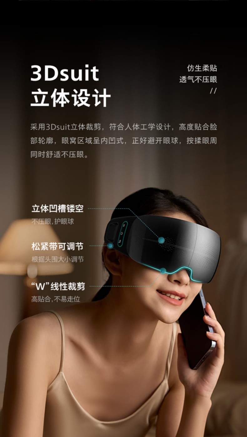 静音气囊按摩;38–45℃三档可调,促进循环,缓解干涩疲劳;4场景模式适配不同需求,蓝牙连接音;约 265g 轻量佩戴,可折叠易收纳;1500mAh 电池,Type‑C 快充,续航约