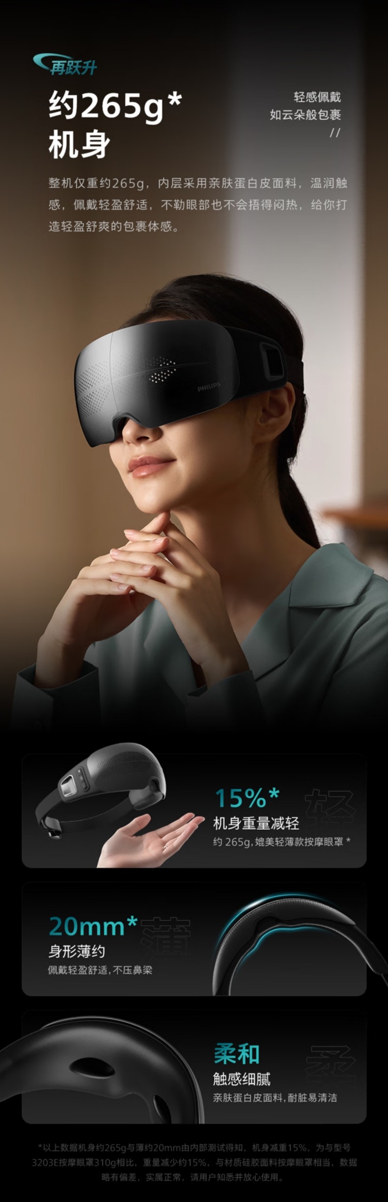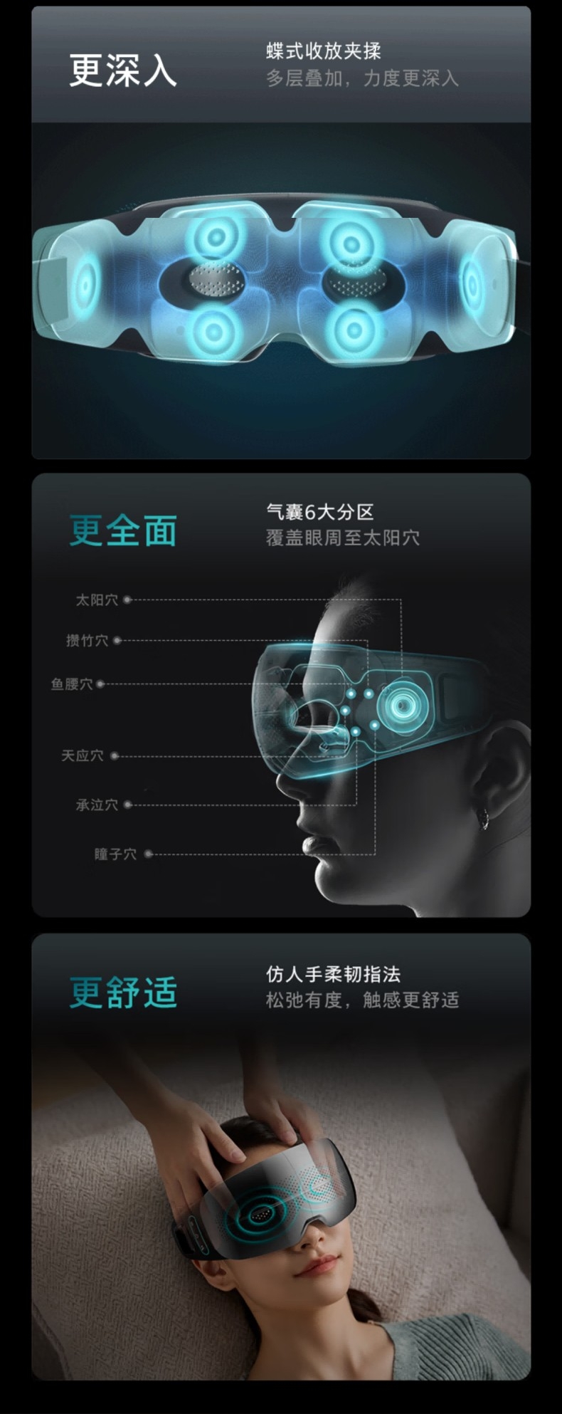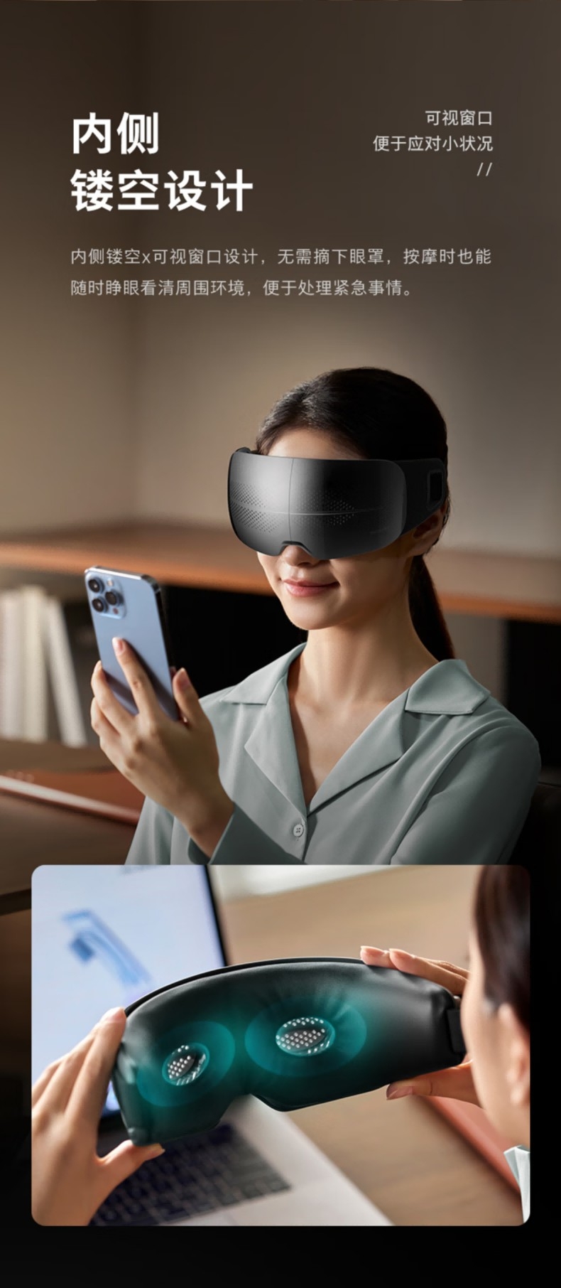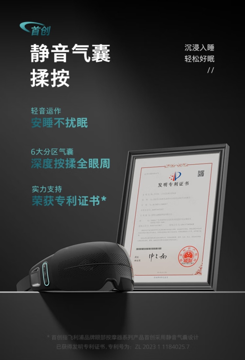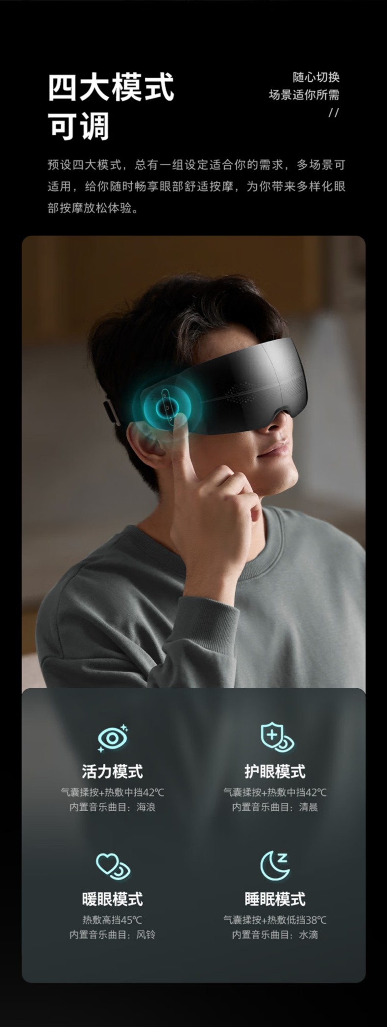 静音气囊按摩;38–45℃三档可调,促进循环,缓解干涩疲劳;4场景模式适配不同需求,蓝牙连接音;约 265g 轻量佩戴,可折叠易收纳;1500mAh 电池,Type‑C 快充,续航约