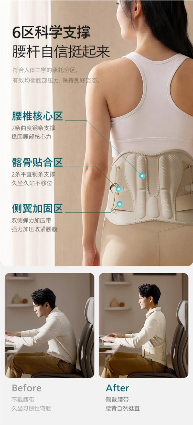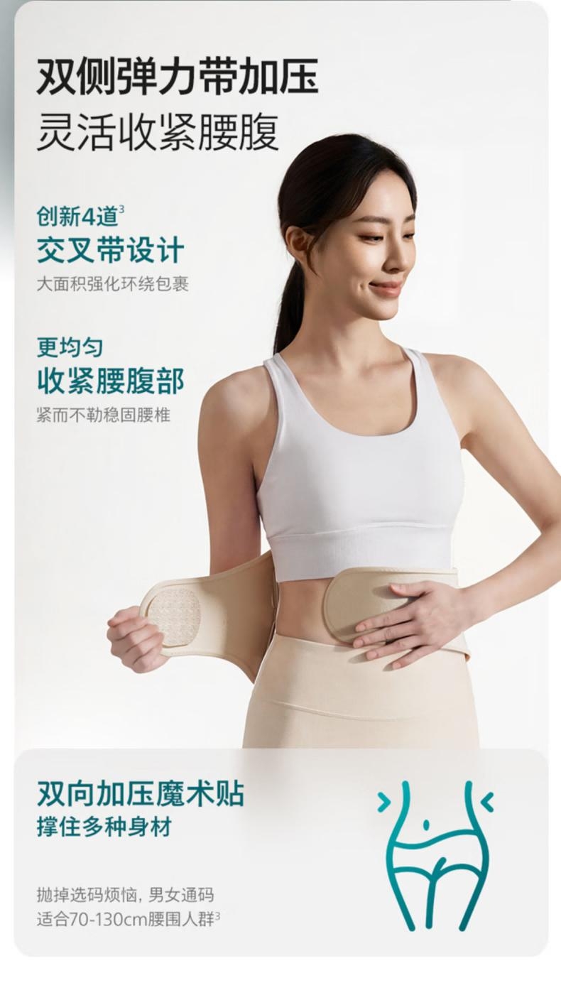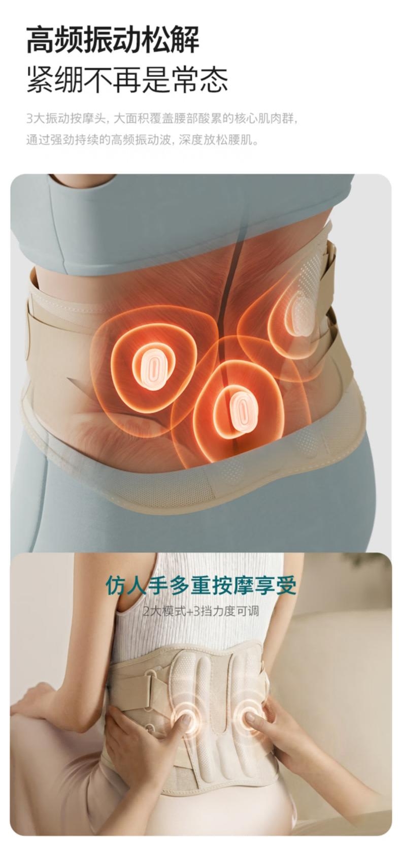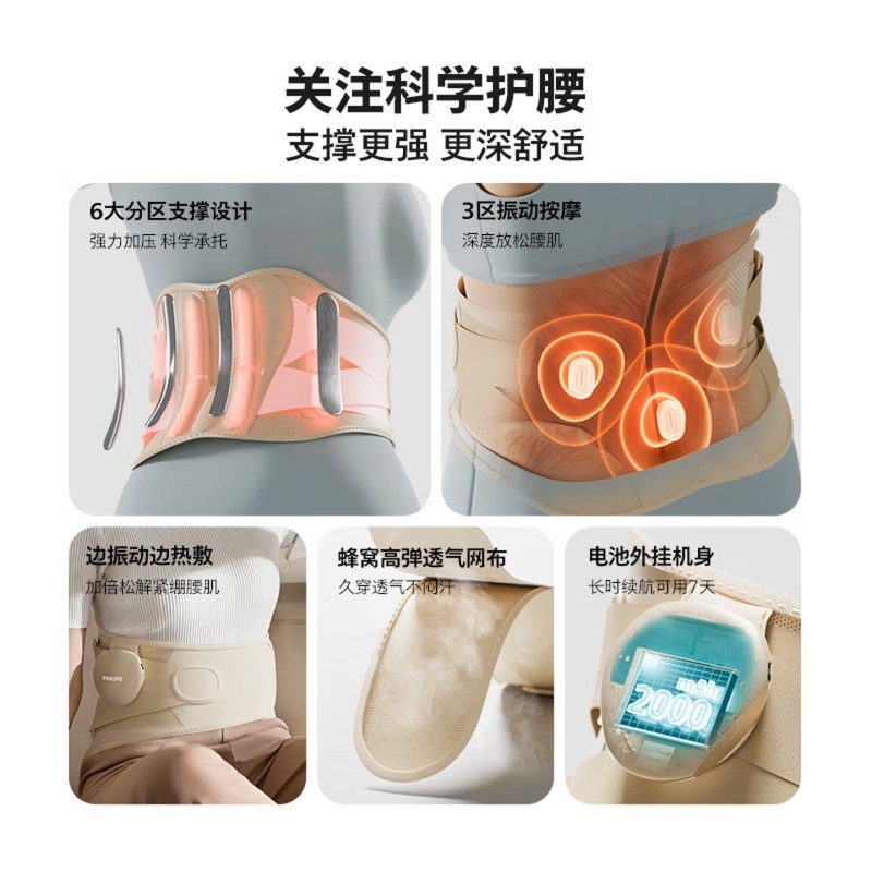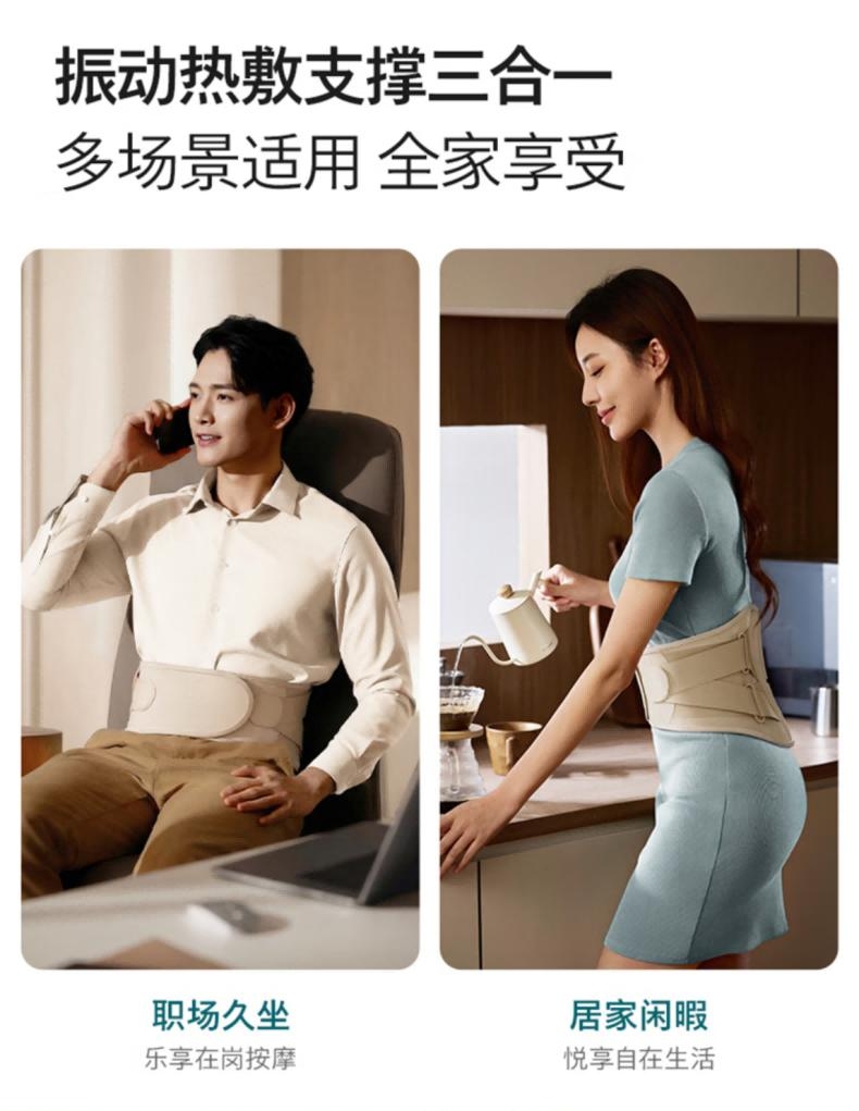 振动按摩+热敷+立体支撑,缓解久坐腰腹酸痛;内置电池,无束缚,居家/办公/出行皆可用;温控精准:3档热敷,促进循环,舒适不烫肤;4区高频振动+4 种模式,贴合肌肉,放松更到位;轻薄透气:高弹面料贴合不勒,可拆卸支撑条