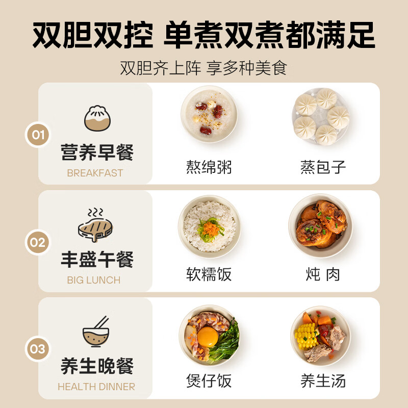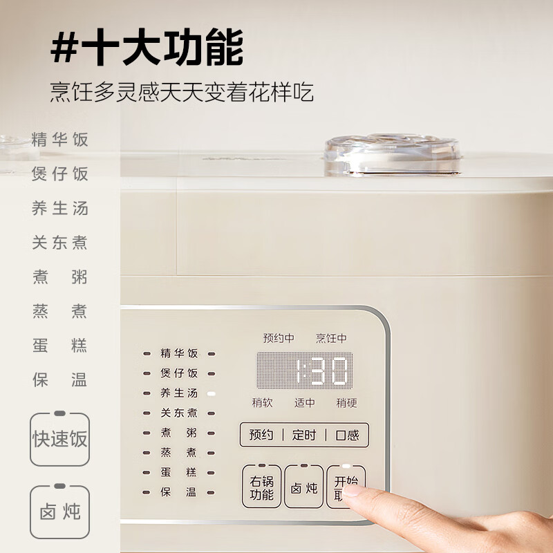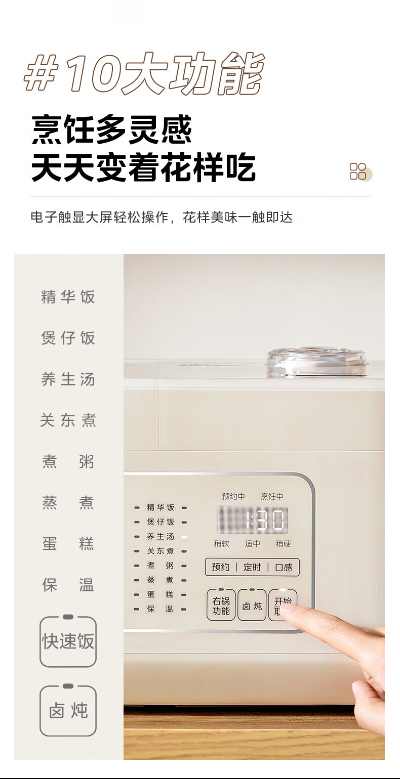 双胆双控, 单煮双煮自由选;10大烹饪功能, 美味一触即达;纯净白玉晶釜, 健康耐磨不粘