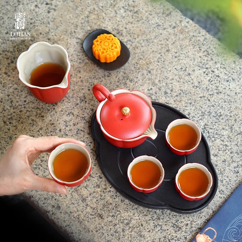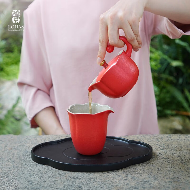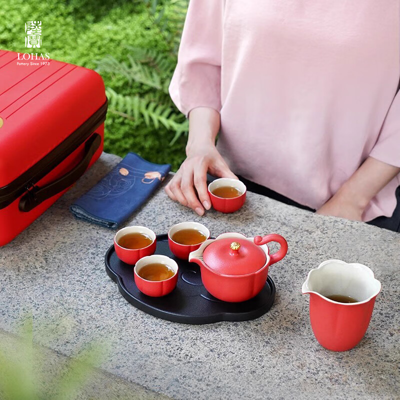 手雕与描金塑造盛放花姿;茶杯底部浮雕「吉」字;多用旅行箱,既能收纳茶器,也可做行李箱使用