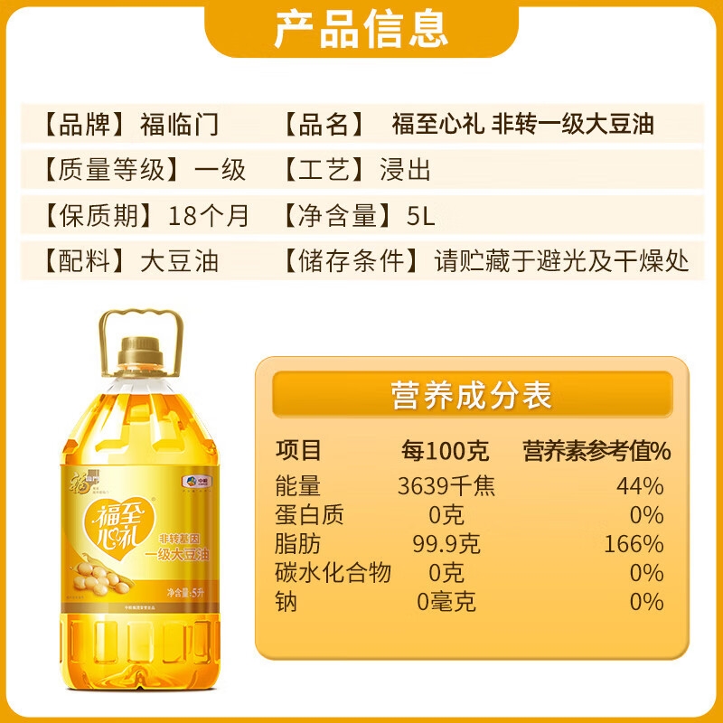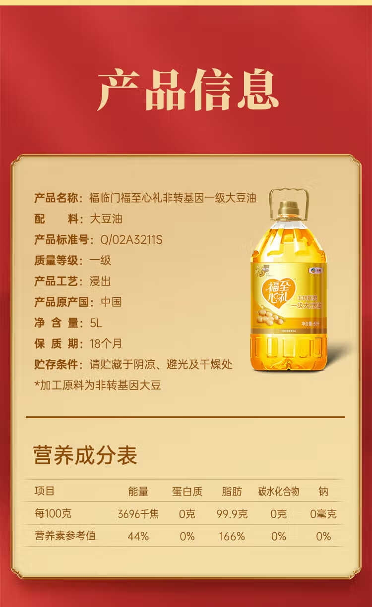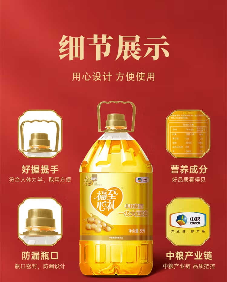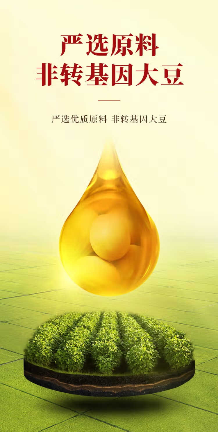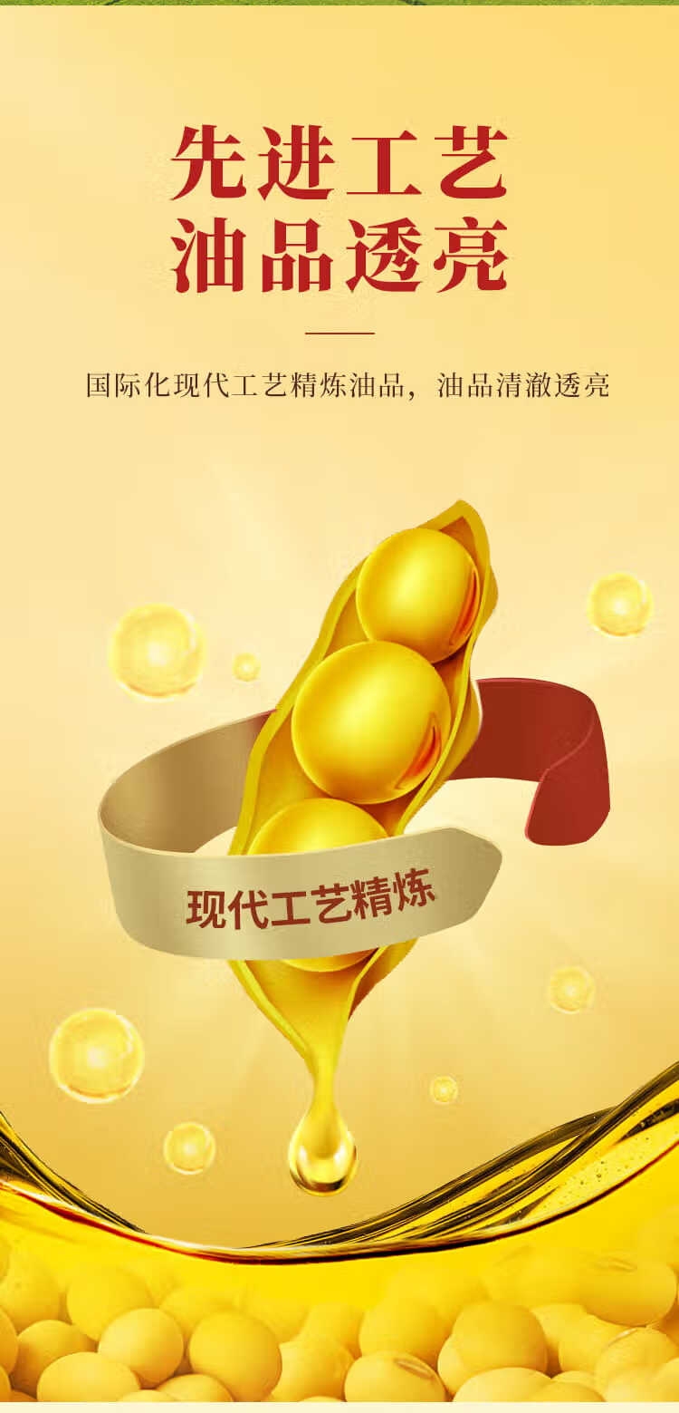 .严选非转基因大豆原料;采用国际化现代工艺精炼油品;清澈透亮煎炒少油烟