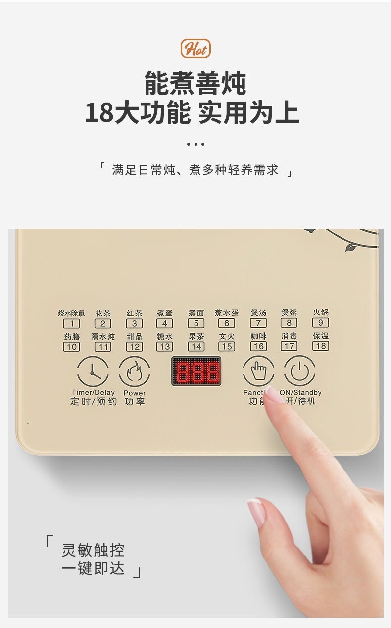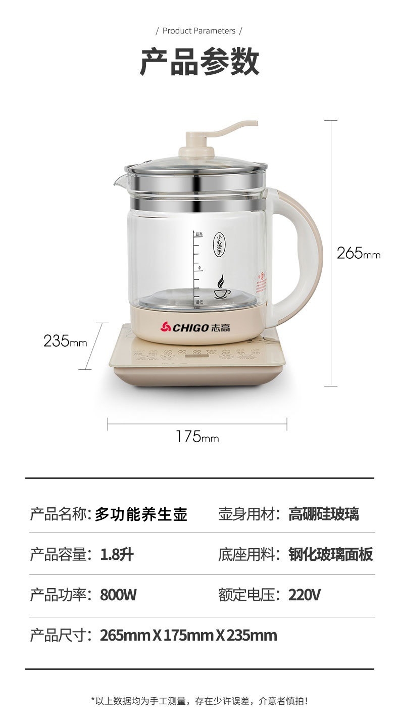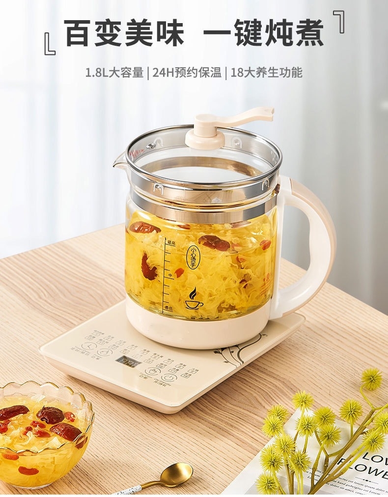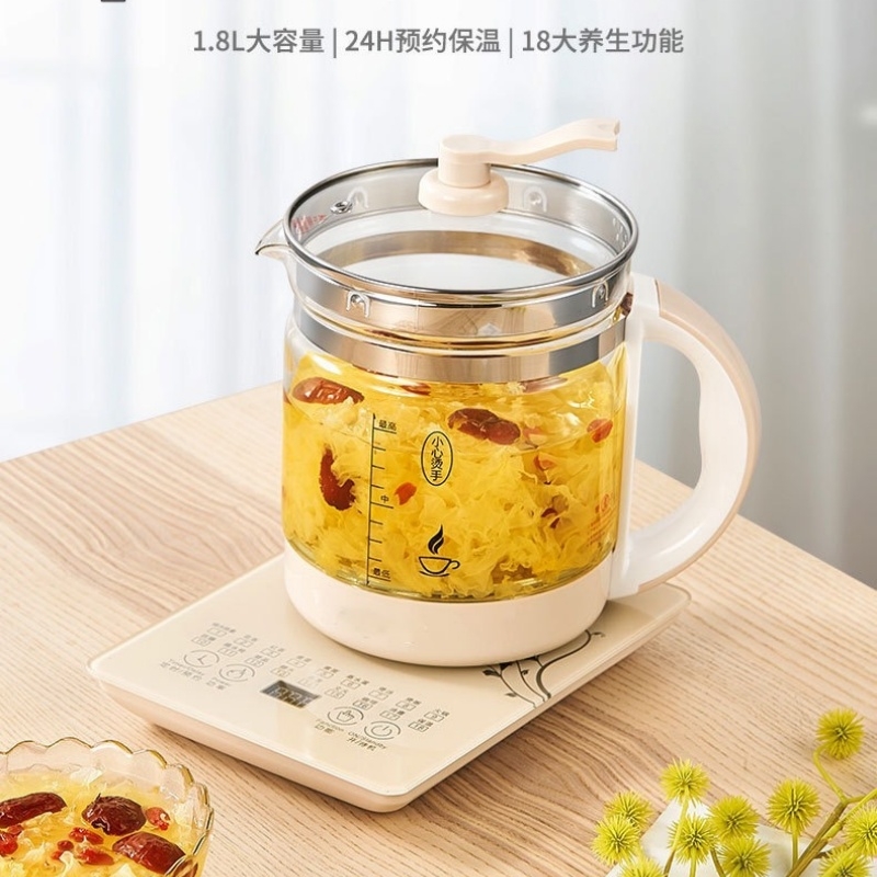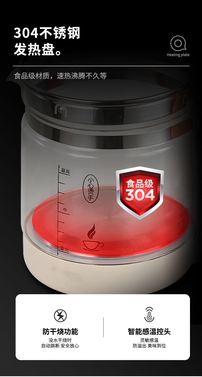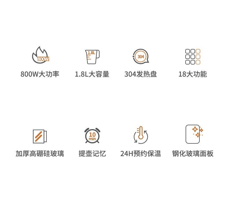 1.8L大容量;304发热盘 加厚高硼硅玻璃;提壶记忆 24小时保温 钢化玻璃面板