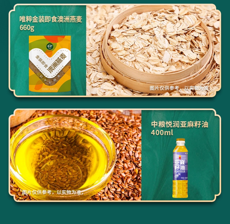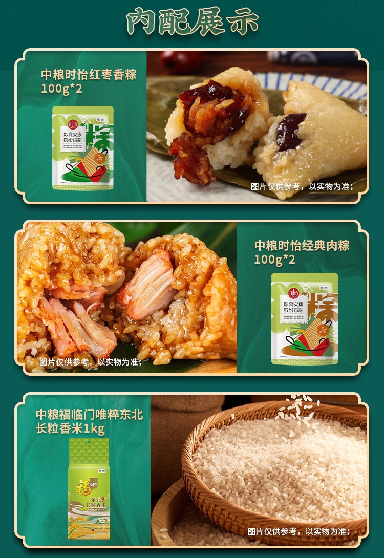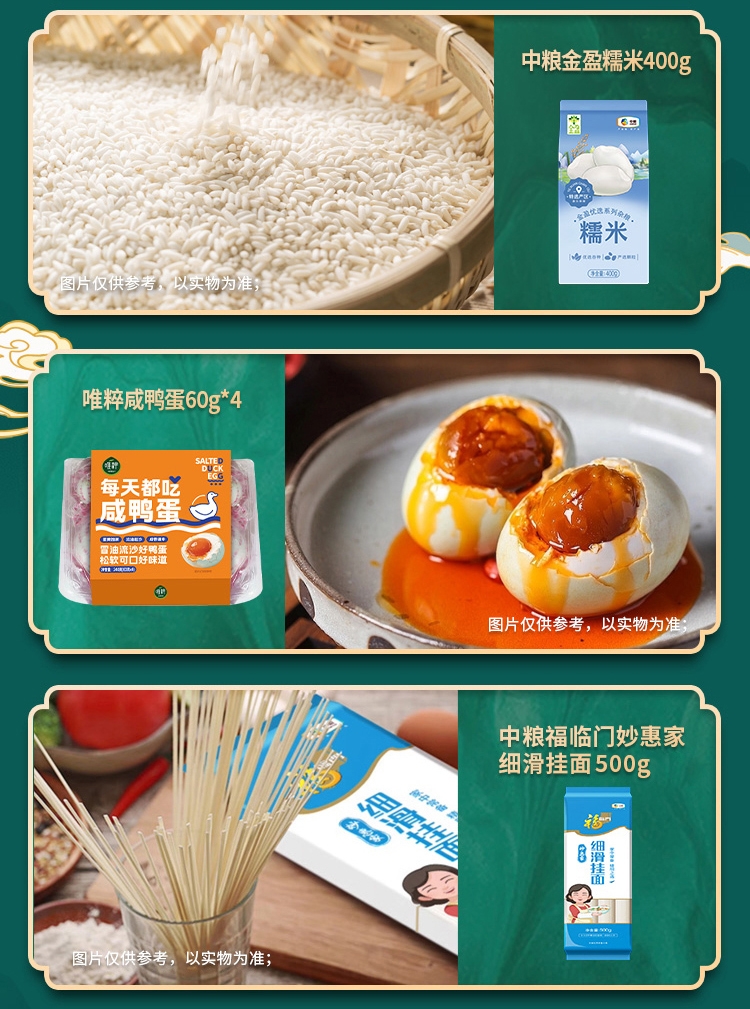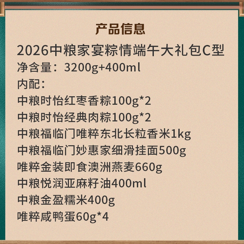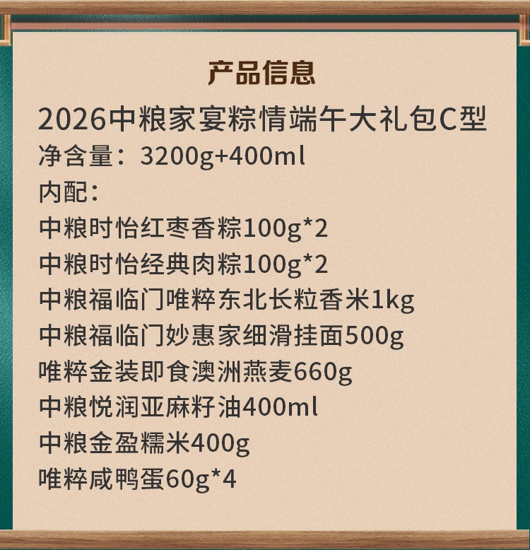 配置清单:净含量:3200g+400ml 内配: 中粮时怡红枣香粽100g*2 中粮时怡经典肉粽100g*2 中粮福临门唯粹东北长粒香米1kg 中粮福临门妙惠家细滑挂面500g 唯粹金装即食澳洲燕麦660g 中粮悦润亚麻籽油400ml 中粮金盈糯米400g 唯粹咸鸭蛋60g*4