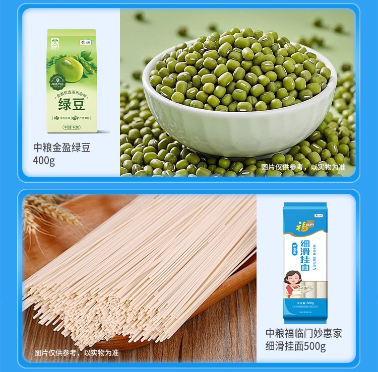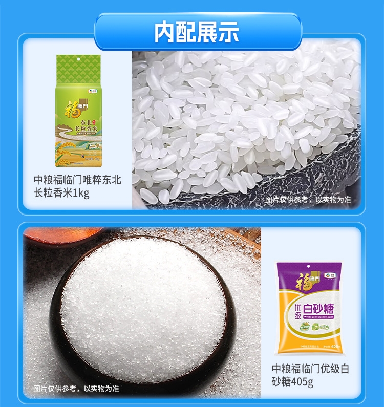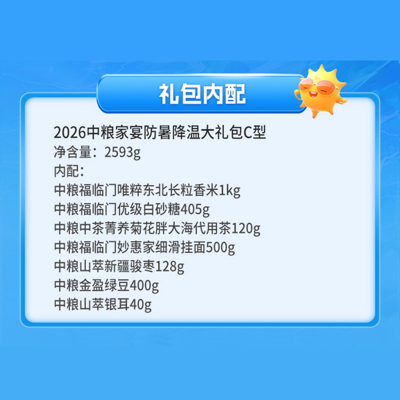 配置清单:净含量:2593g 内配: 中粮福临门唯粹东北长粒香米1kg 中粮福临门优级白砂糖405g 中粮中茶菁养菊花胖大海代用茶120g 中粮福临门妙惠家细滑挂面500g 中粮山萃新疆骏枣 128g 中粮金盈绿豆400g 中粮山萃银耳40g
