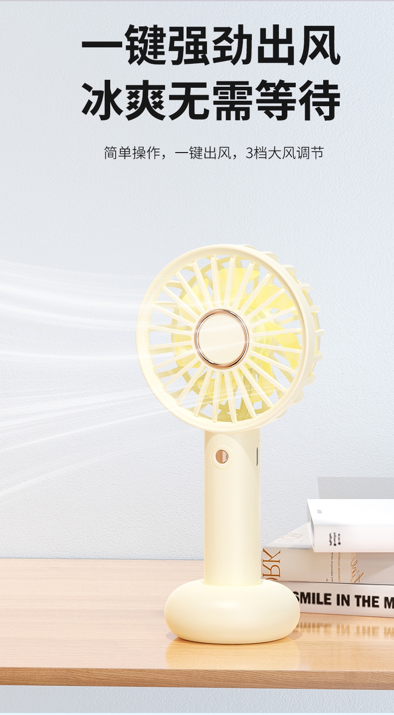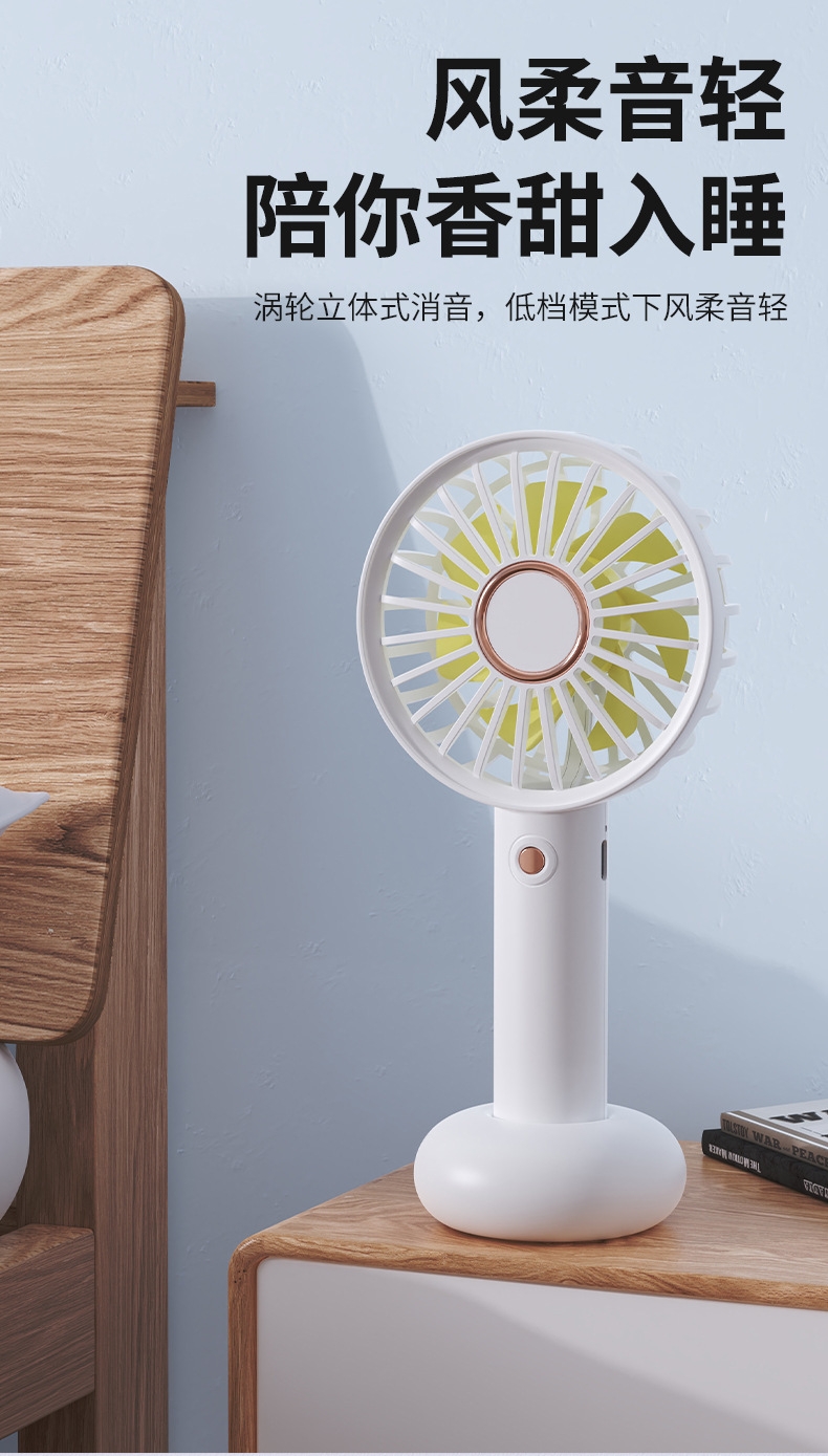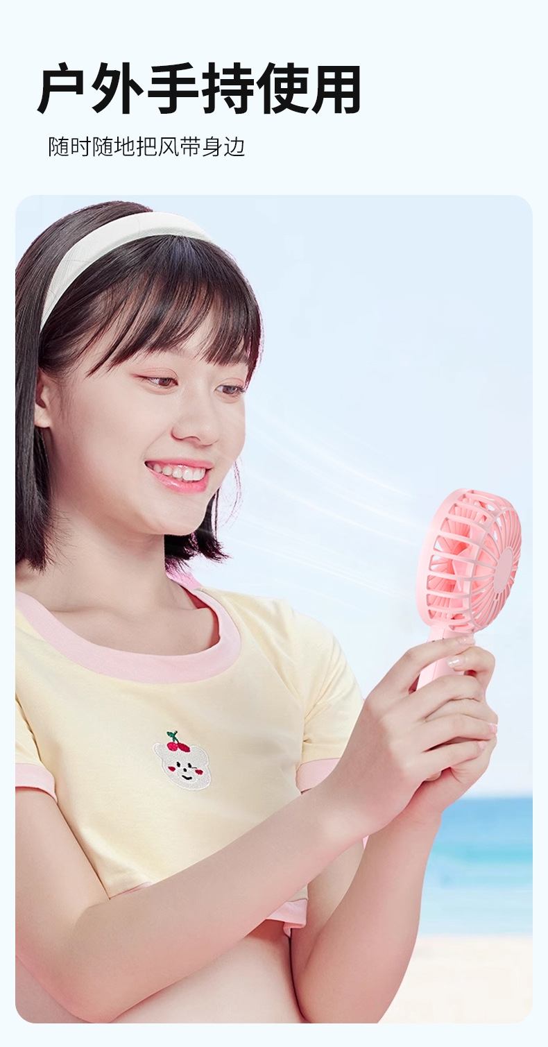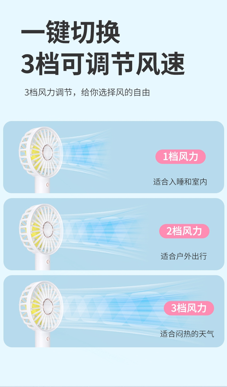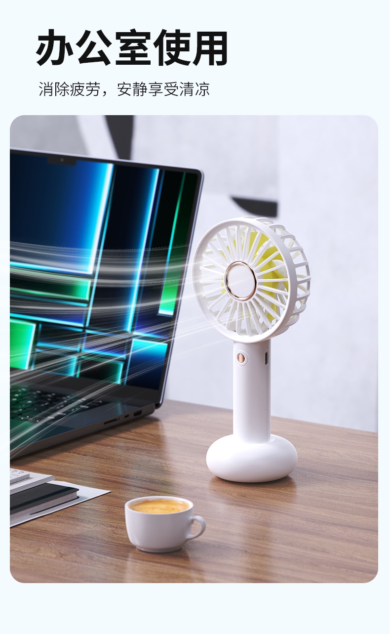 模拟自然风,畅爽清凉,轻音柔风,小巧便携;带底座,一物多用,三档风速;手持/桌面/户外