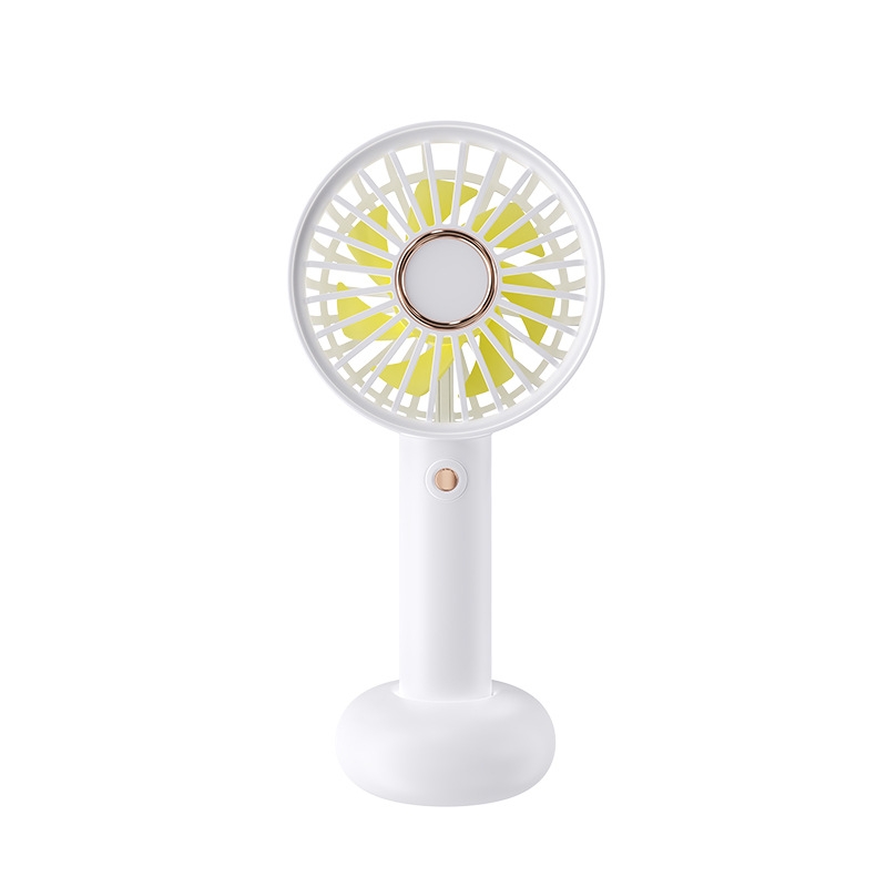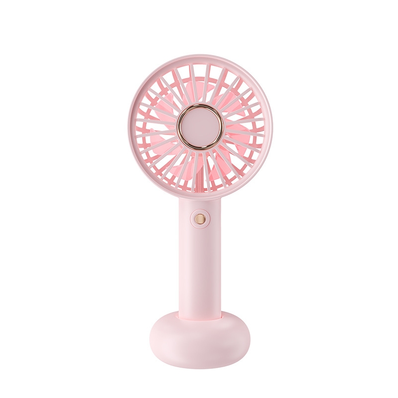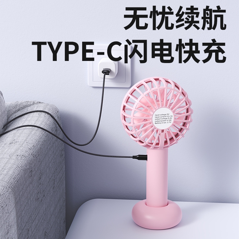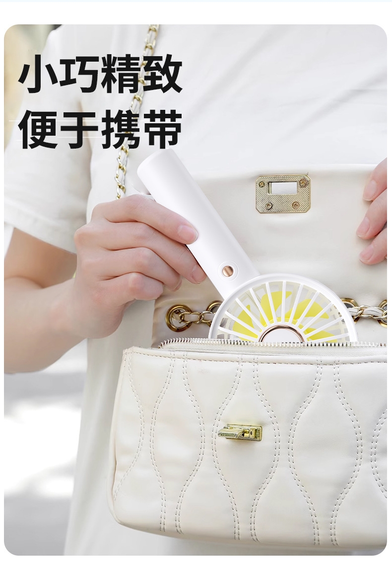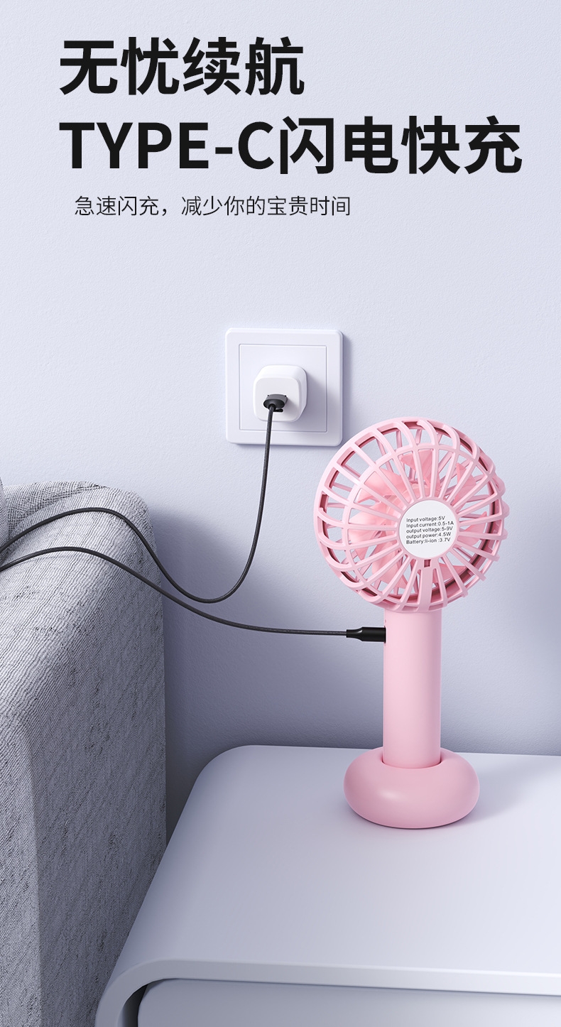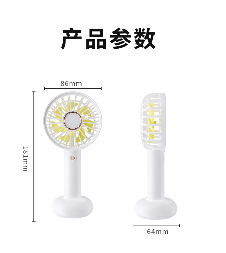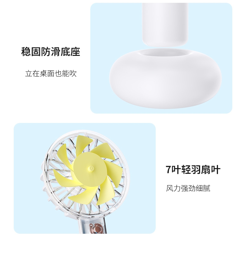 模拟自然风,畅爽清凉,轻音柔风,小巧便携;带底座,一物多用,三档风速;手持/桌面/户外