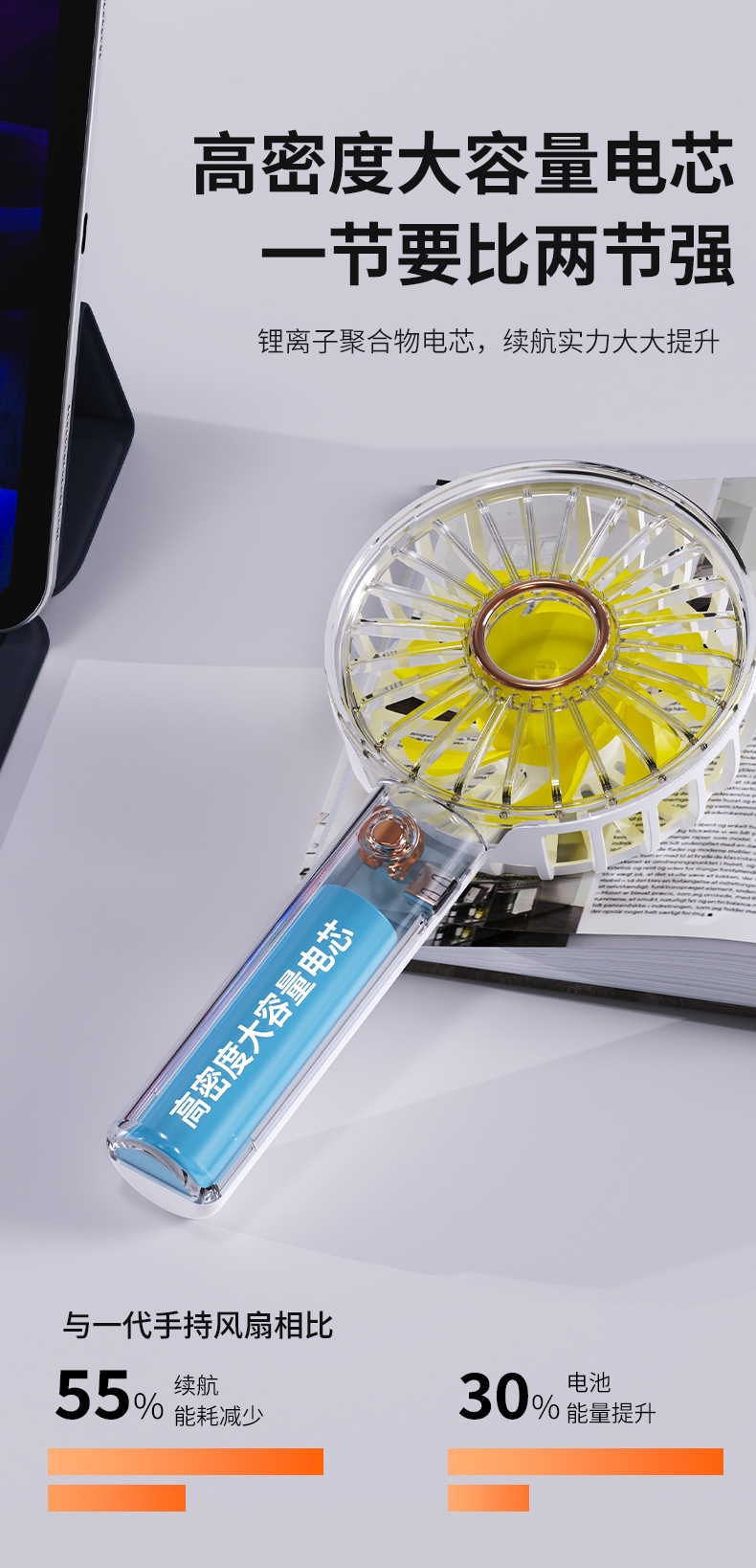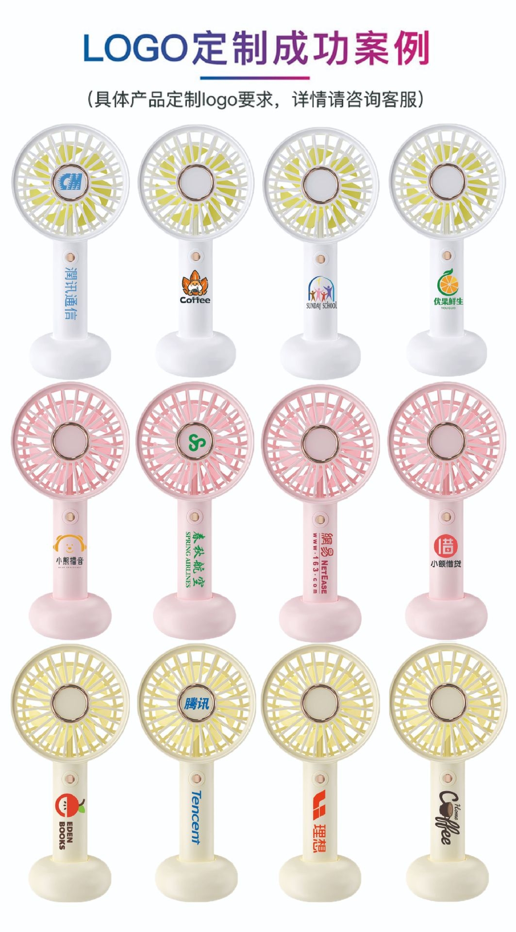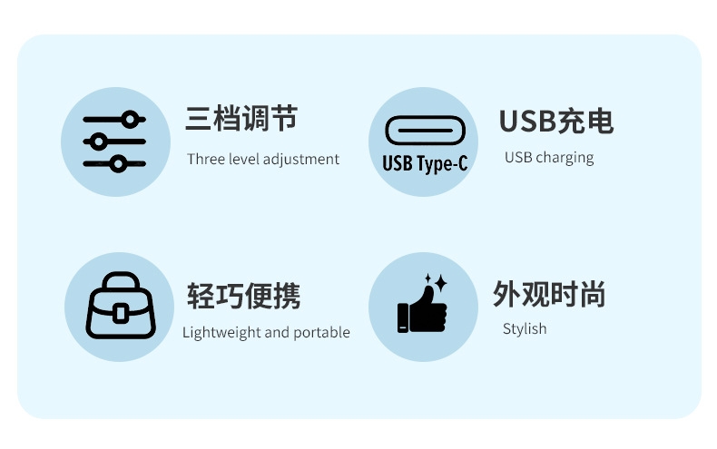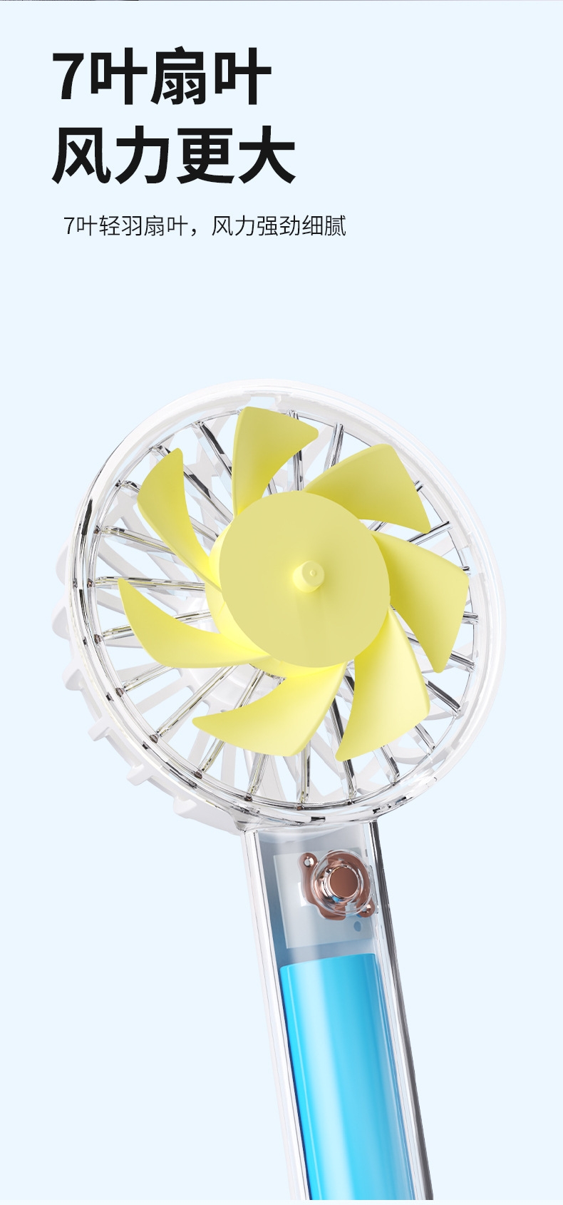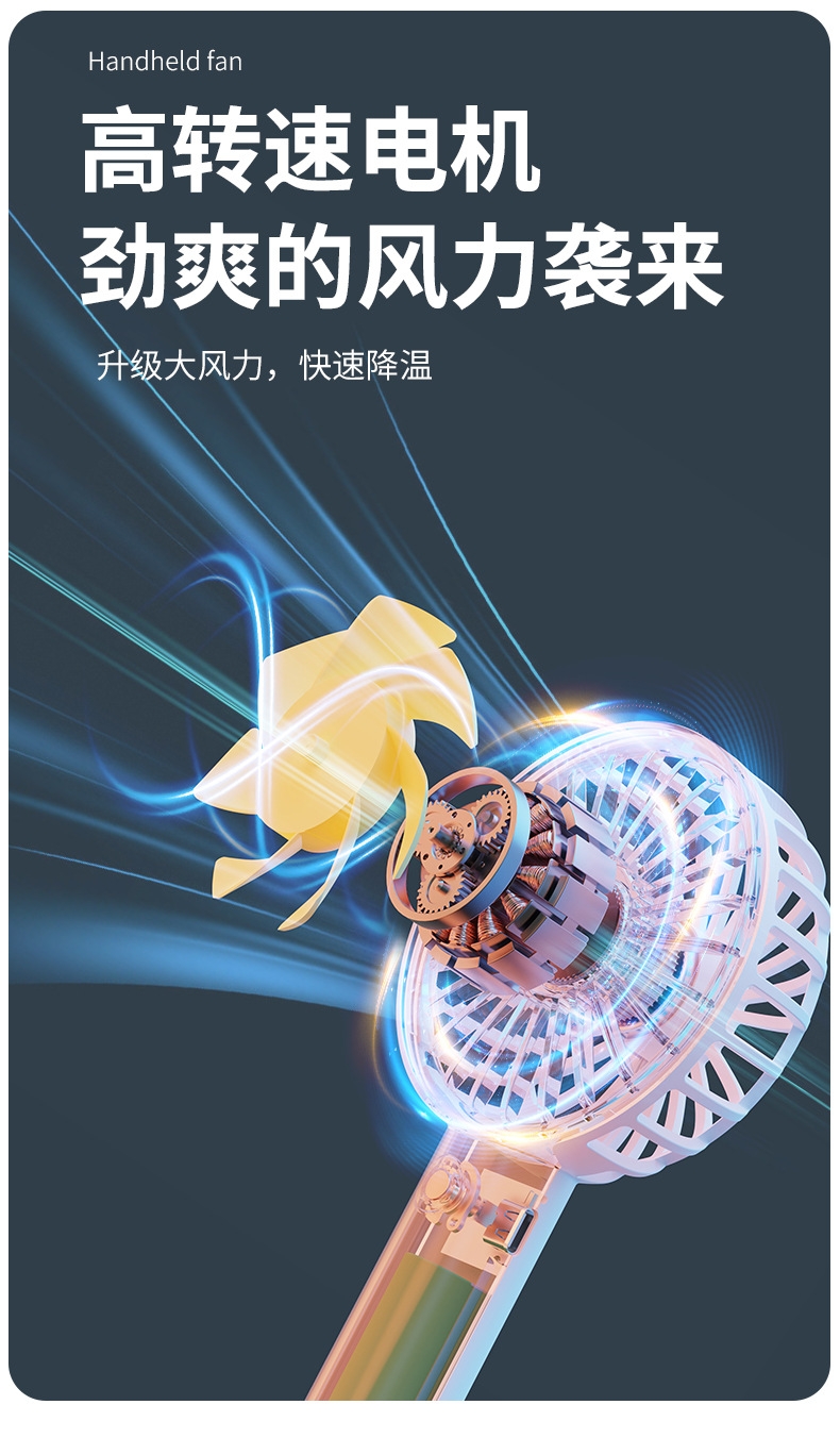 模拟自然风,畅爽清凉,轻音柔风,小巧便携;带底座,一物多用,三档风速;手持/桌面/户外