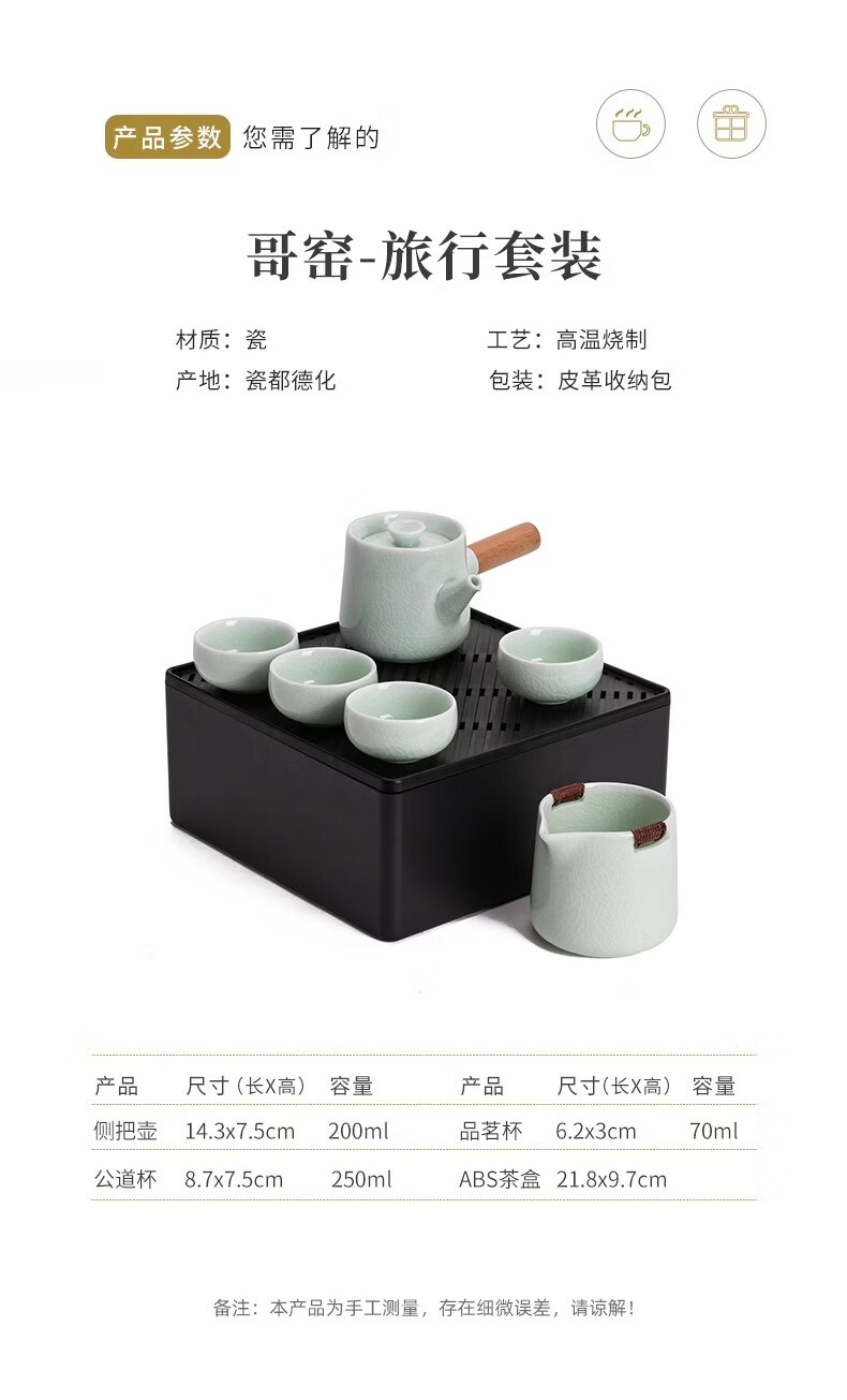 配置清单:1壶,1公道杯,4茶杯,1茶盘,旅行包