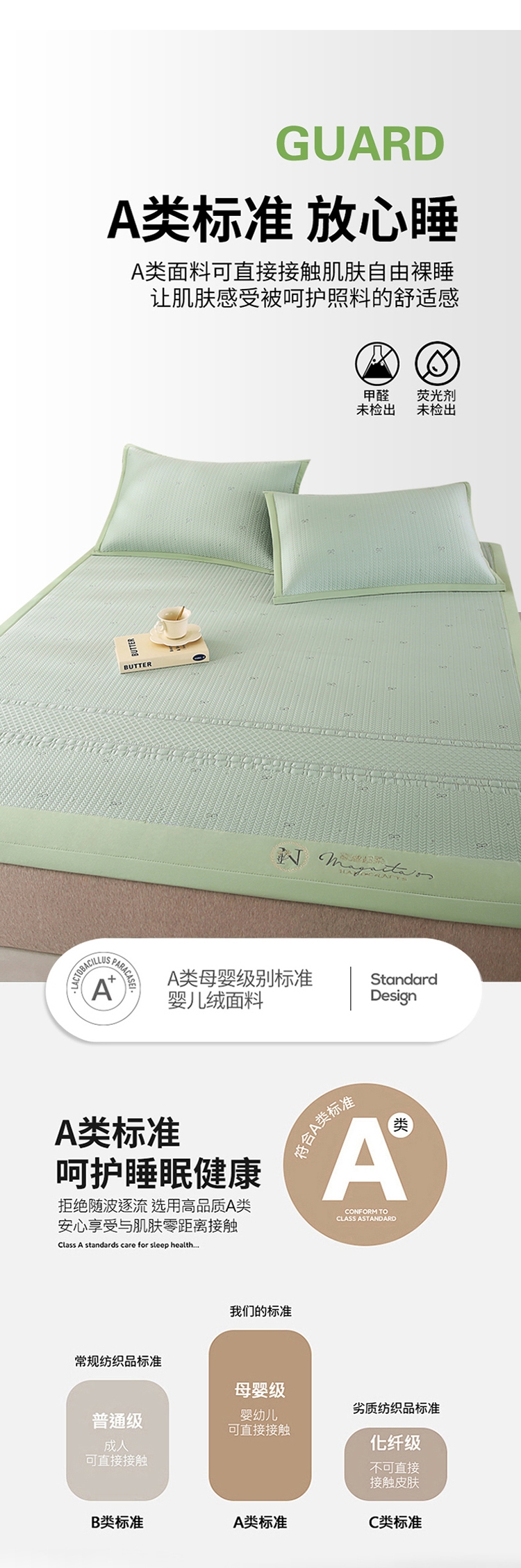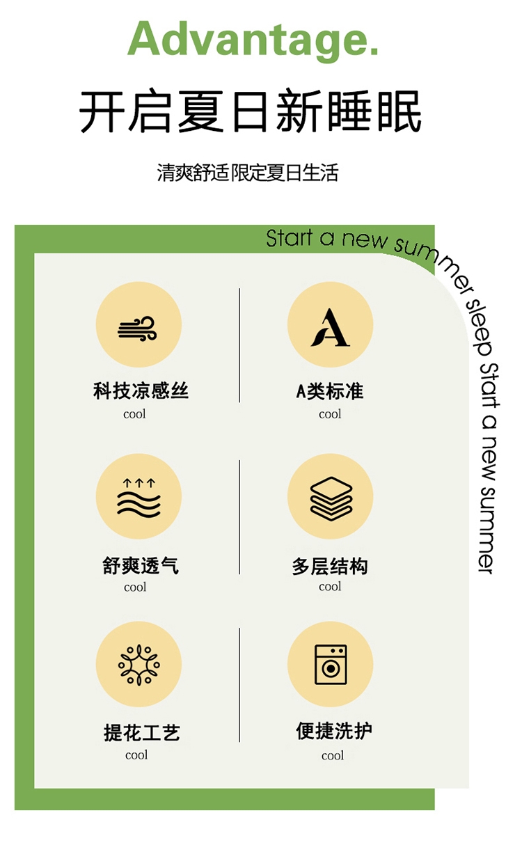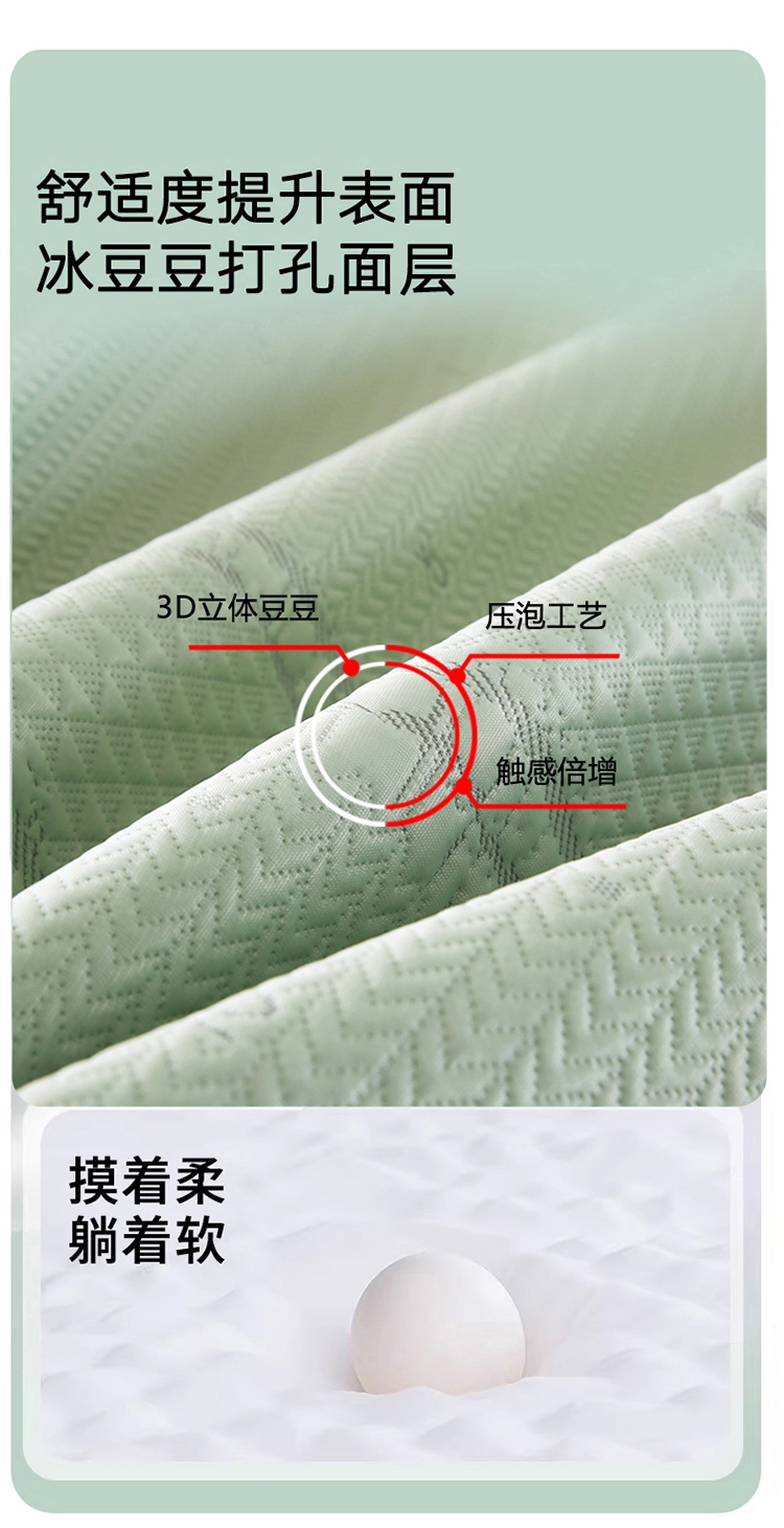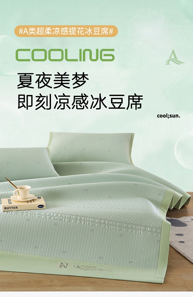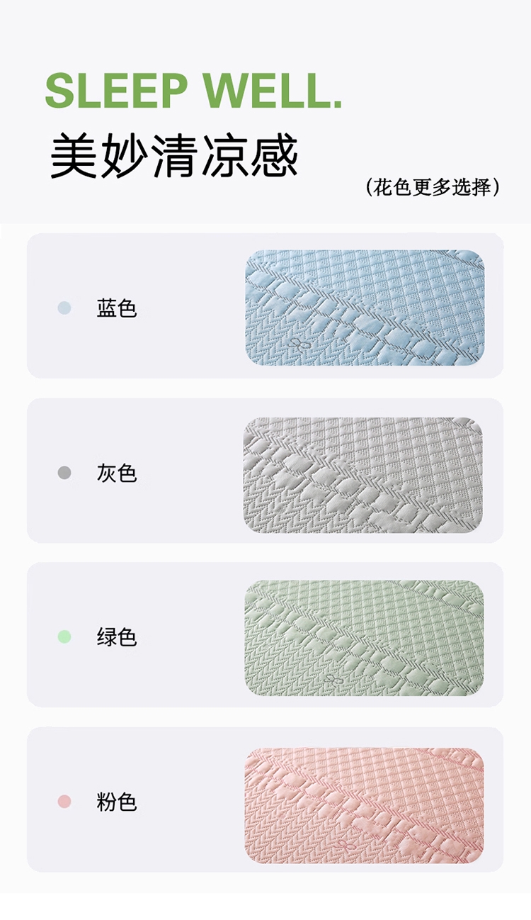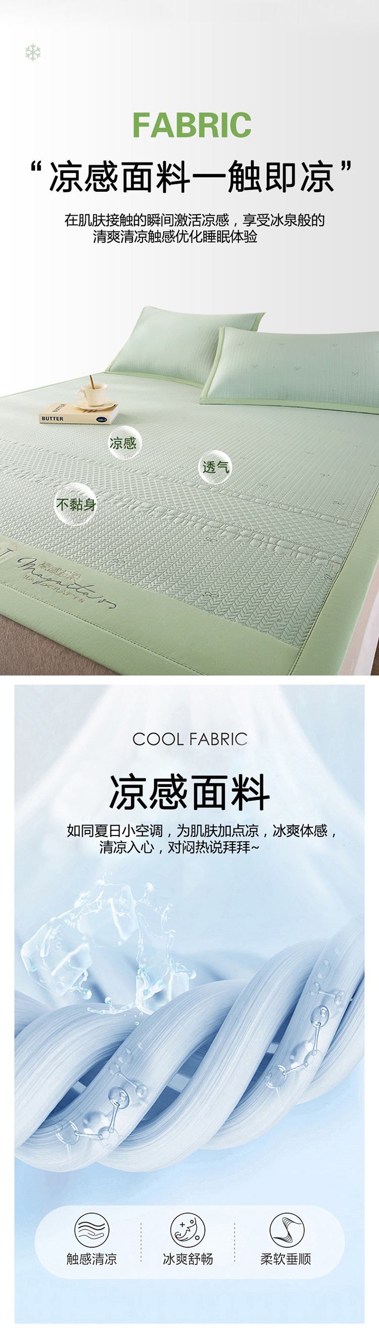 凉感面料一触即凉 在肌肤接触的瞬间激活凉感。;时髦提花点缀凉席,床品层次分明。;蜂窝三明治透气网孔,快速吸湿透气保持席面舒适。