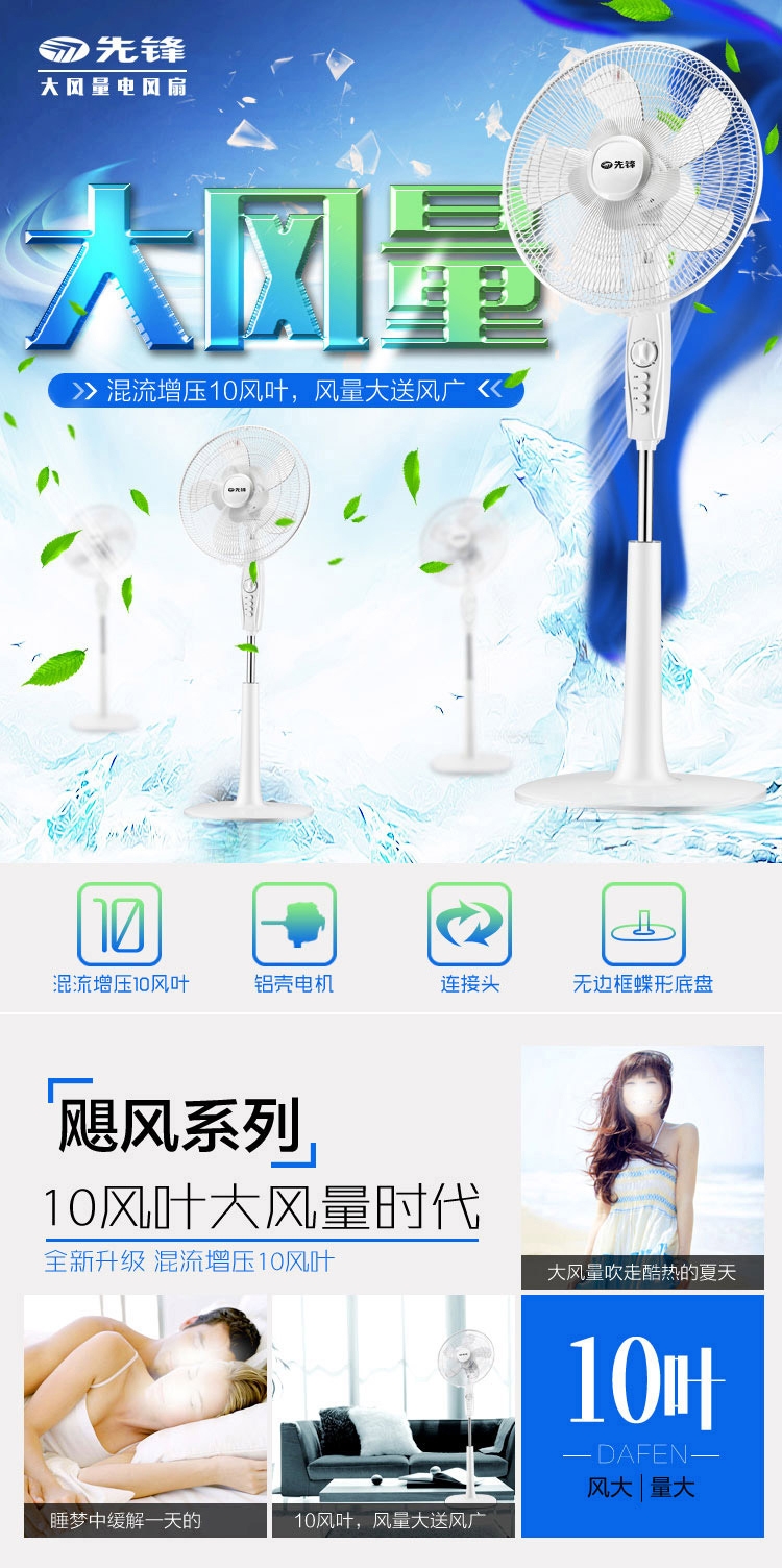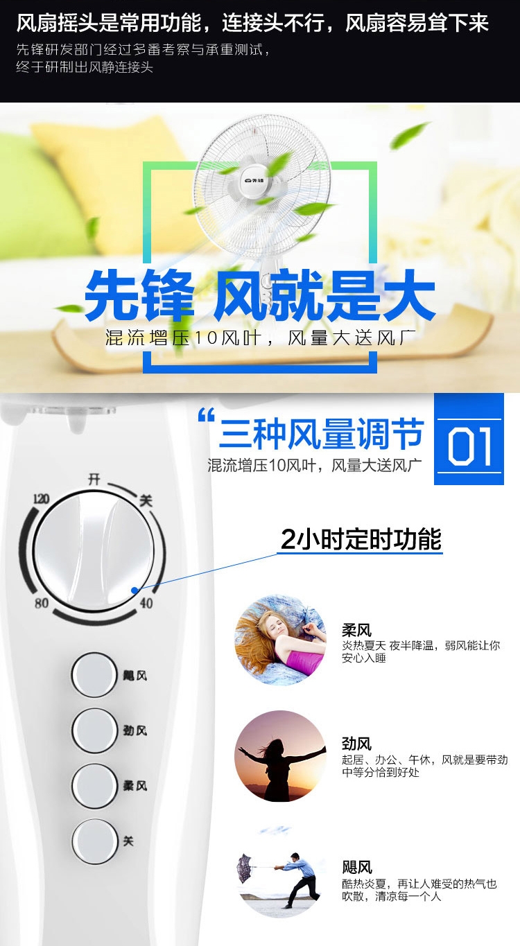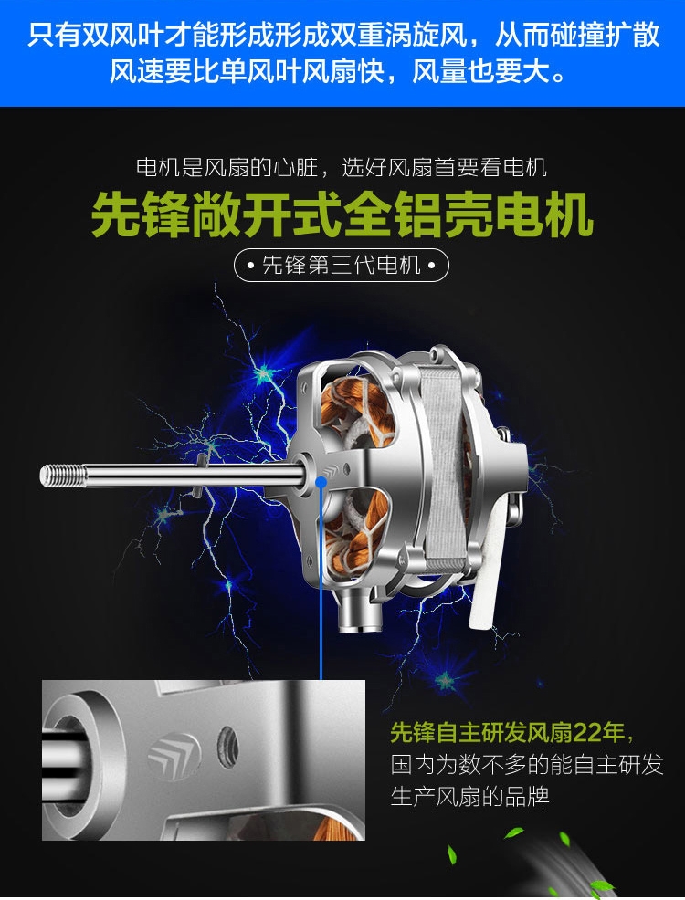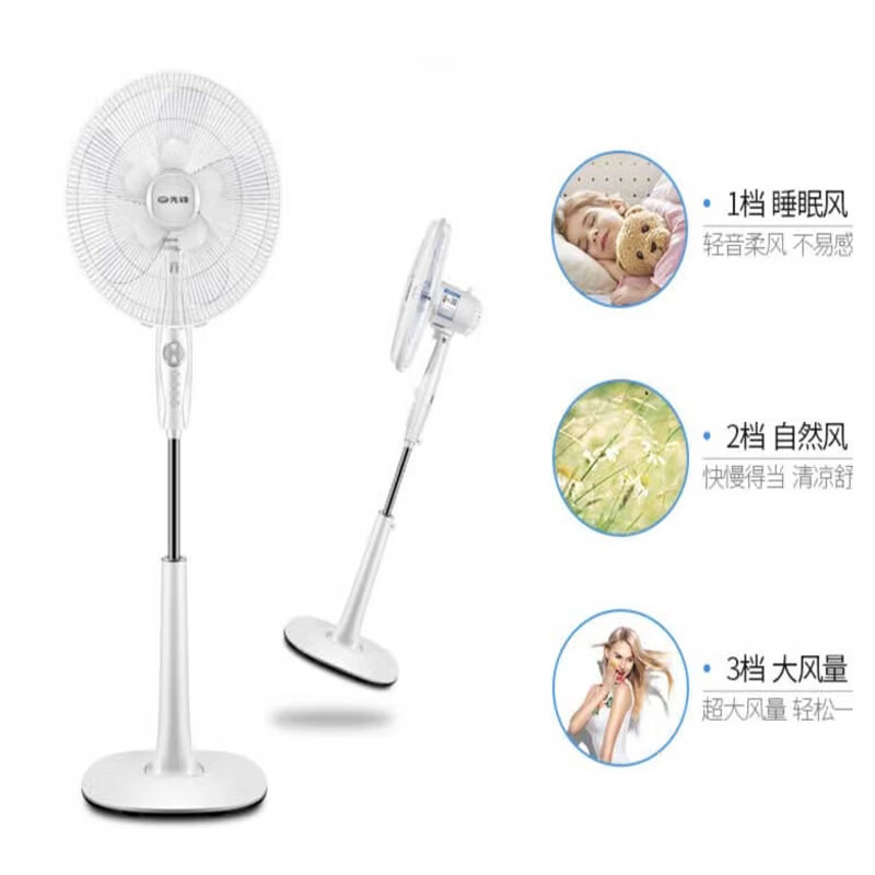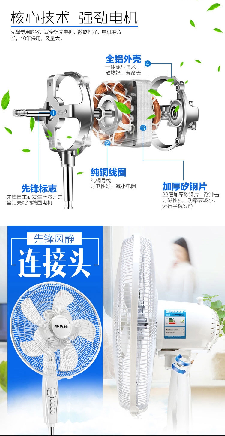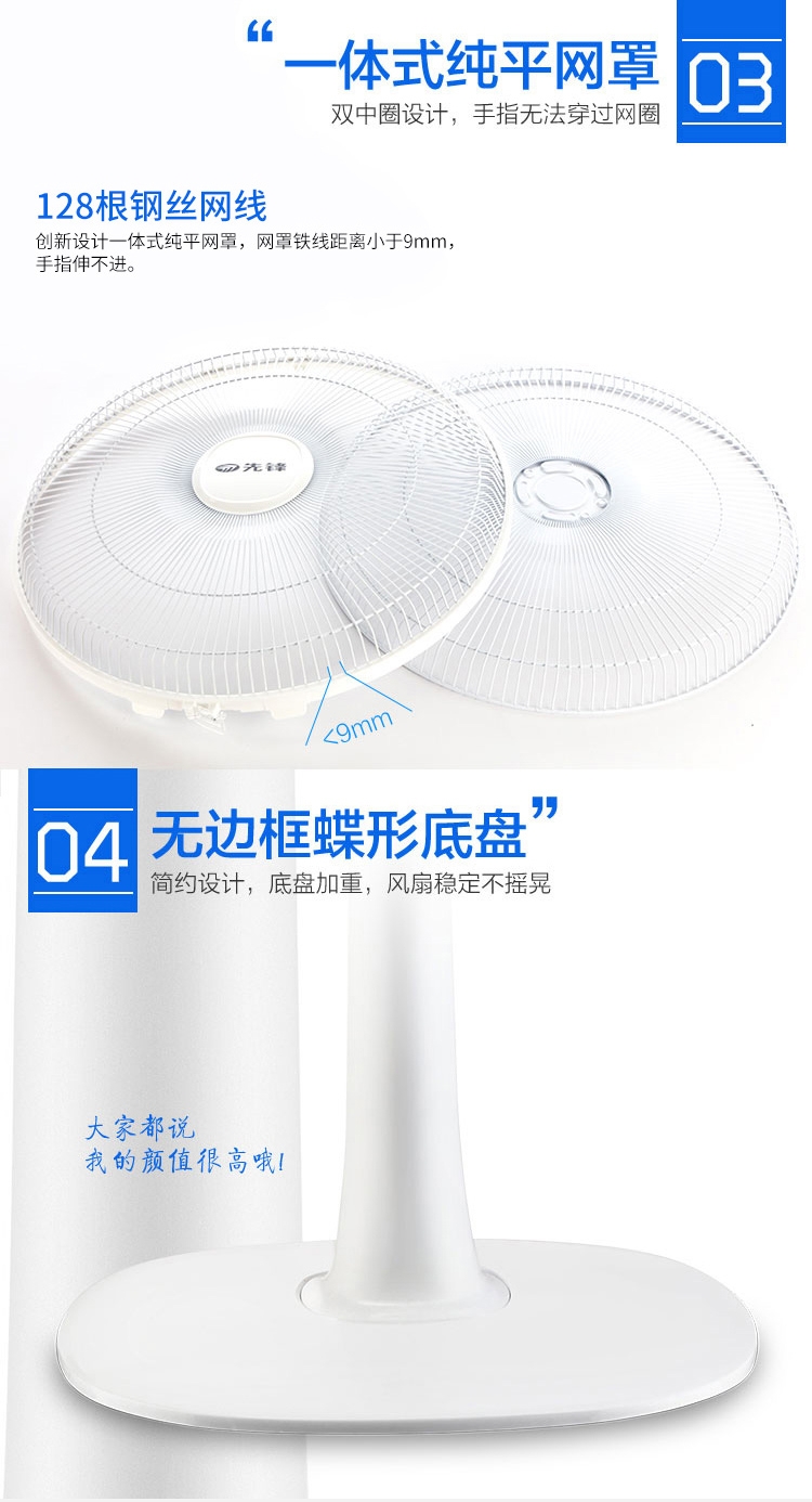 双层风叶,一层送大风,一层送柔风;高颜值,一体式纯平网罩,无边框蝶形底盘;高效电机:纯铜线圈电机,高效散热,风力强劲,持久耐