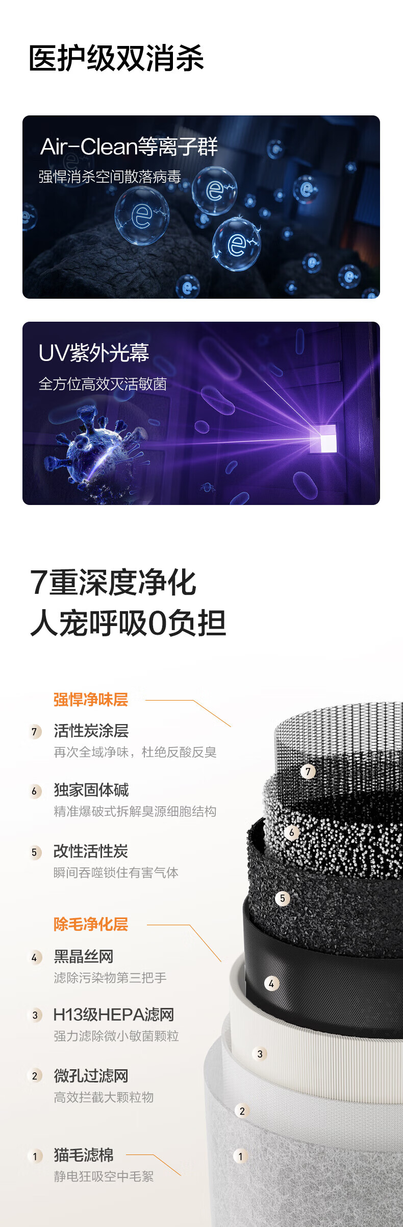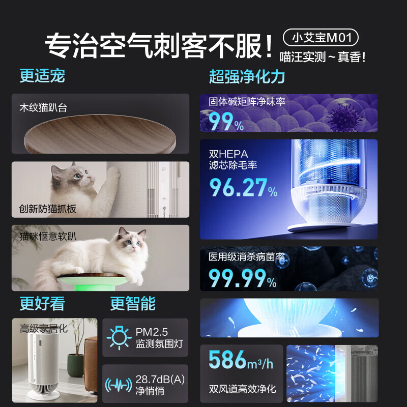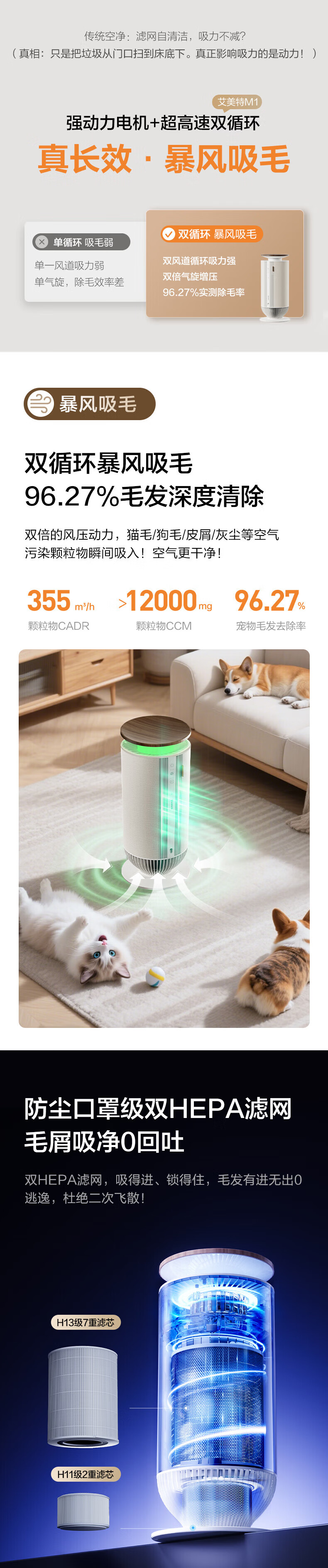 宠物,猫毛,随便吸附;双循环气流风,360度无死角;H13级滤网,过滤颗粒物