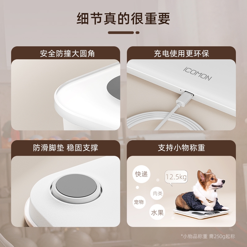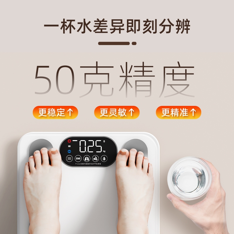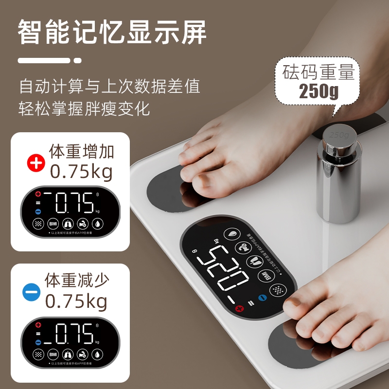 配置清单:材质:不锈钢电极+钢化玻璃+ABS 显示:LED 底部结构:回字形结构 电源:300mAh 充电锂电池 连接:蓝牙 测脂方案:交流 产品尺寸:260*260*23mm 产品净重:1.2kg 称量范围:0.25-180kg ; 分度值:50g 包装方式:彩盒