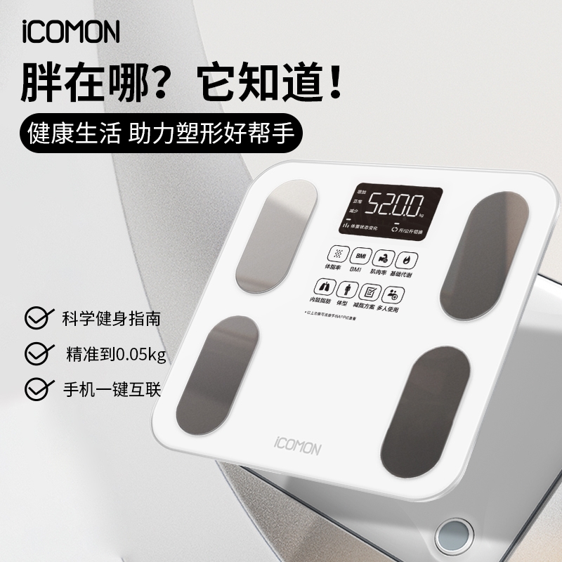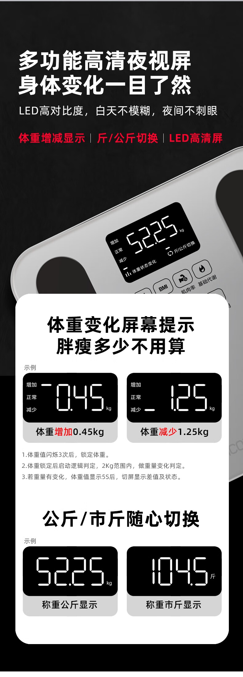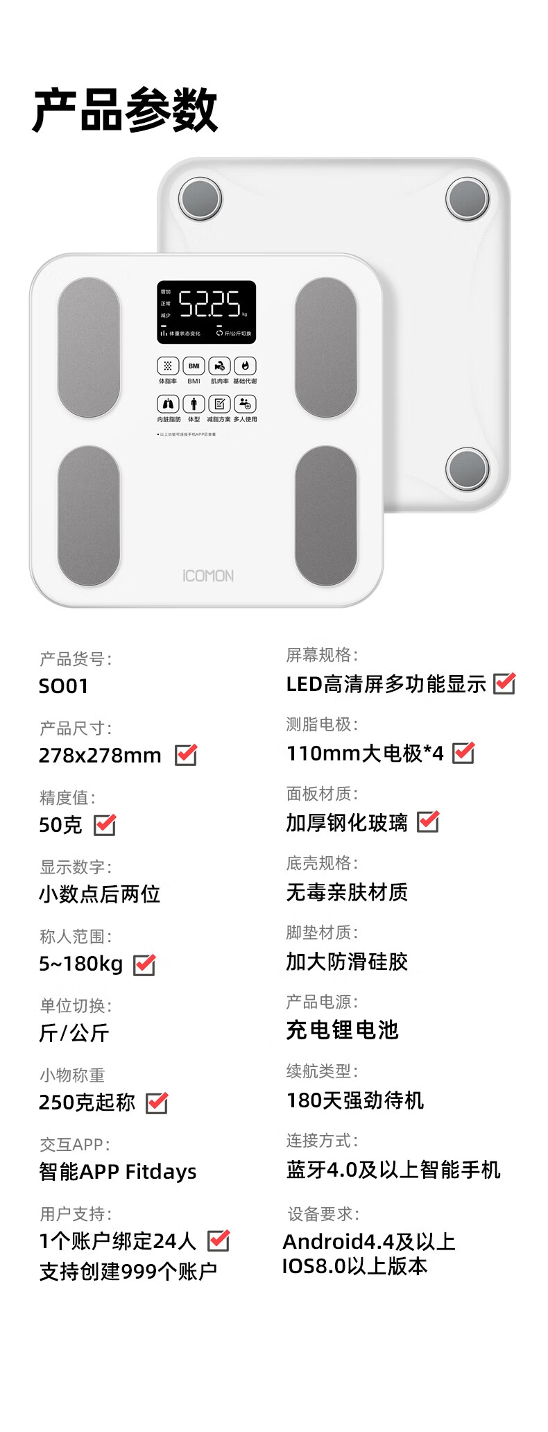 配置清单:材质:不锈钢电极+钢化玻璃+ABS 显示:LED 底部结构:全包底结构 电源:300mAh 充电锂电池 连接:蓝牙 产品尺寸:278*278*23mm; 产品净重:1.5kg 称量范围:0.25-180kg ;分度值:50g 包装方式:牛卡盒 包装数量:8台/箱