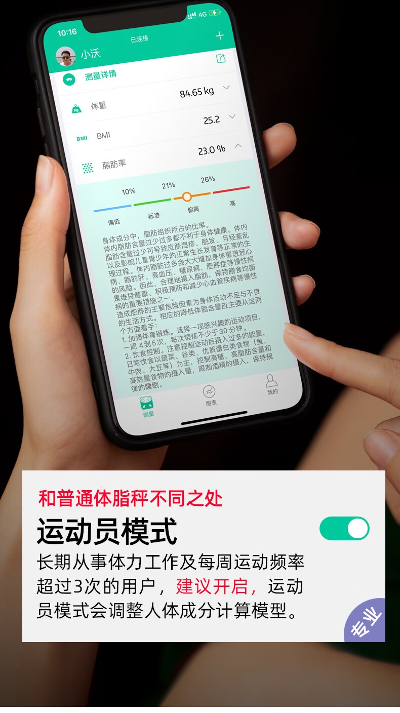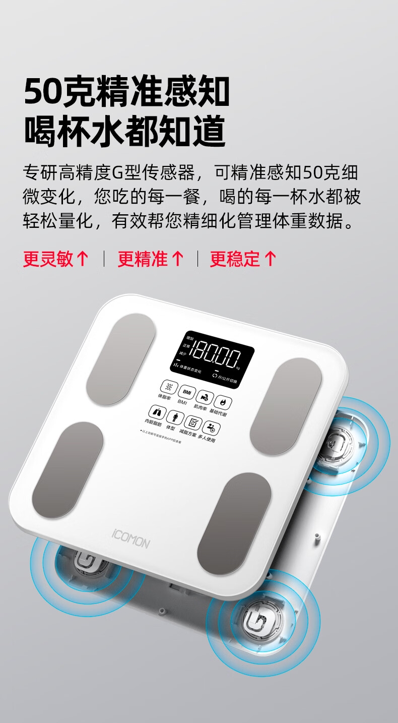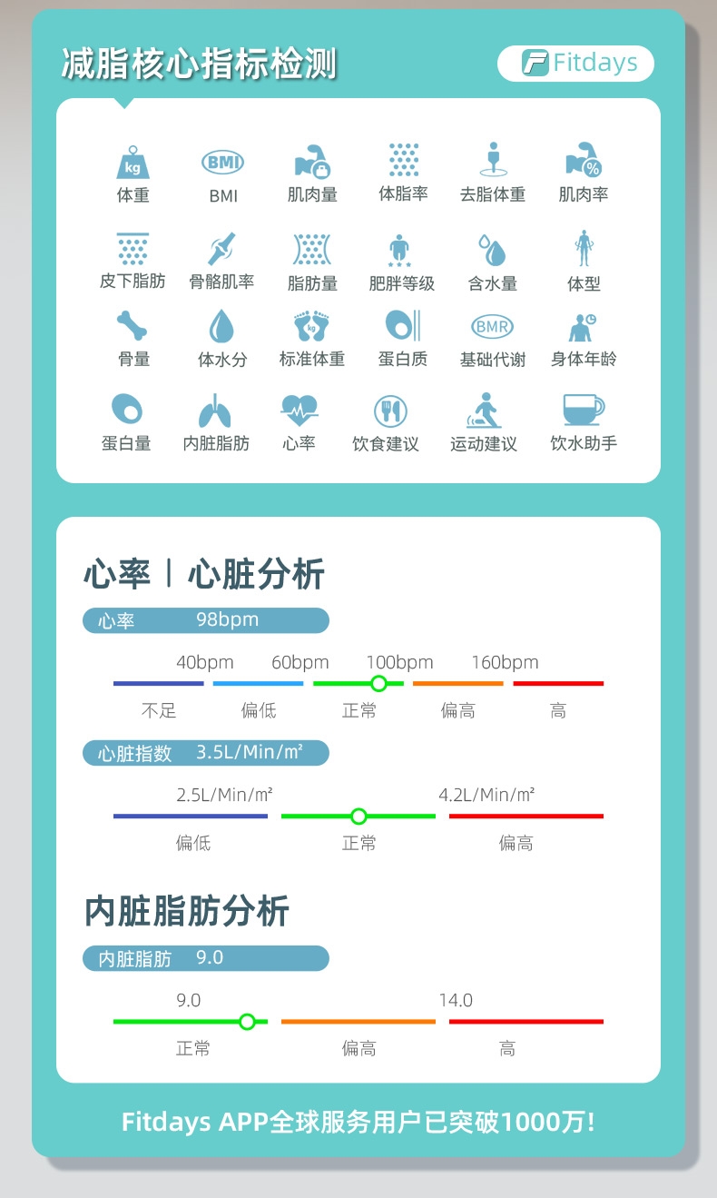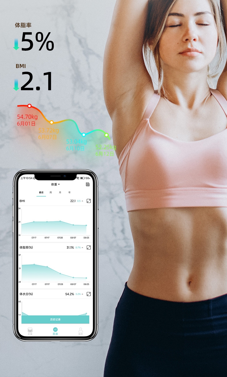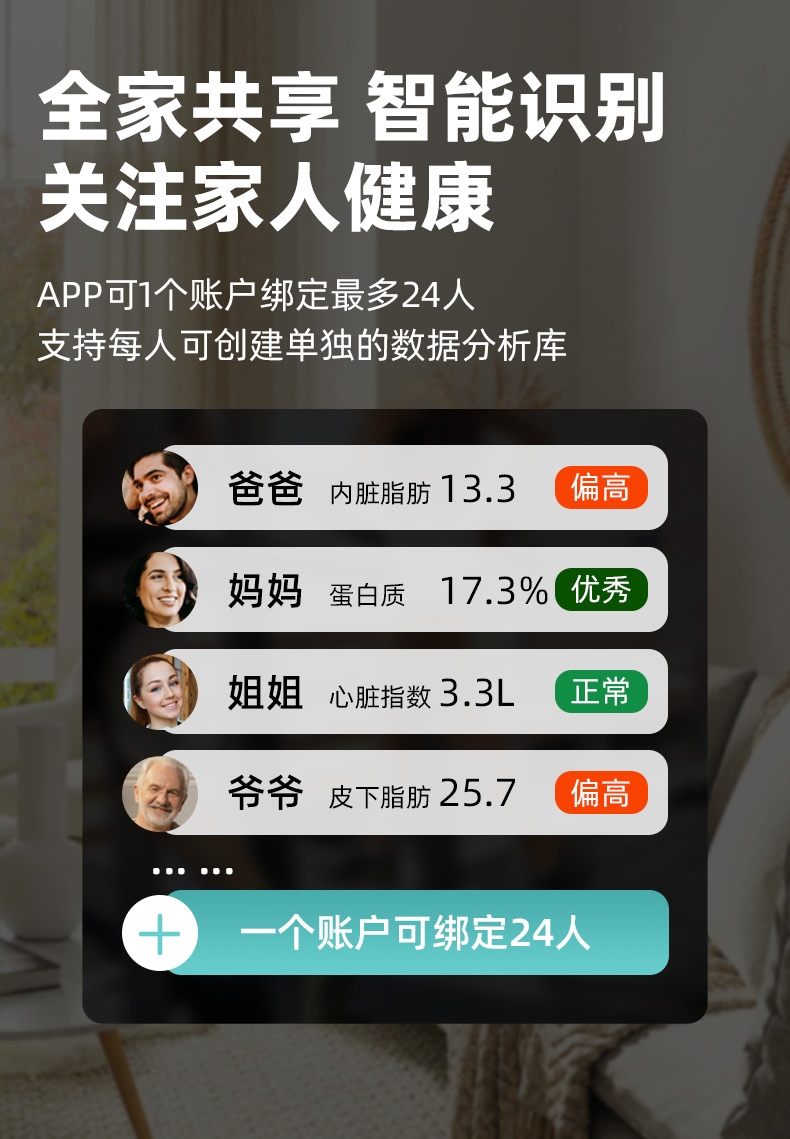 产品可测量20项人体成份:体重、BMI、体脂率、;持24个用户管理,全家健康一步到位,称量结果智能;Type-C快速充电,大容量锂聚合物电池,