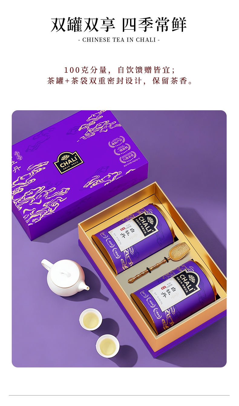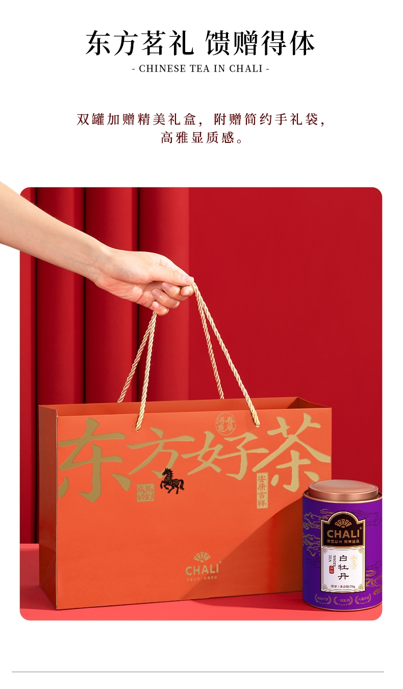 严选特级白牡丹原料,其鲜叶原料嫩度与匀整度皆为上乘;礼盒设计寓意好,包装高档,适合送礼;品质正宗,原料源自福鼎核心产区生态茶园