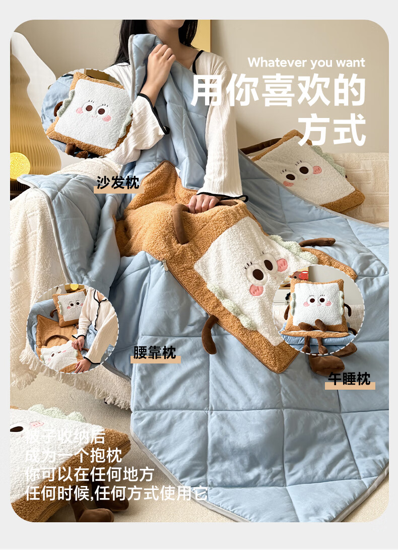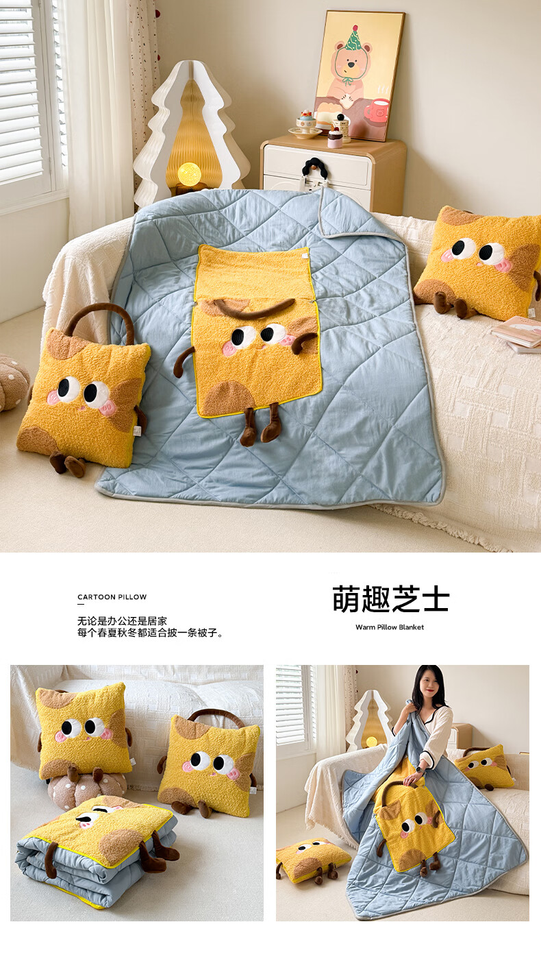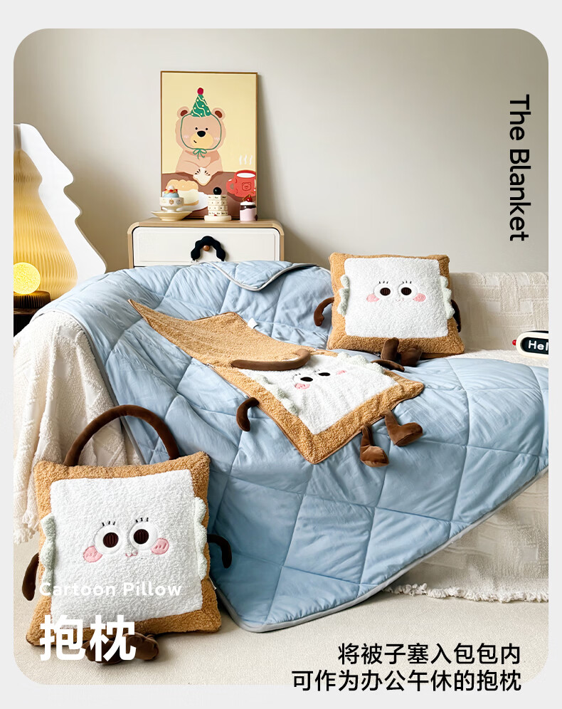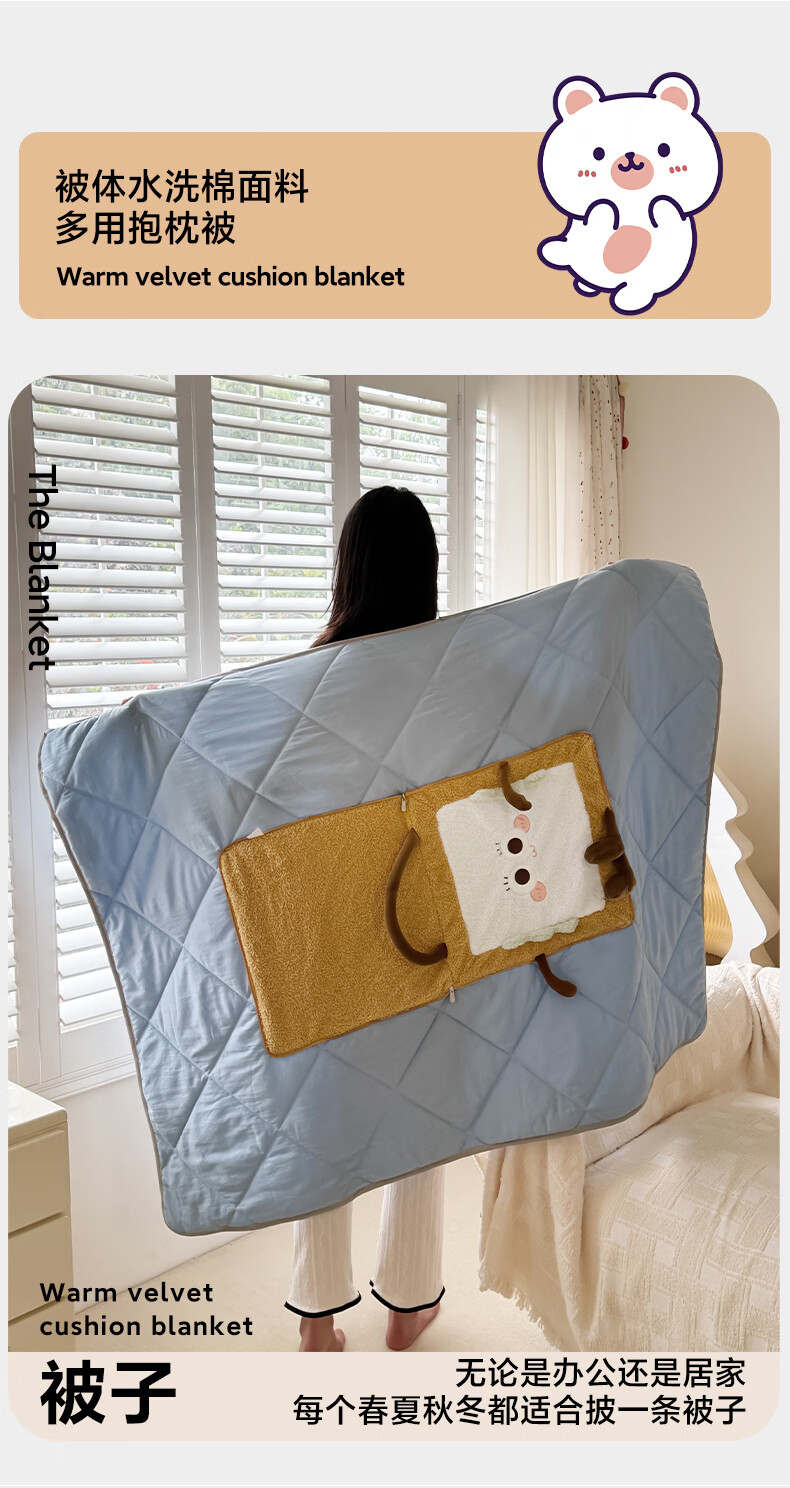 抱枕被设计,一枕多用,可做靠枕,打开可做被子;款式多多的选择,卡通形象;柔软弹力绒面料,不刺激皮肤;软硬适中