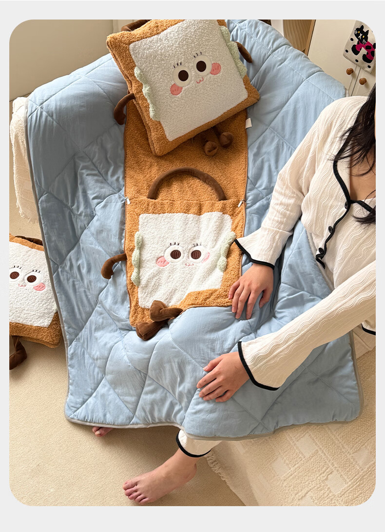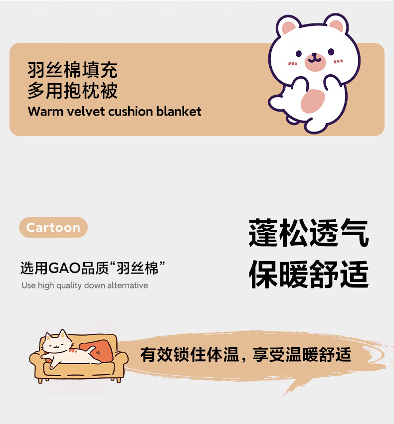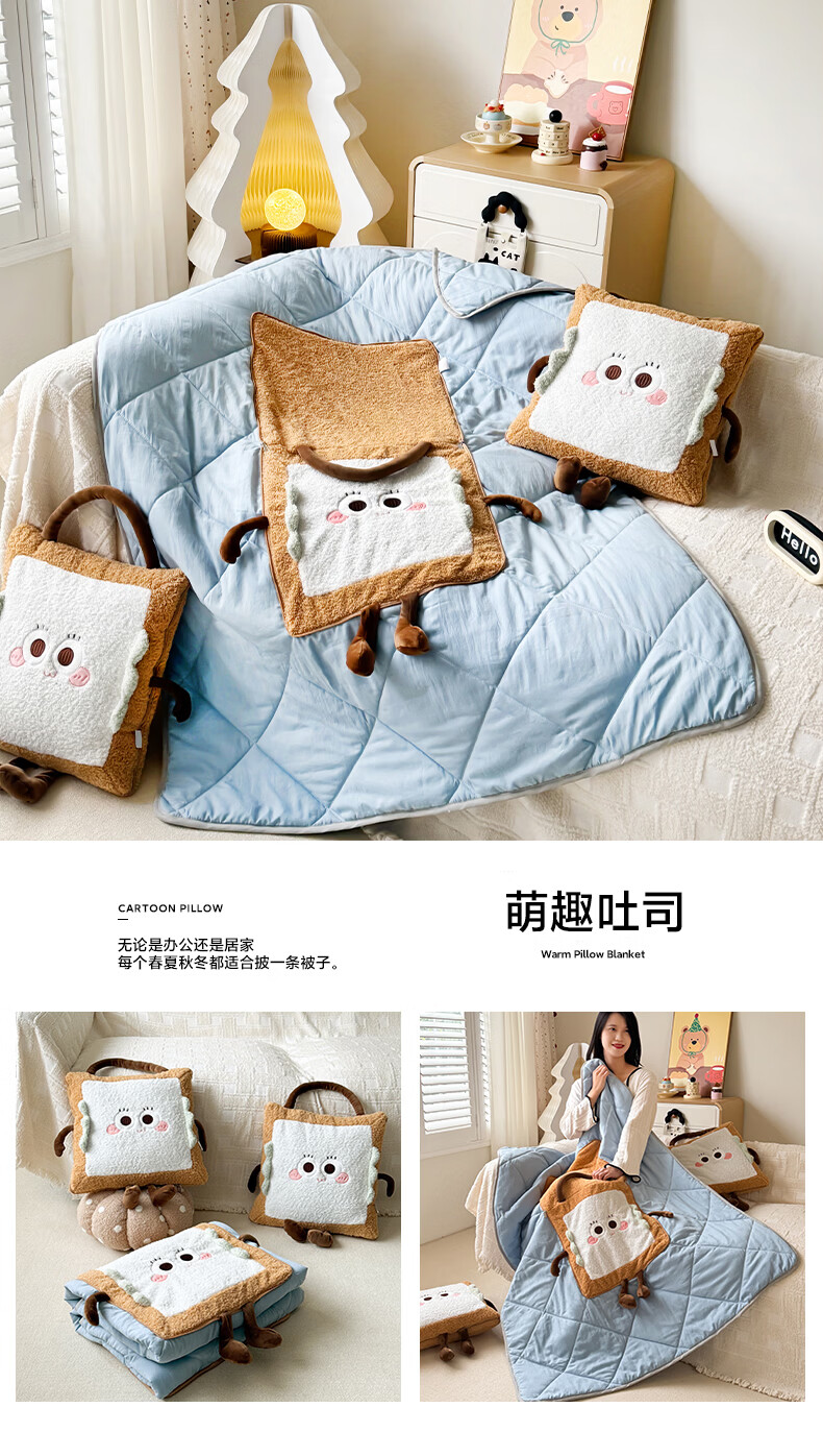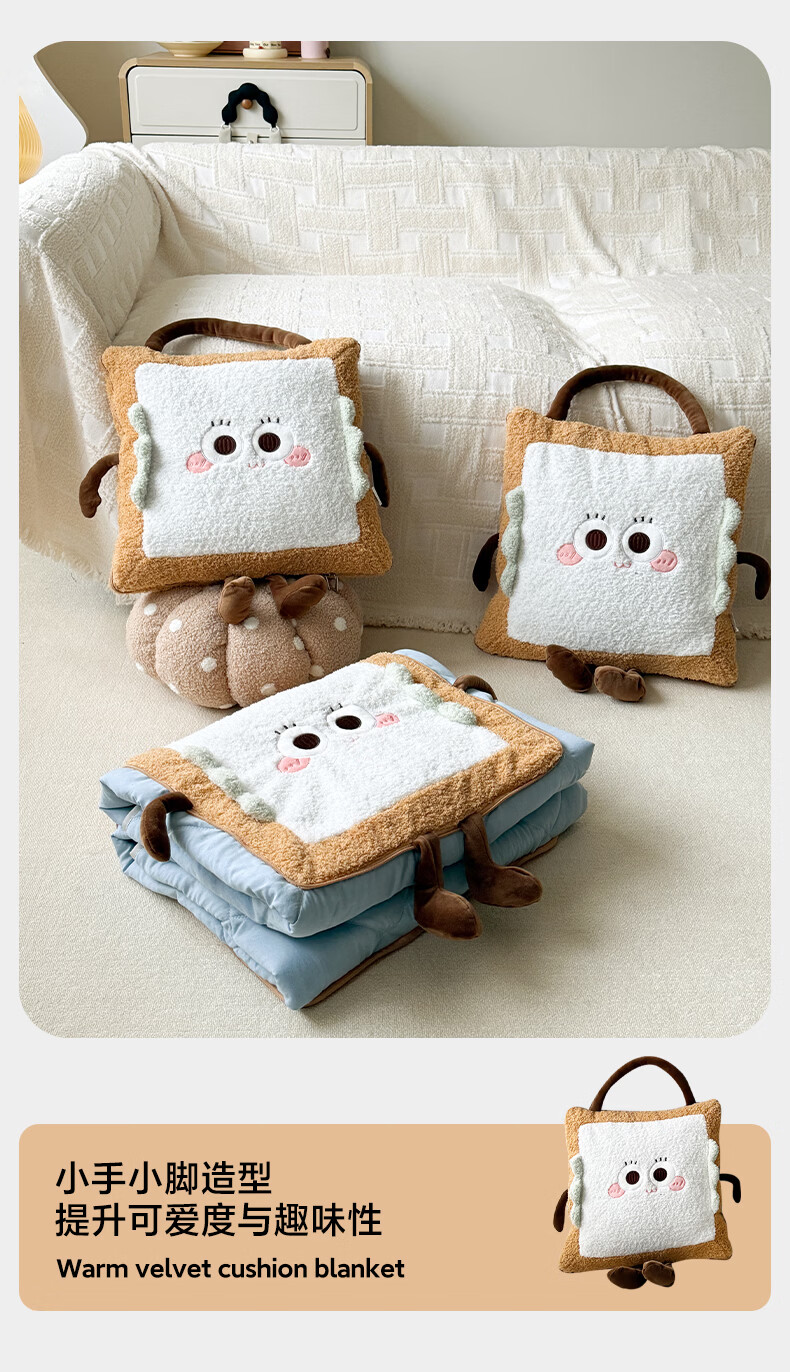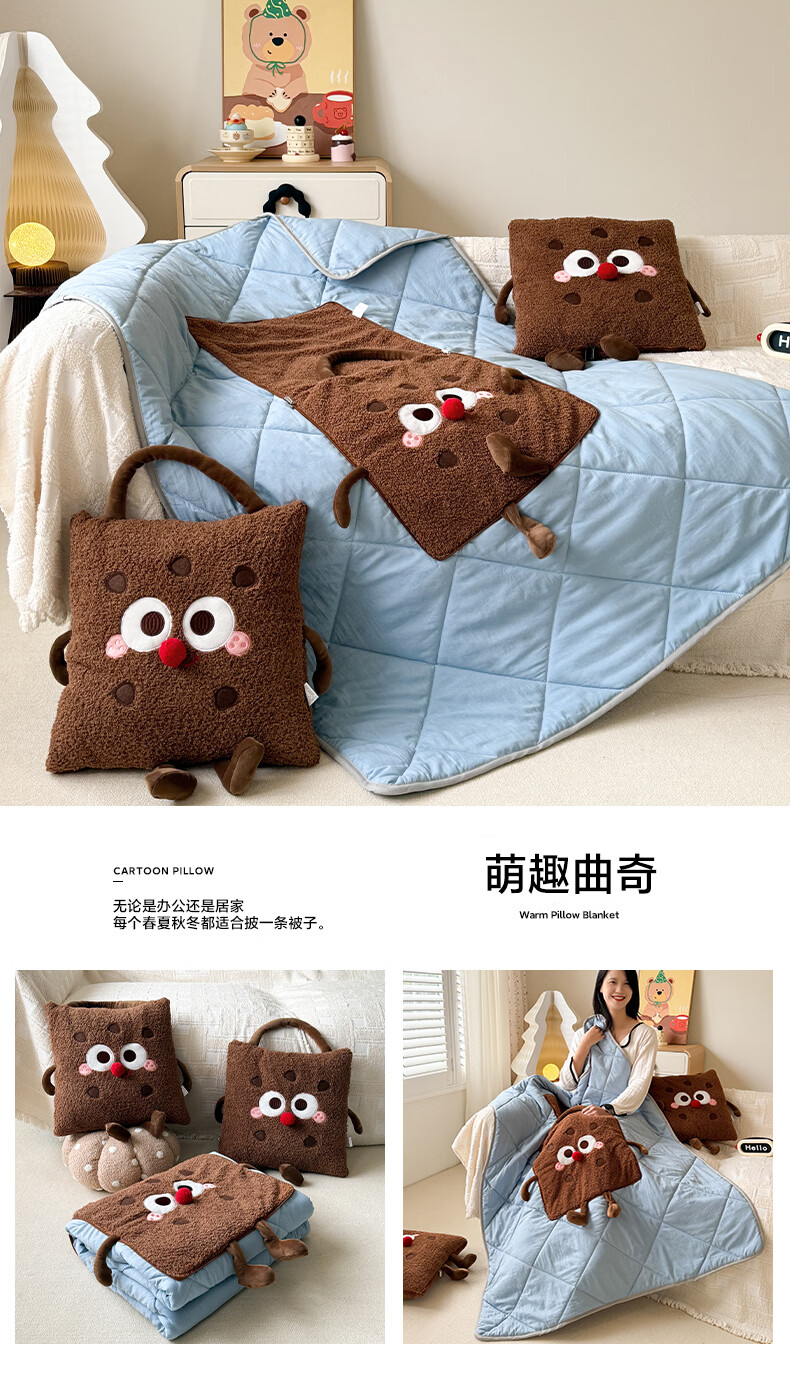 抱枕被设计,一枕多用,可做靠枕,打开可做被子;款式多多的选择,卡通形象;柔软弹力绒面料,不刺激皮肤;软硬适中