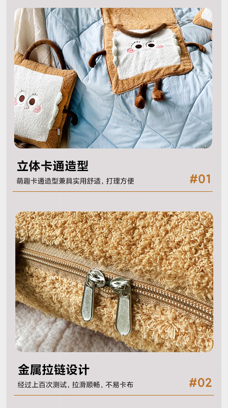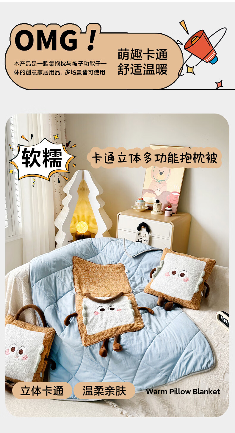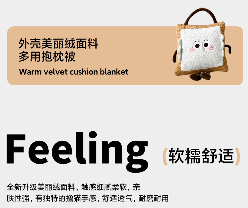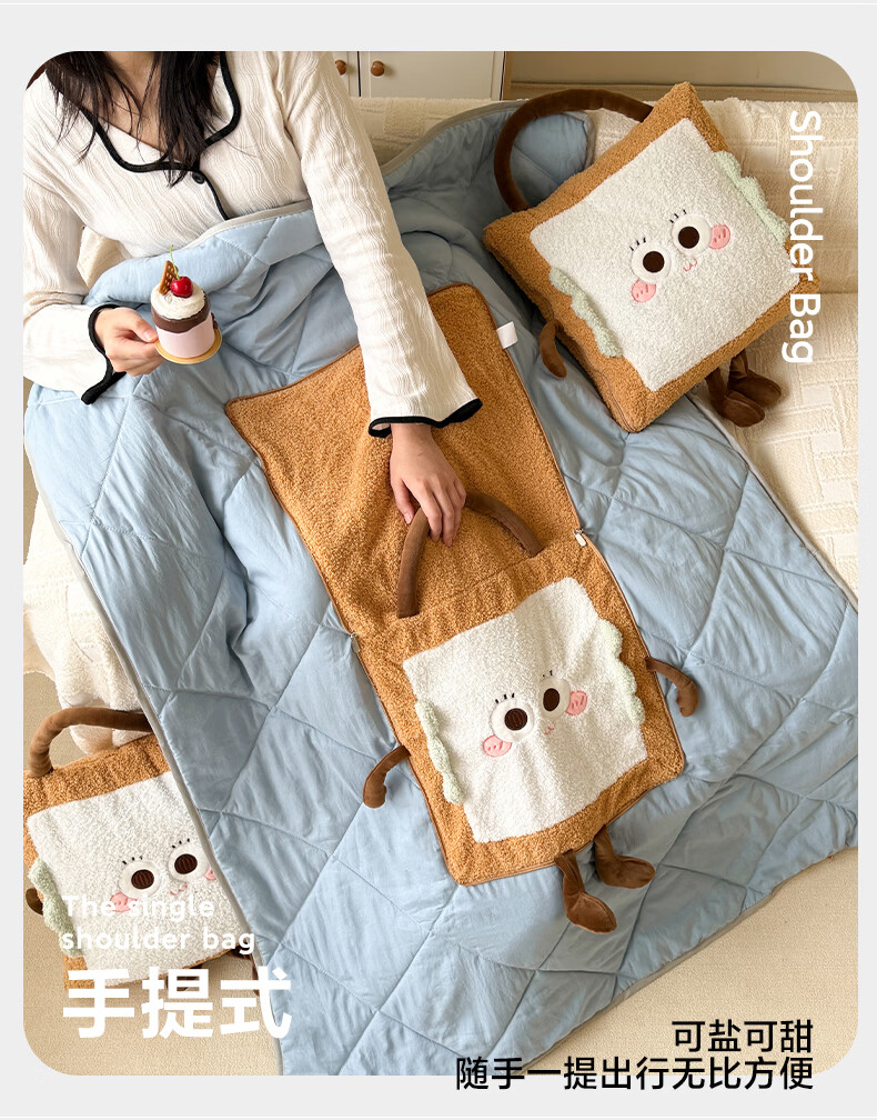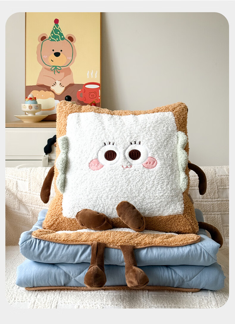 抱枕被设计,一枕多用,可做靠枕,打开可做被子;款式多多的选择,卡通形象;柔软弹力绒面料,不刺激皮肤;软硬适中