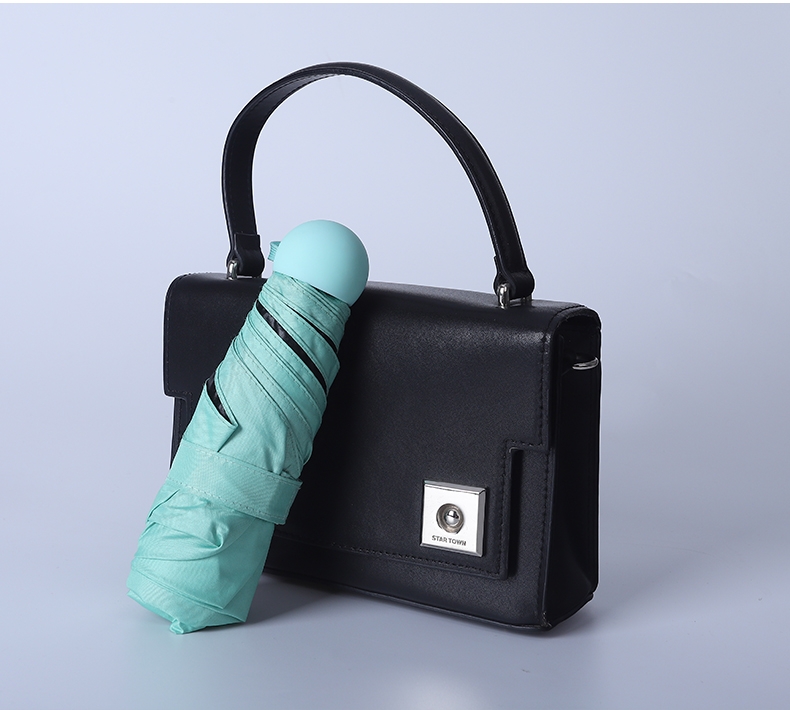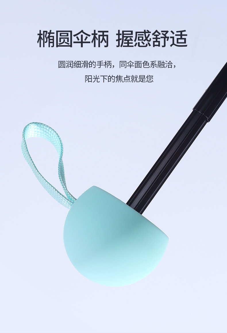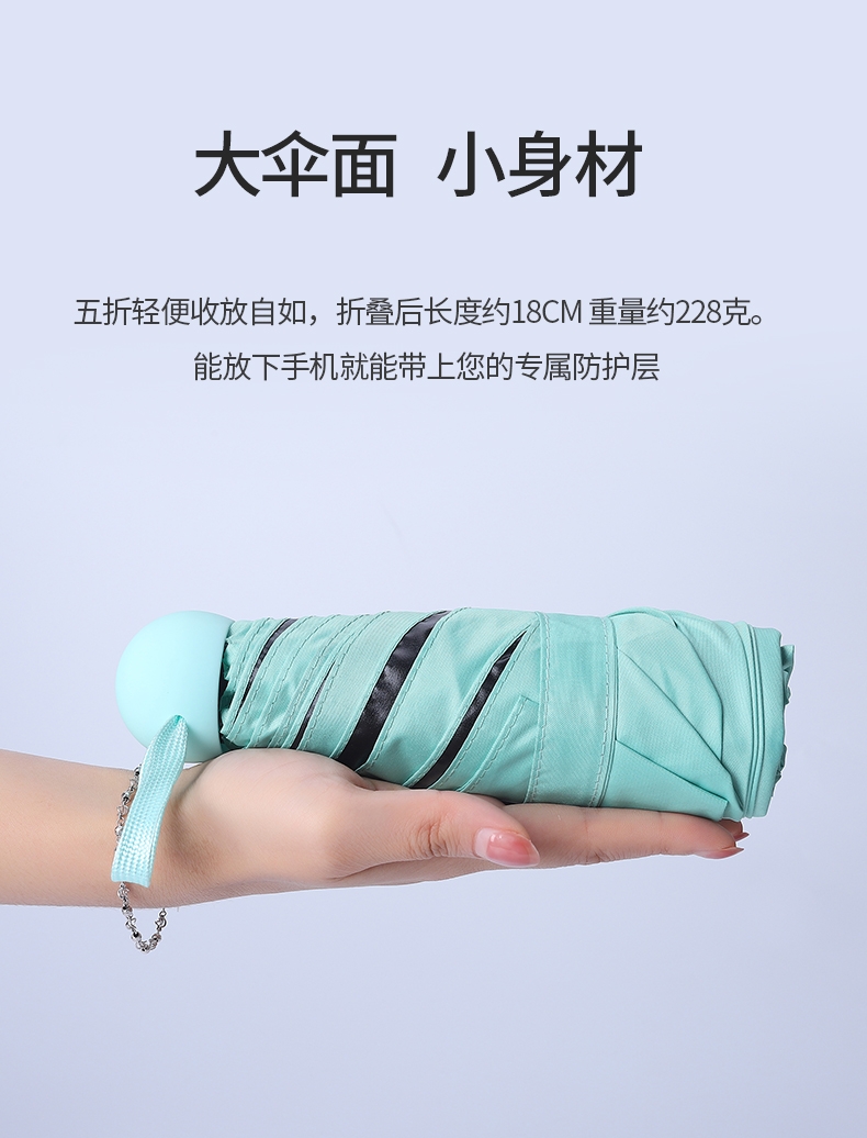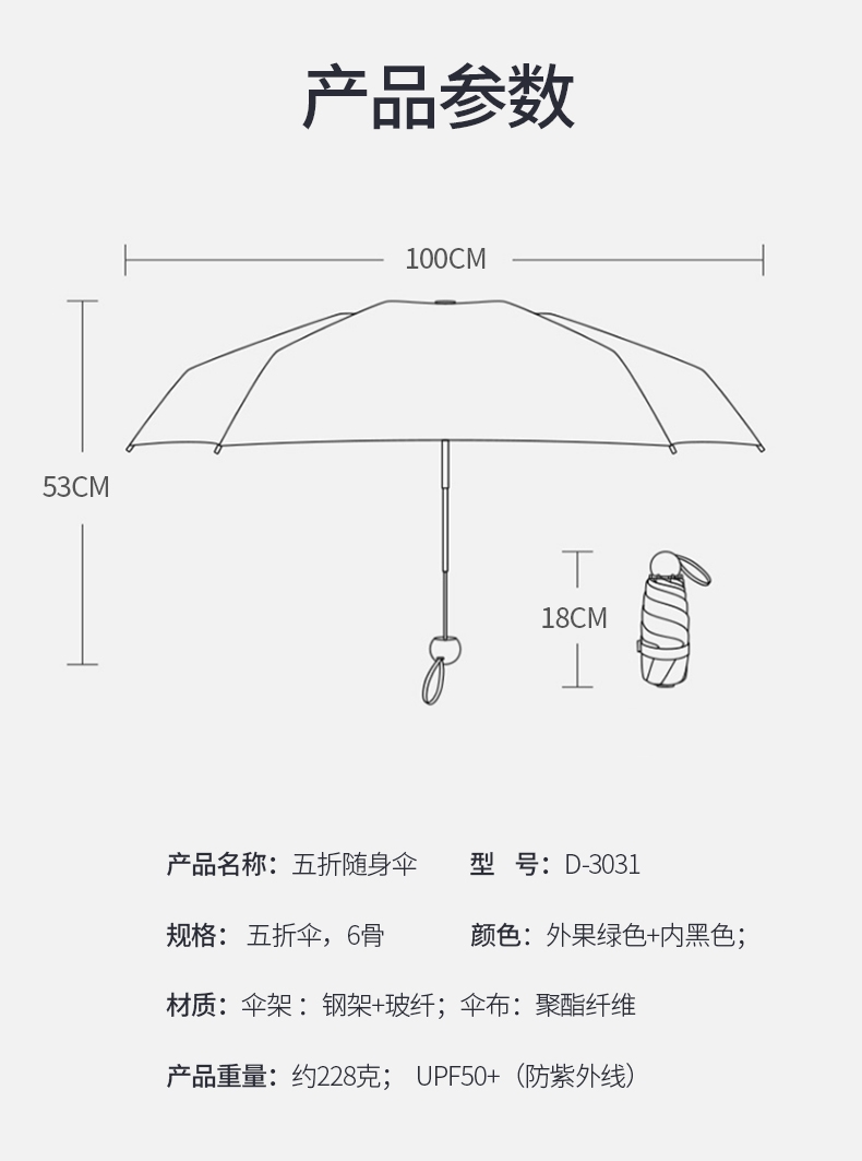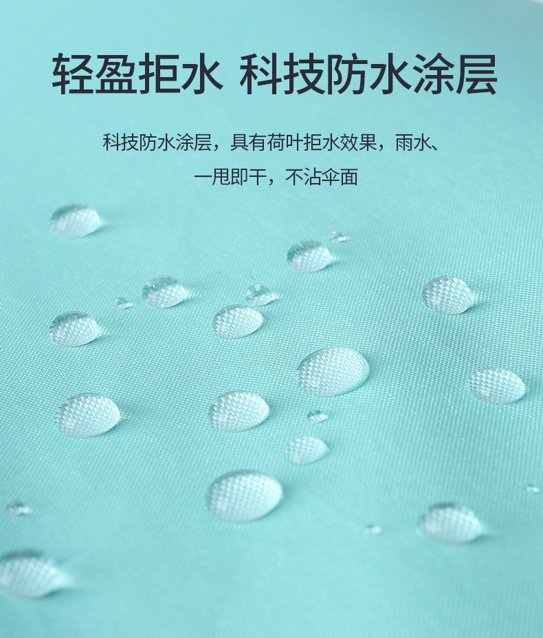 大伞面,小身材,轻重量;独特工体美学设计,雨伞外层果绿色,内配黑胶;圆润细滑的手柄