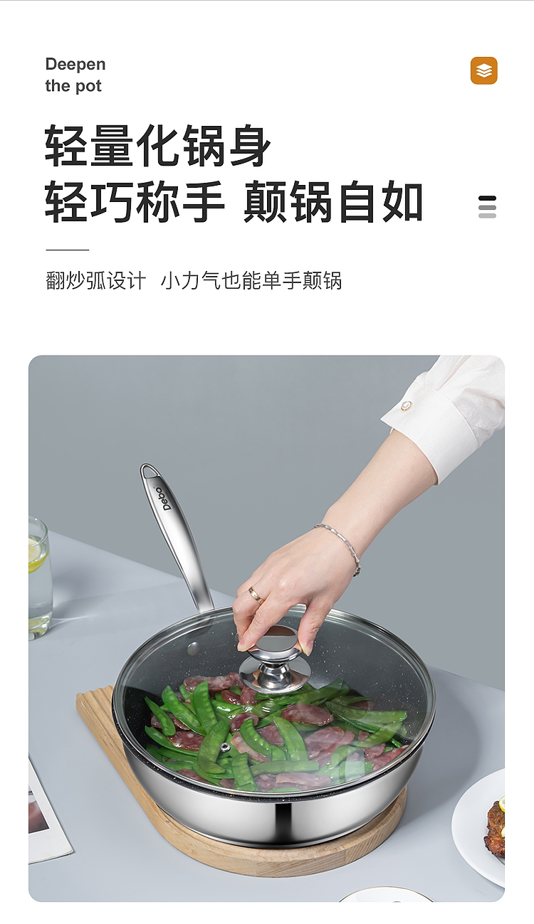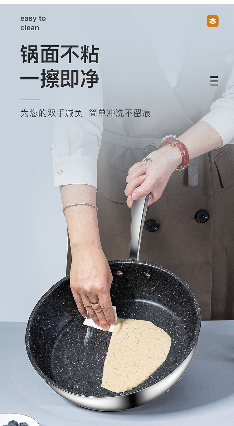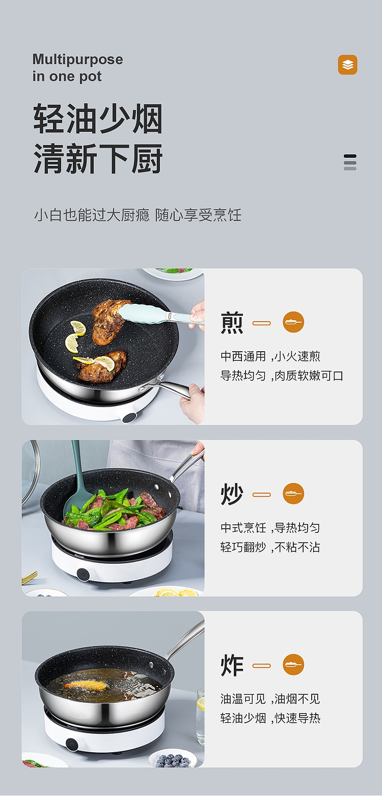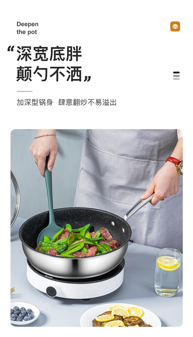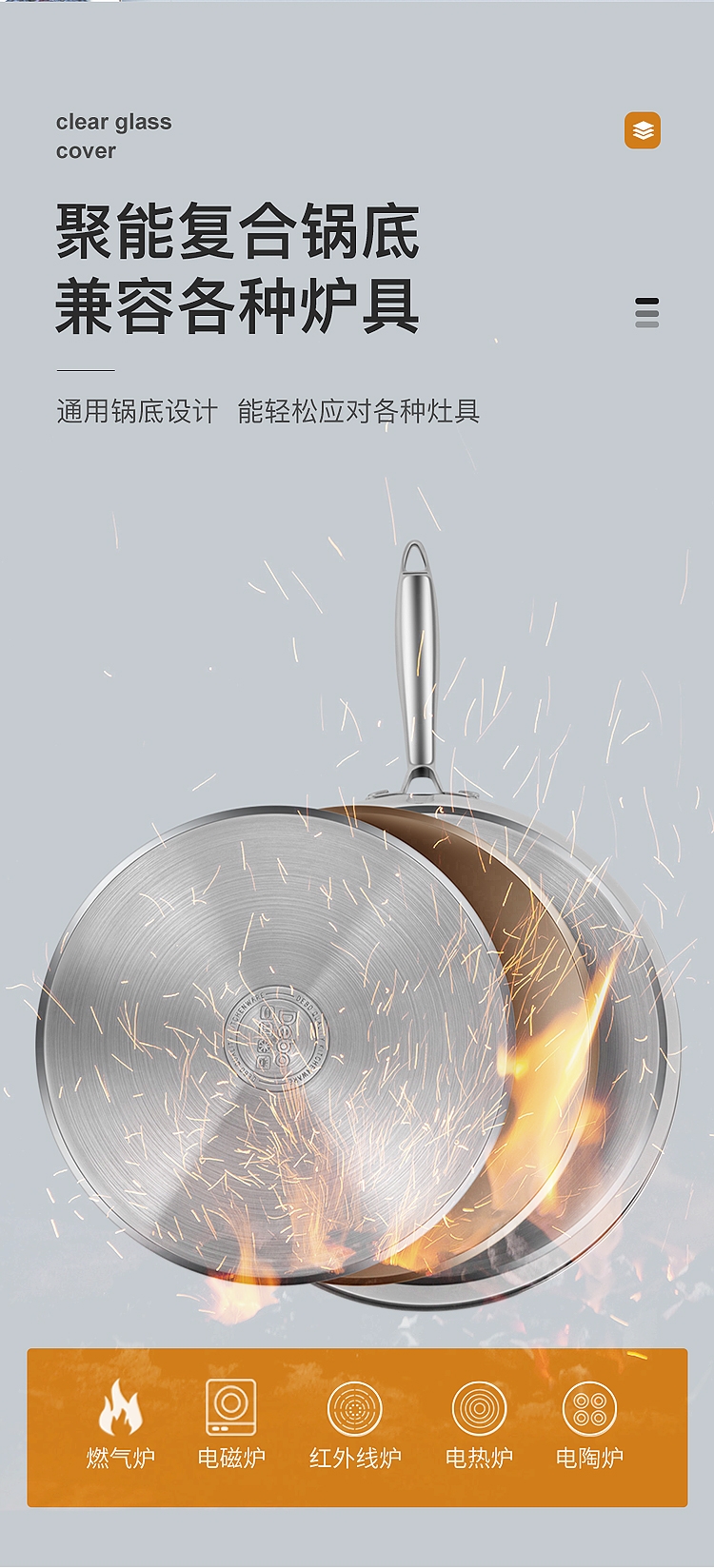 304不锈钢基材,一体锅型,聚能快速热;深锅型,大容量,巧烹饪,翻炒从容;磁通复合大平底,轻松煎制美味,炉灶通用