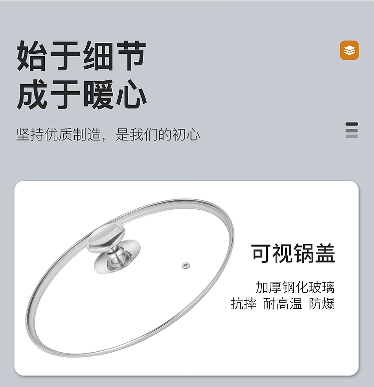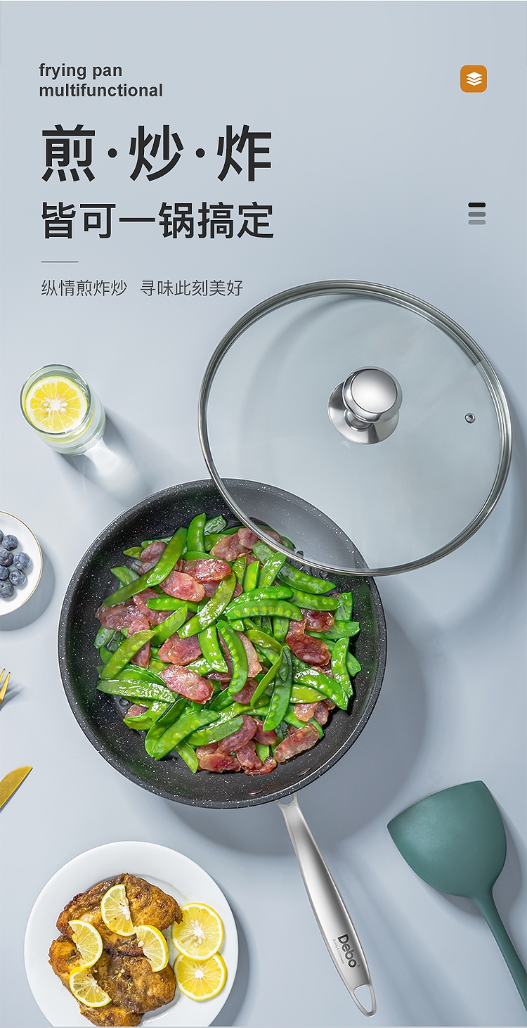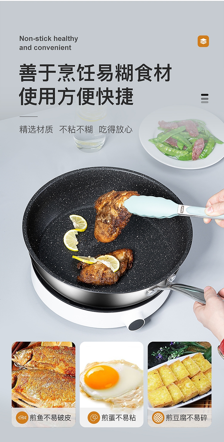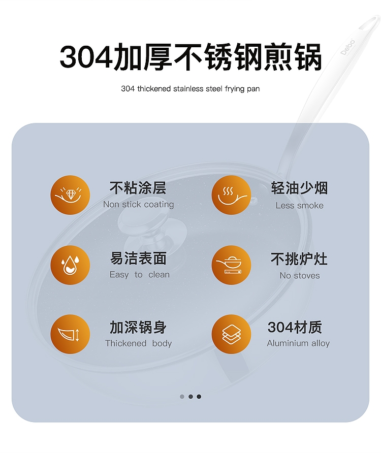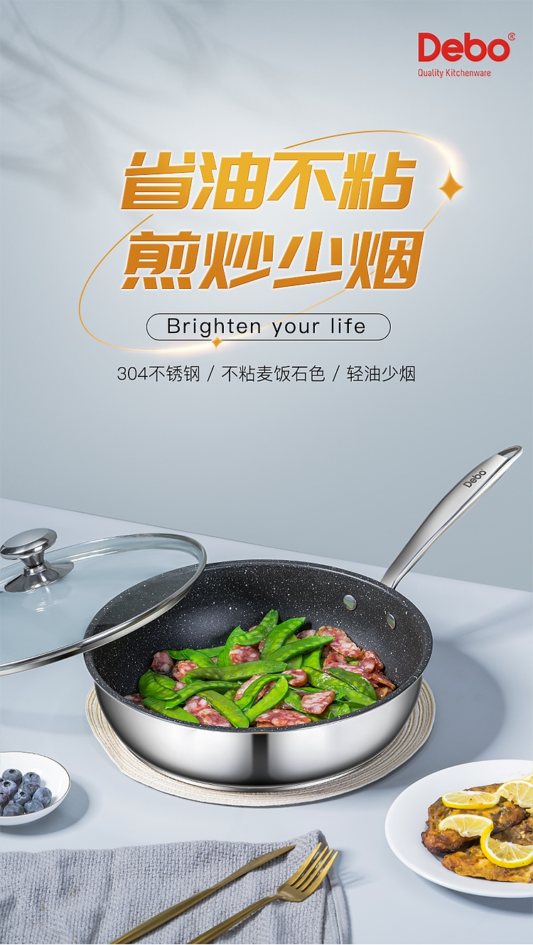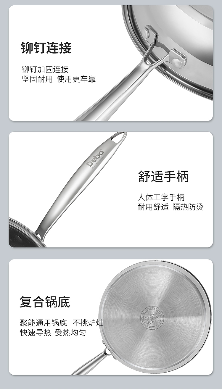 304不锈钢基材,一体锅型,聚能快速热;深锅型,大容量,巧烹饪,翻炒从容;磁通复合大平底,轻松煎制美味,炉灶通用