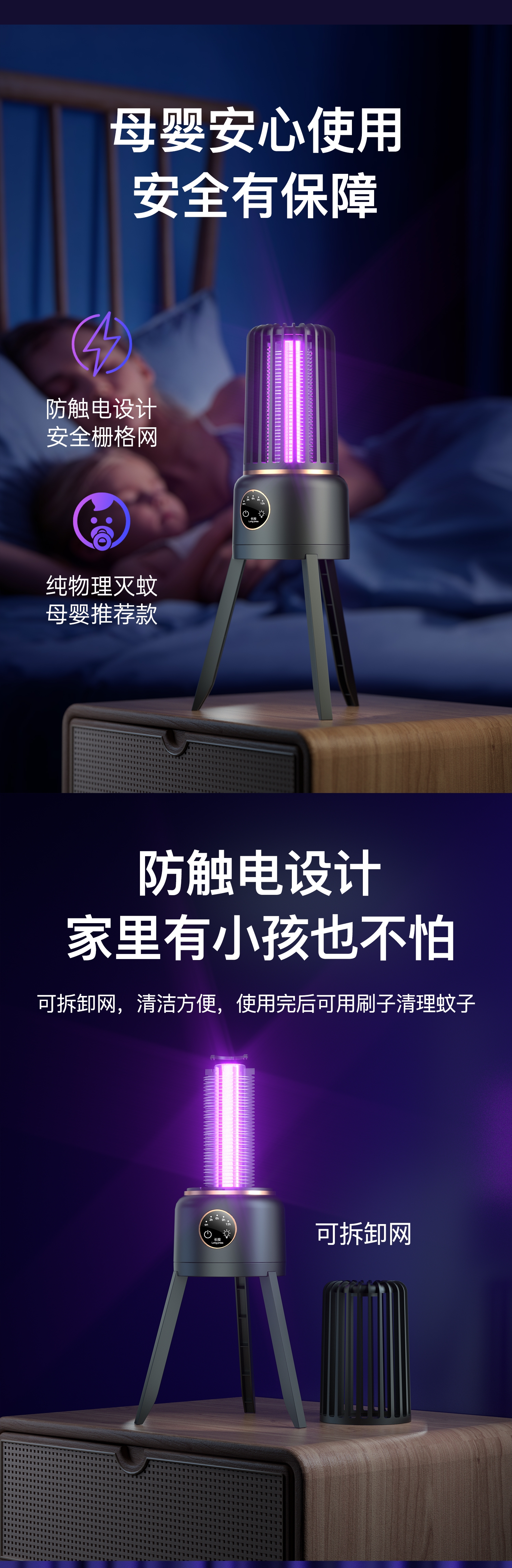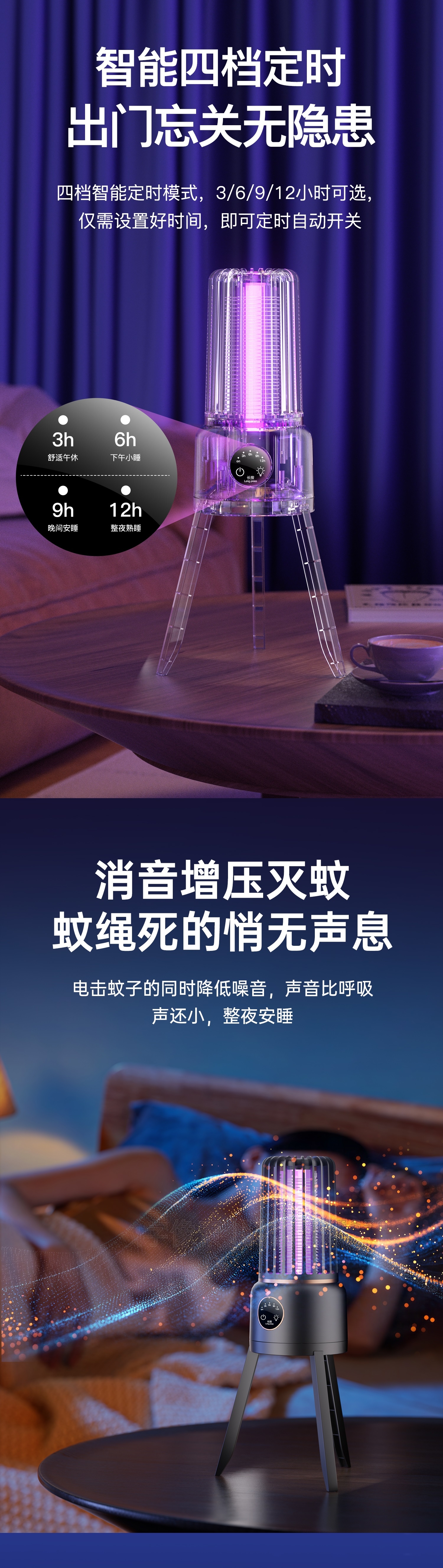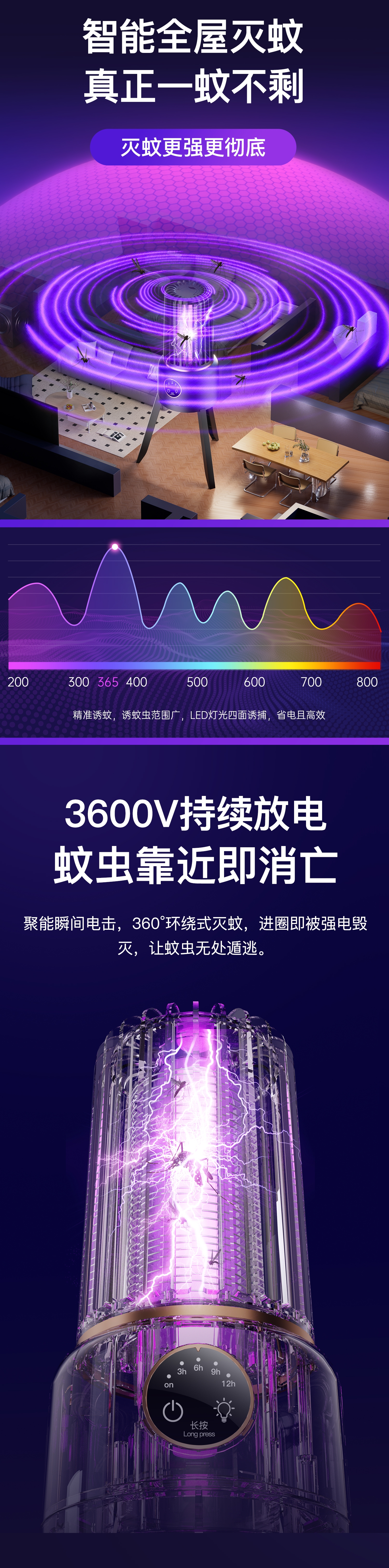 防触电设计;智能四档定时;消音增压灭蚊